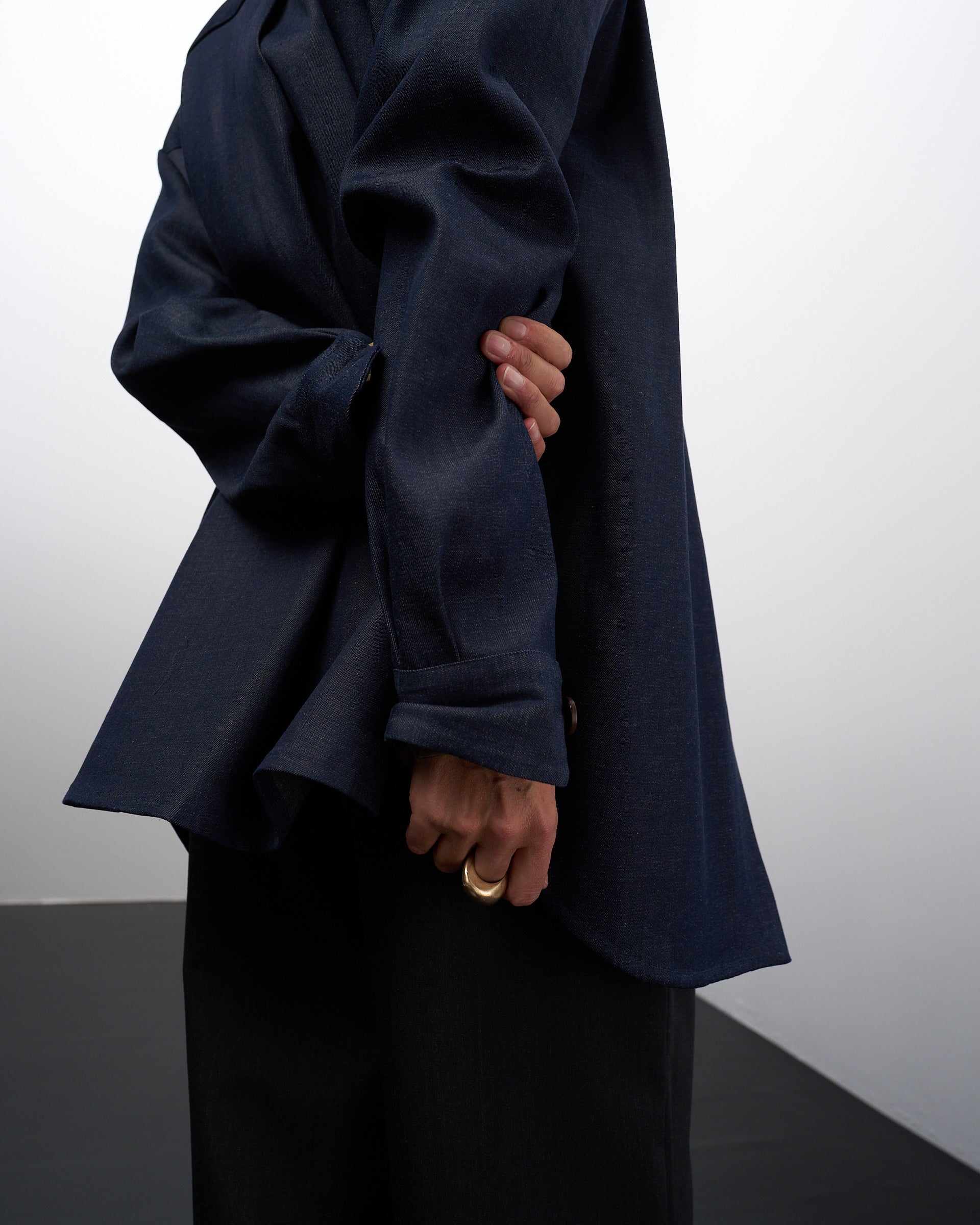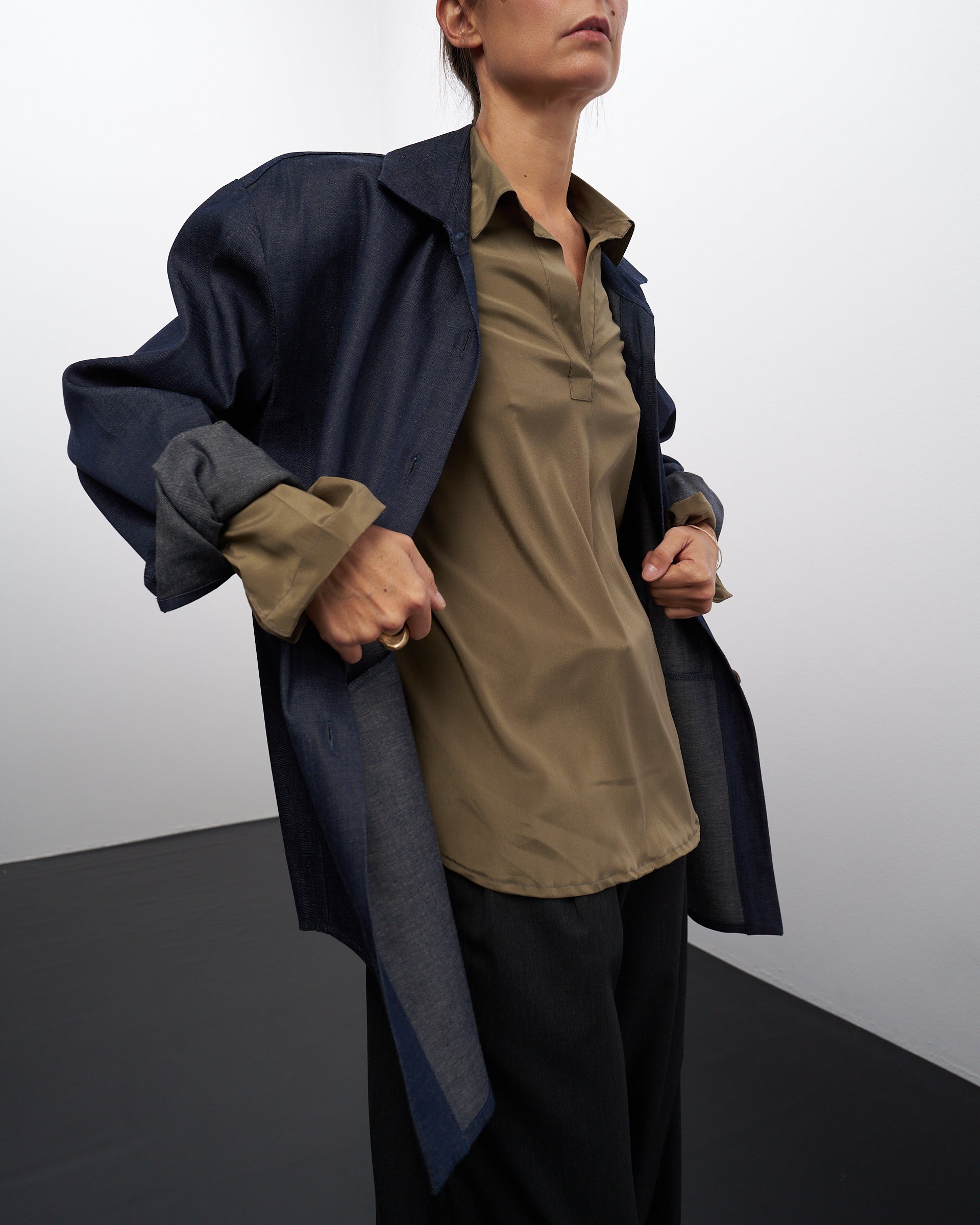 La giacca Kyoko è un pratica over shirt che diventa una bellissima giacca di peso medio, un'ottima alternativa al giubbino per la mezza stagione, perfetta anche come primo strato sotto un capo spalla in inverno, o in estate per le serate più fresche.