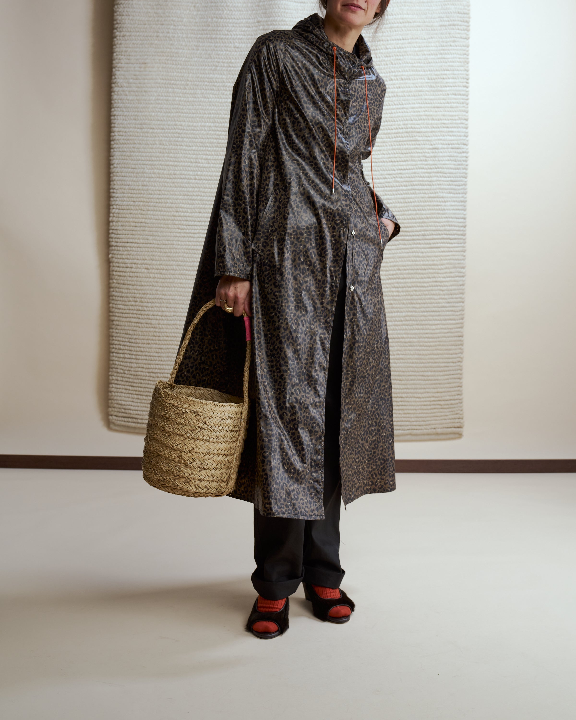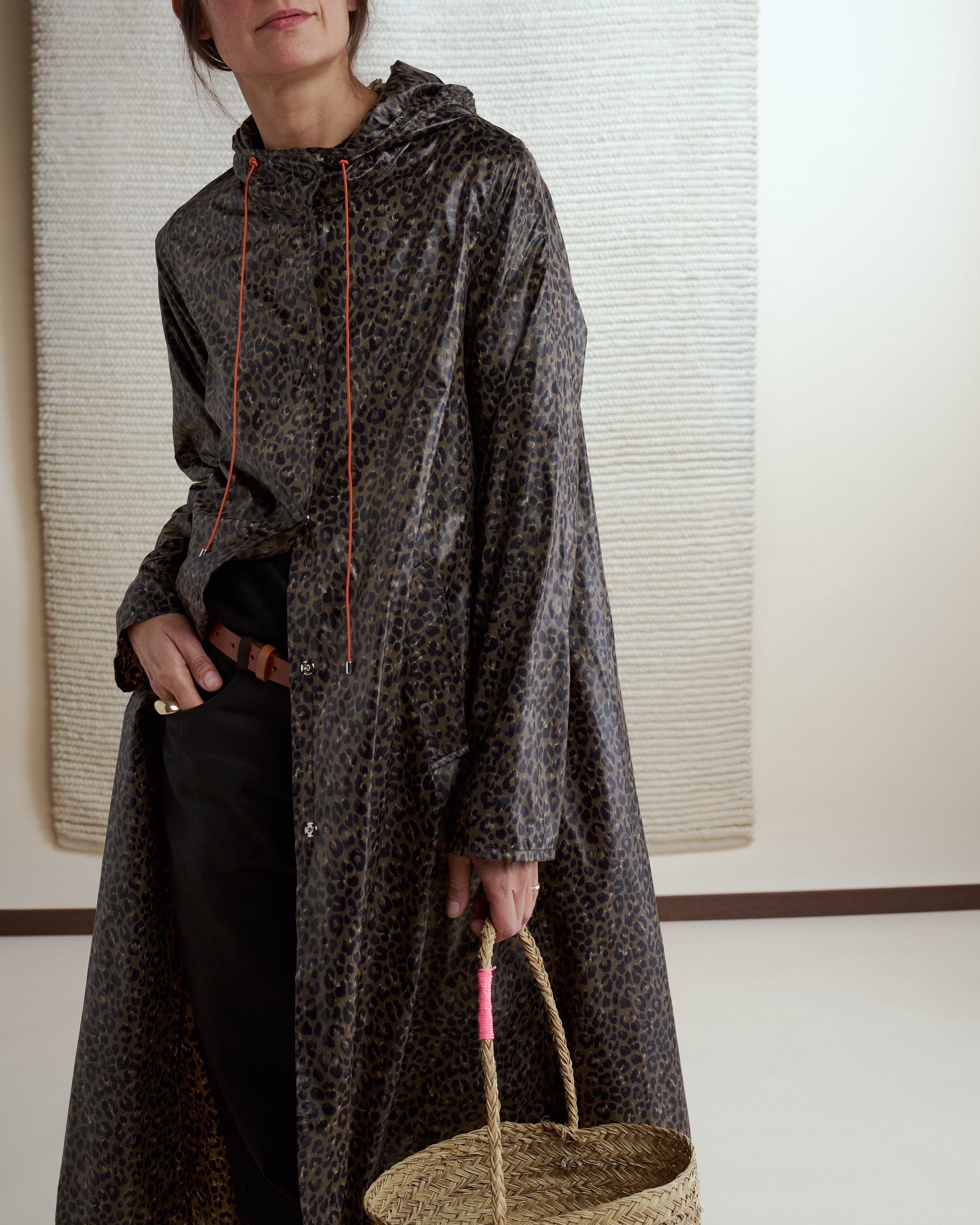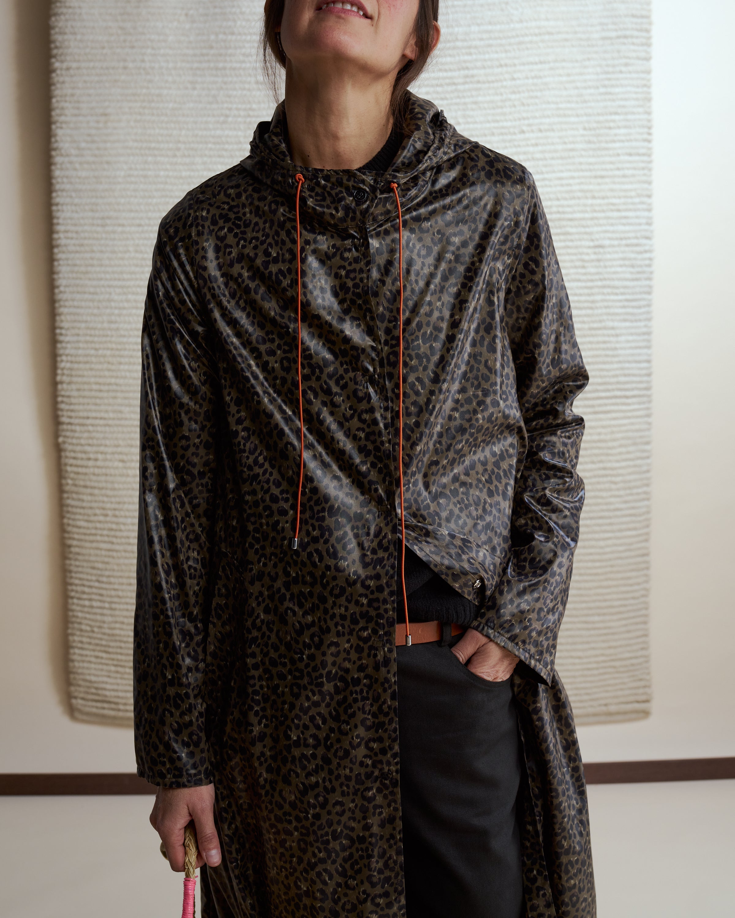 Steve è un impermeabile lungo, con ampio spacco sul retro, allacciato sul davanti e con un cappuccio ampio, chiuso da una coulisse, ma la vera chicca è una tasca sul retro che diventa una pochette dove ripiegare il capo per metterlo comodamente in borsa.