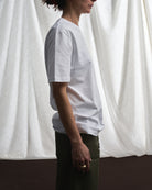 Maniche a giro, fettuccia di rinforzo sull'interno del collo, doppia impuntura larga su fondo manica e bordi inferiori, girocollo a costine.