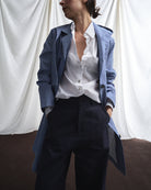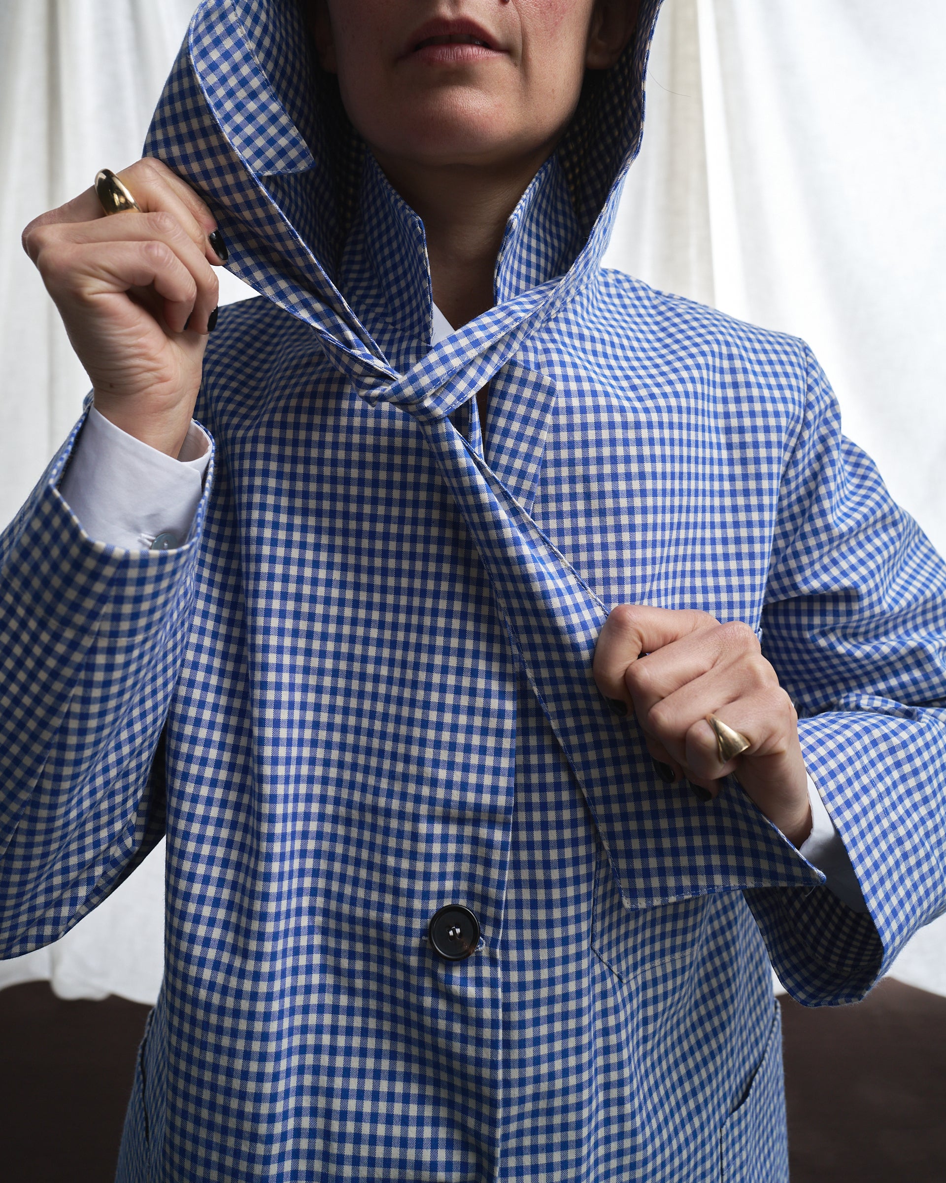 Quì presentato in tessuti piuttosto sostenuti, tutti cotoni di medio peso, che rendono il capo molto strutturato.