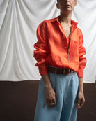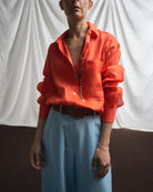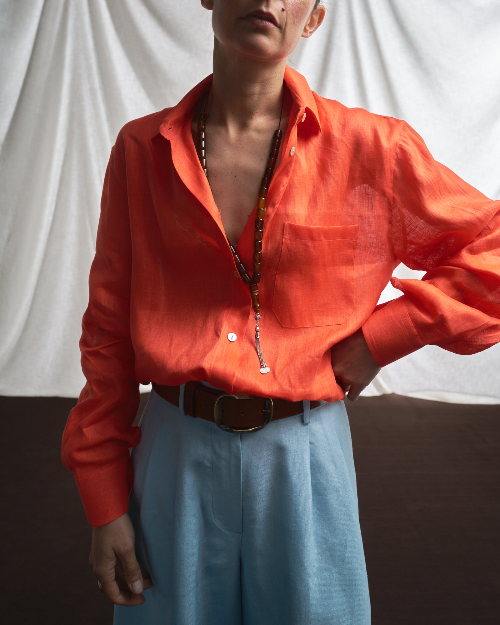 Una camicia classica e indispensabile, in lino, a maniche lunghe, con tasca applicata sul davanti e sfondo piega sul retro.