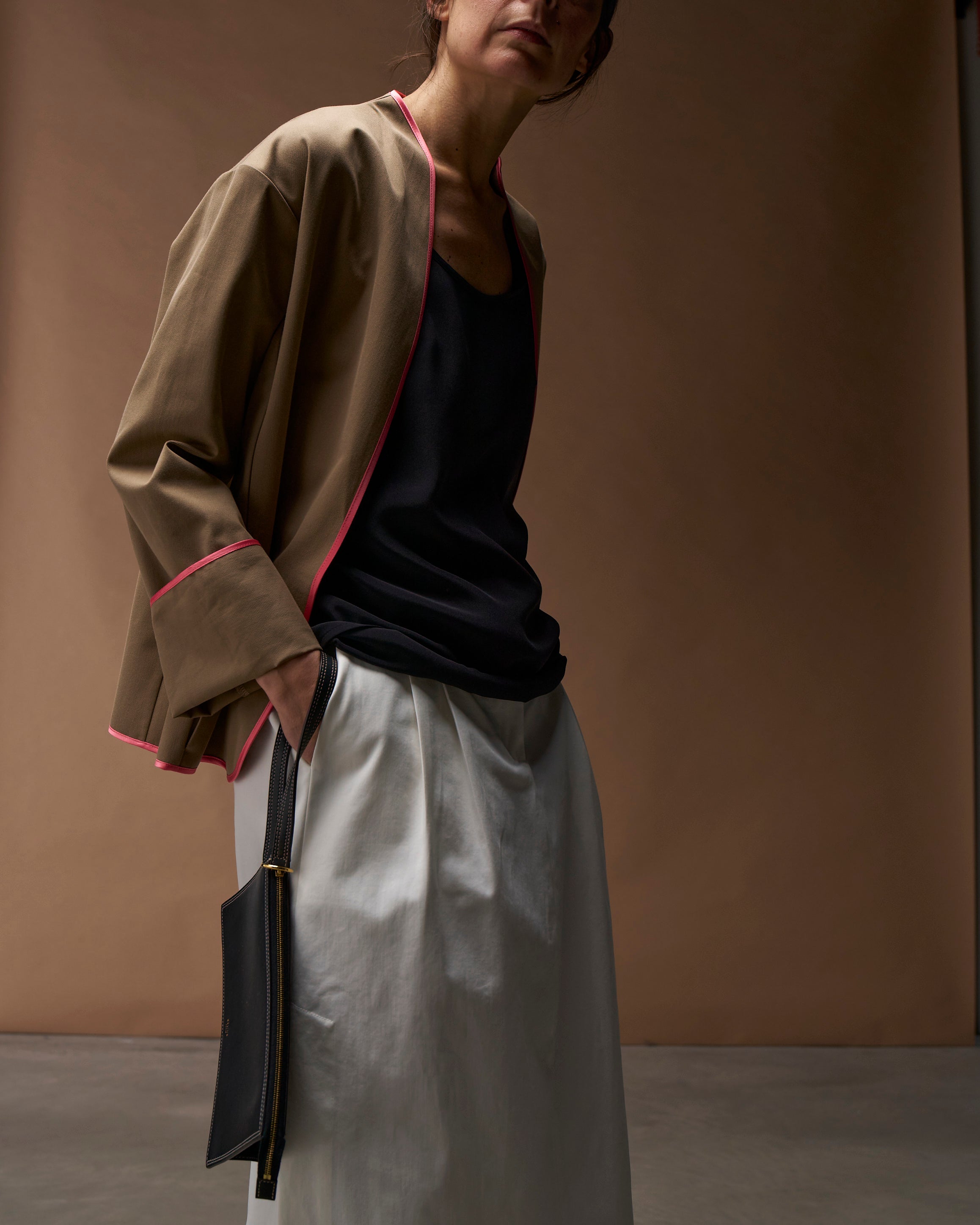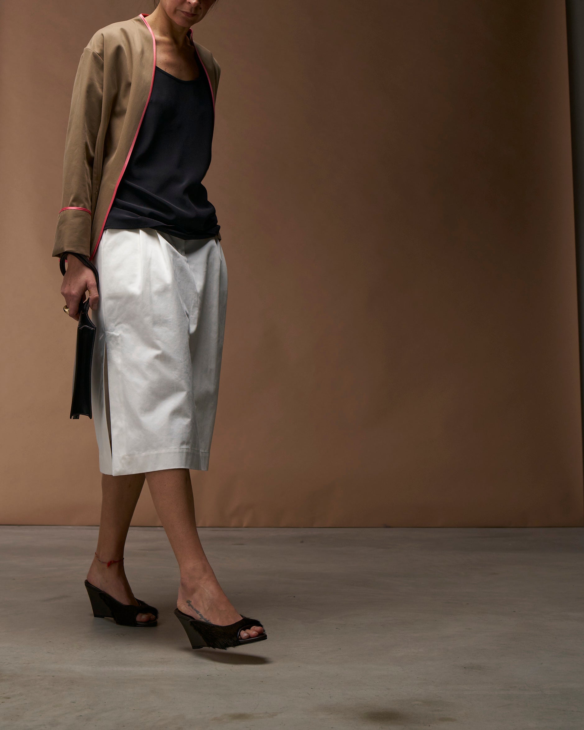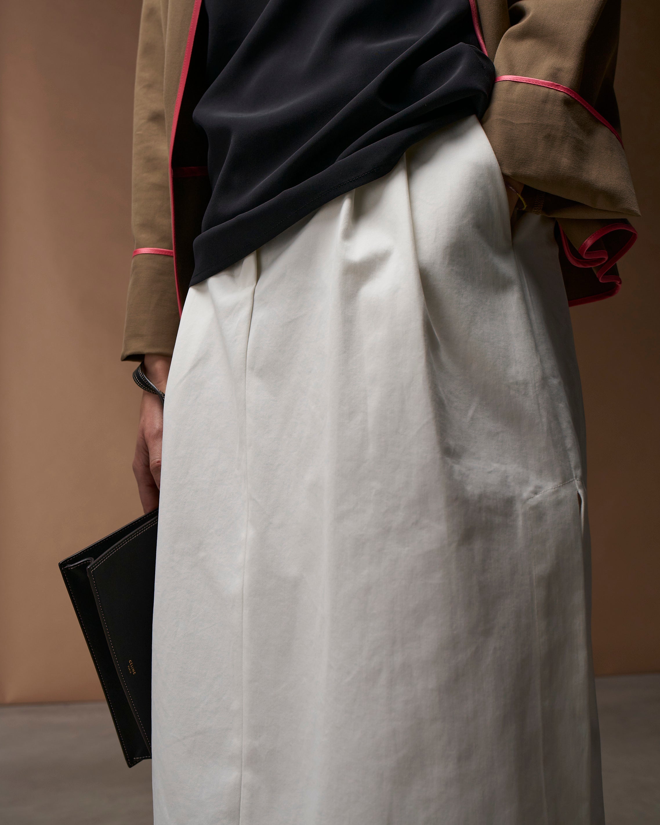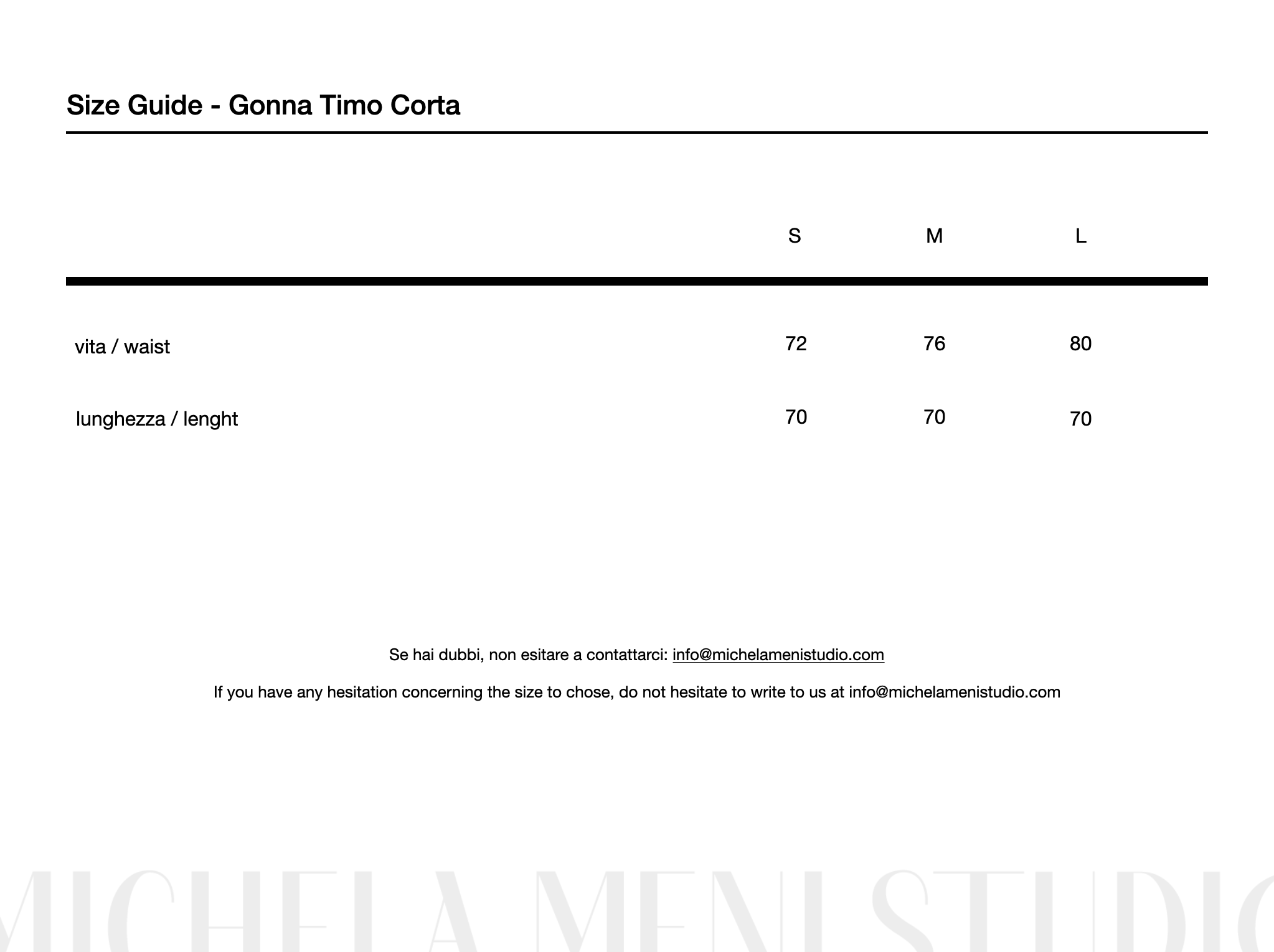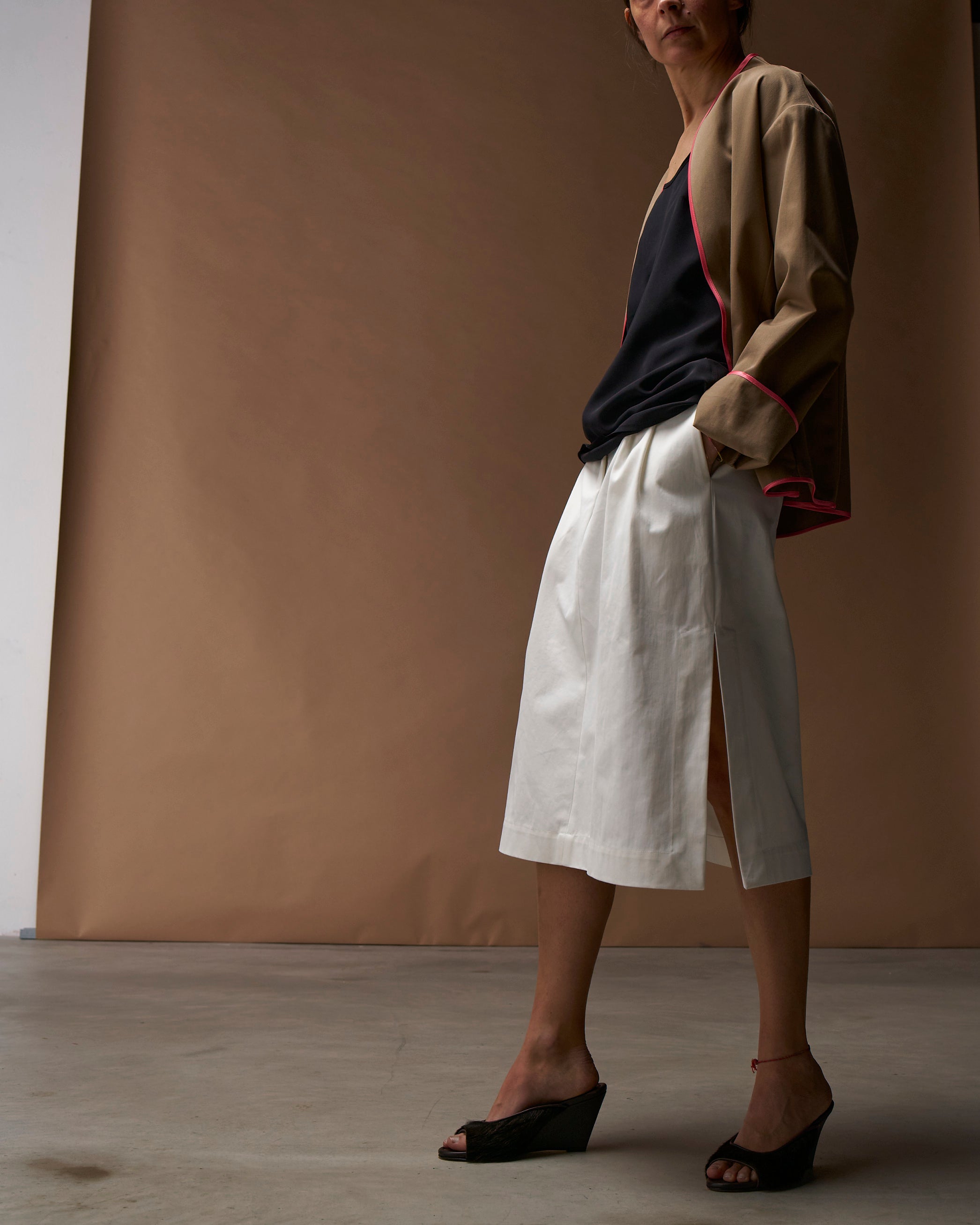 Una pencil skirt al ginocchio, strutturata come i nostri pantaloni Timo: tasche a filo sui fianchi, zip e bottone frontali, passanti alti 4,5 cm e cintura pre-formata come il più classico dei pantaloni da uomo.