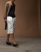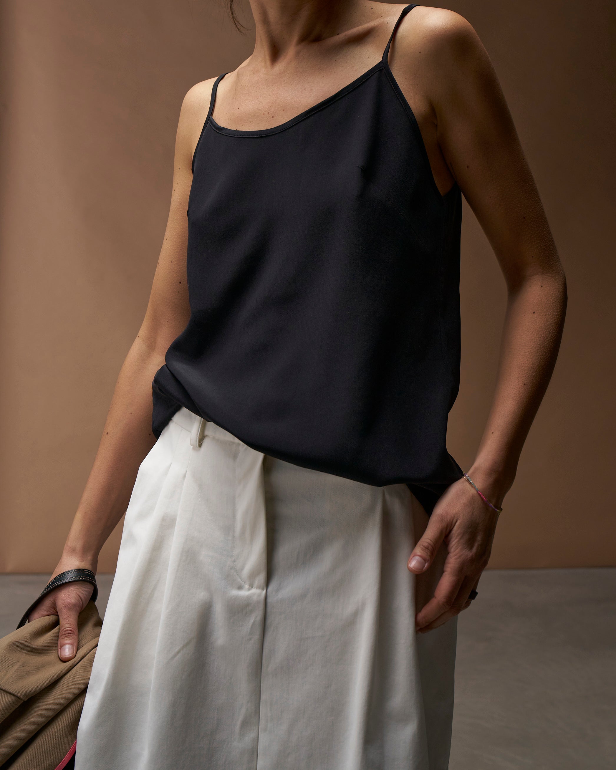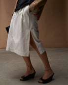 La sua linea, minimale e lineare, diventa iper femminile grazie ai due profondi spacchi sui lati. Può essere portata a vita alta ma anche appoggiata sui fianchi.