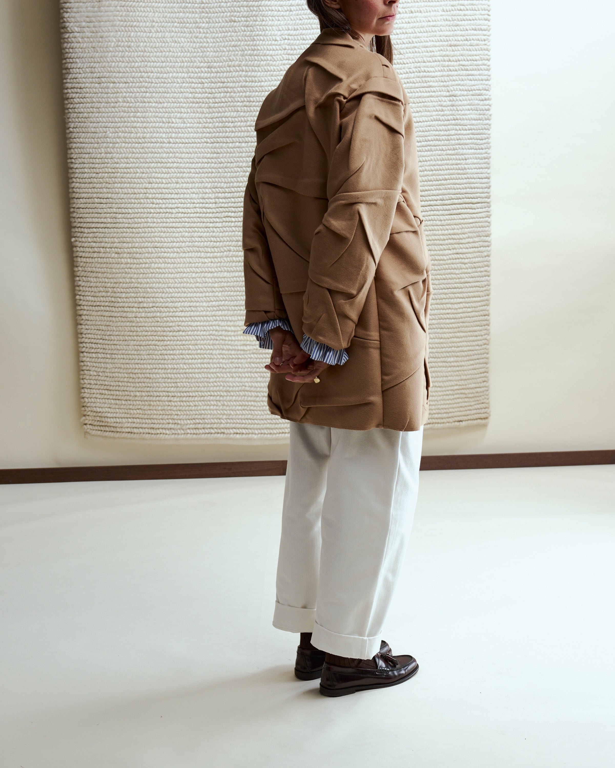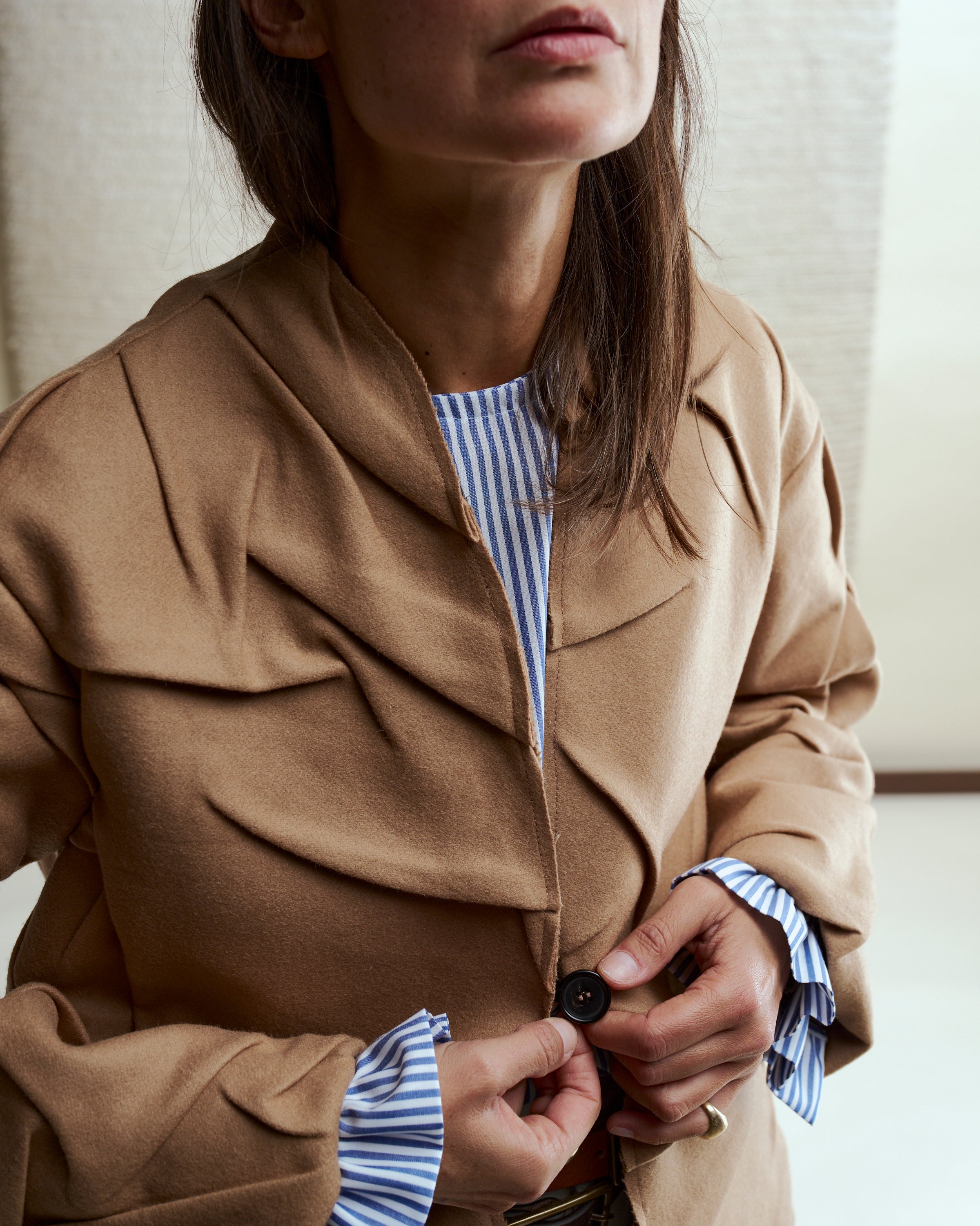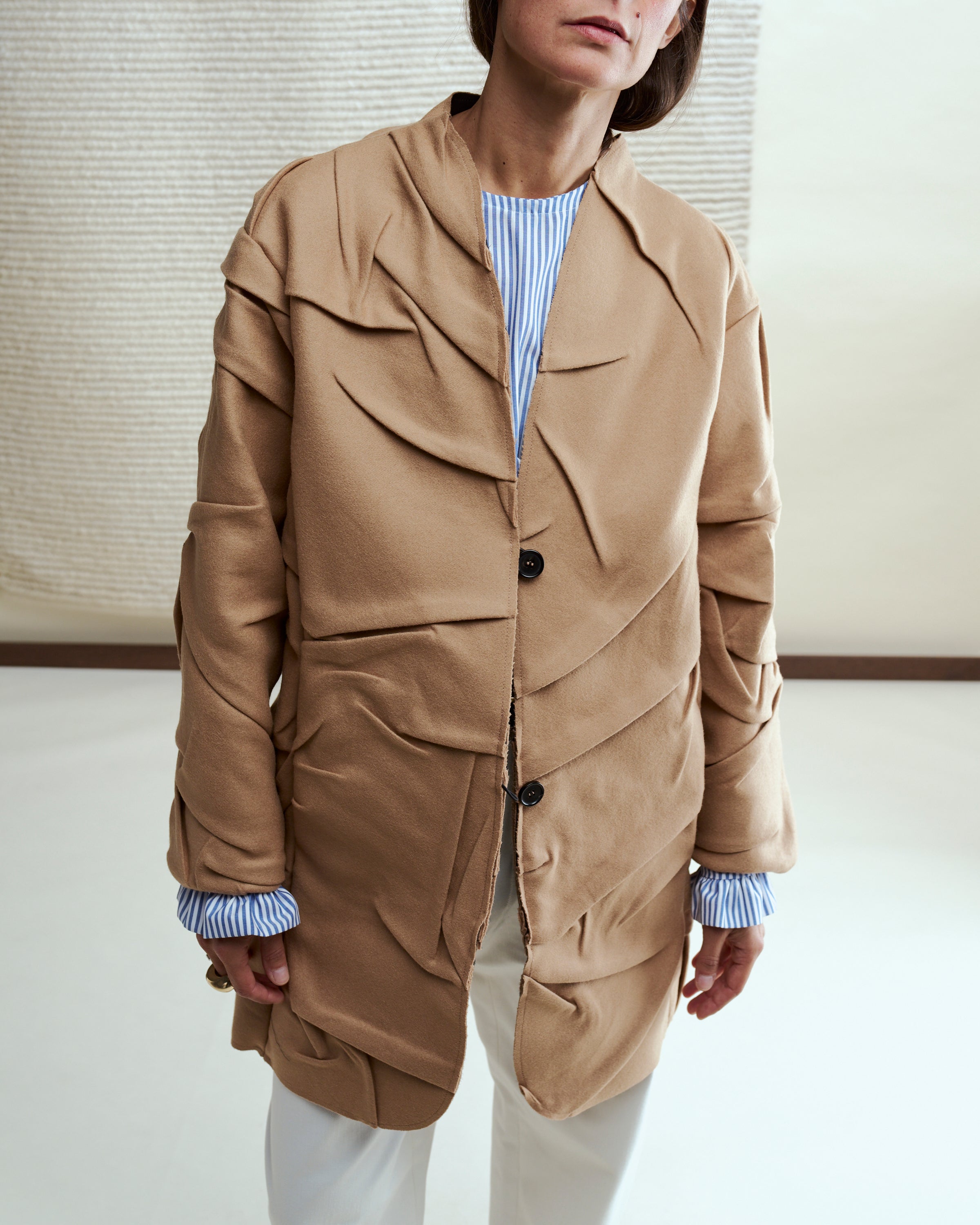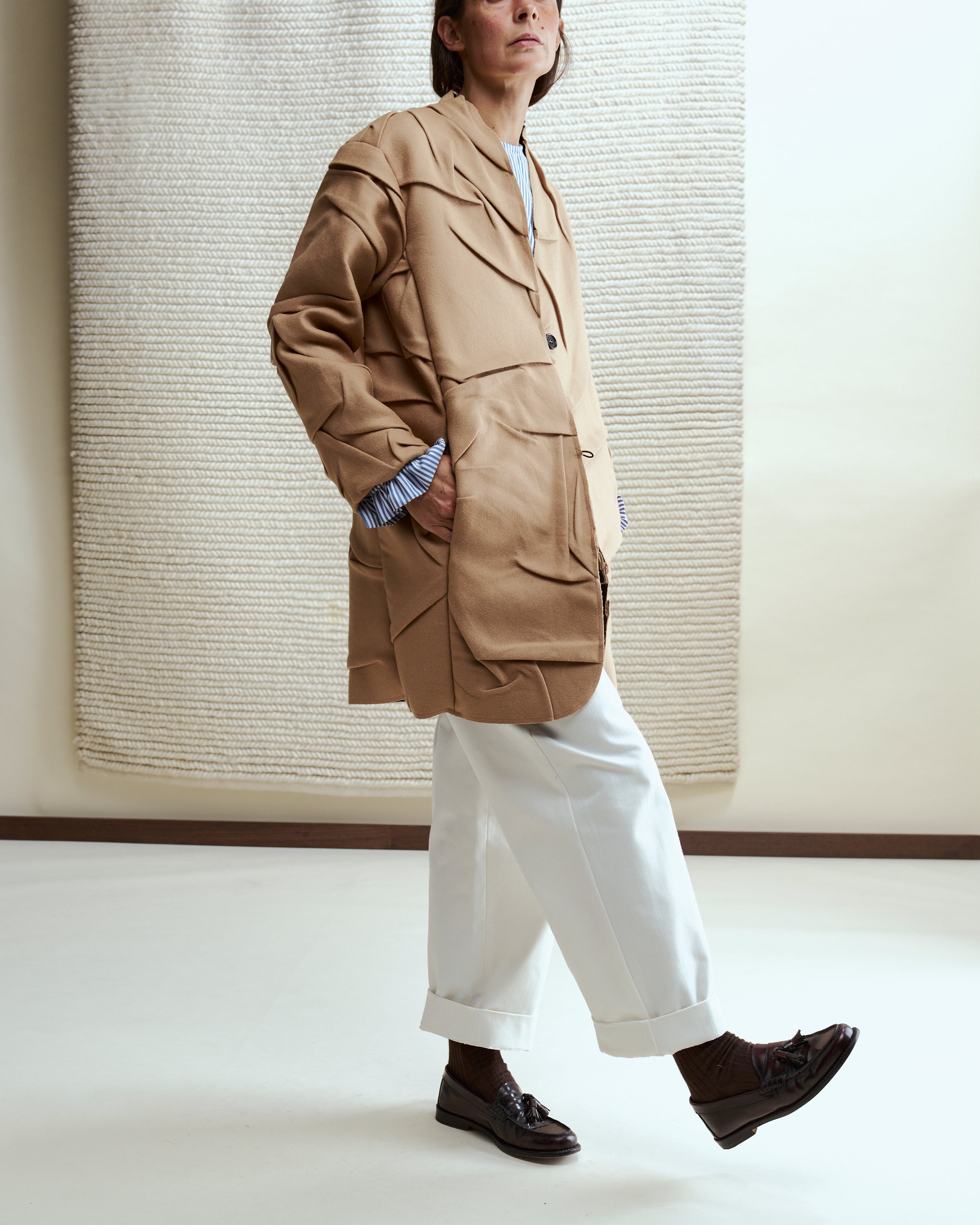 Questa versione, più lunga di 20 cm, ti accompagnerà per tutta la stagione autunnale, ma la particolare lavorazione a pieghe del tessuto di lana esterno e del rivestimento interno,  sono ideali anche per la stagione fredda.