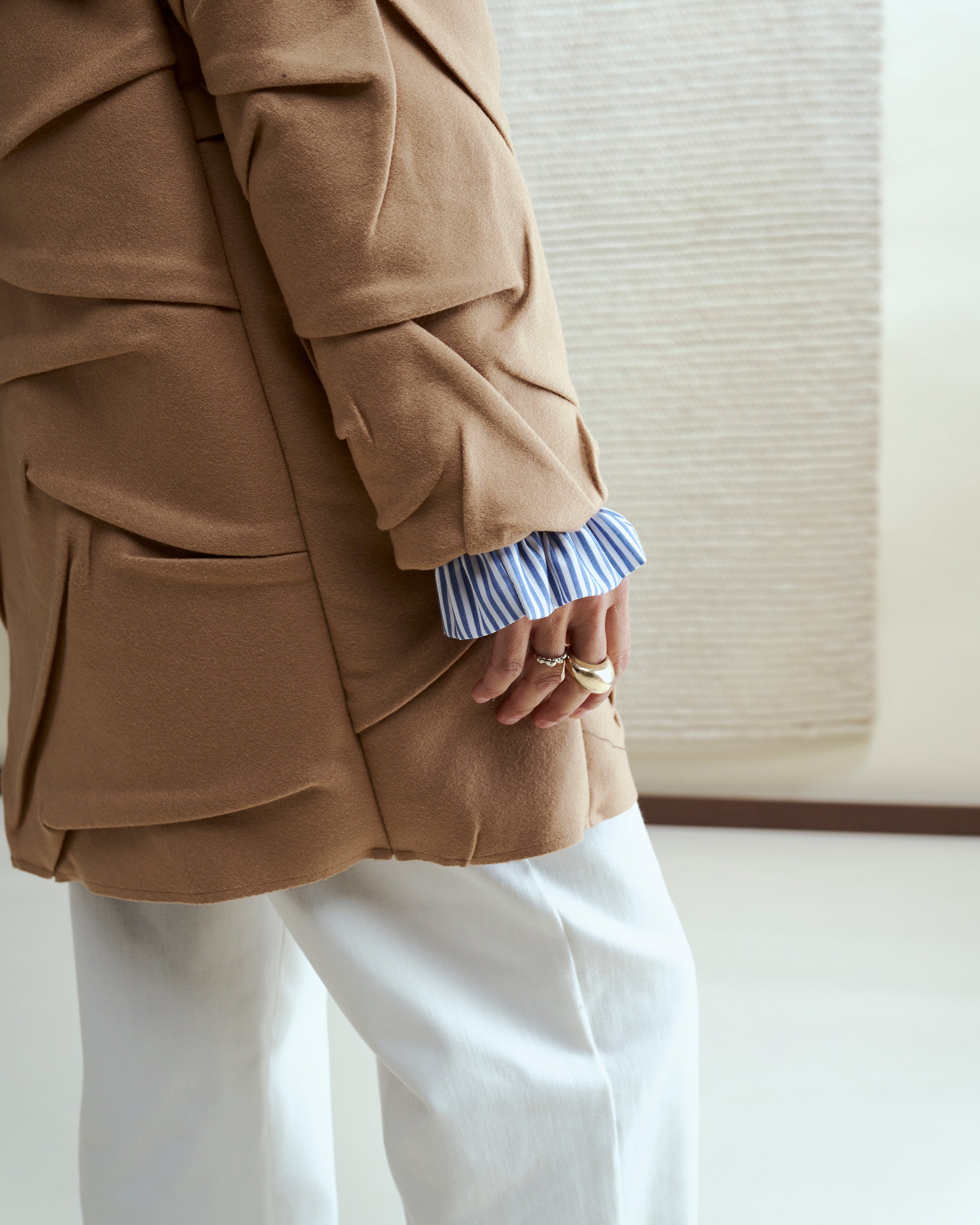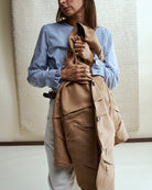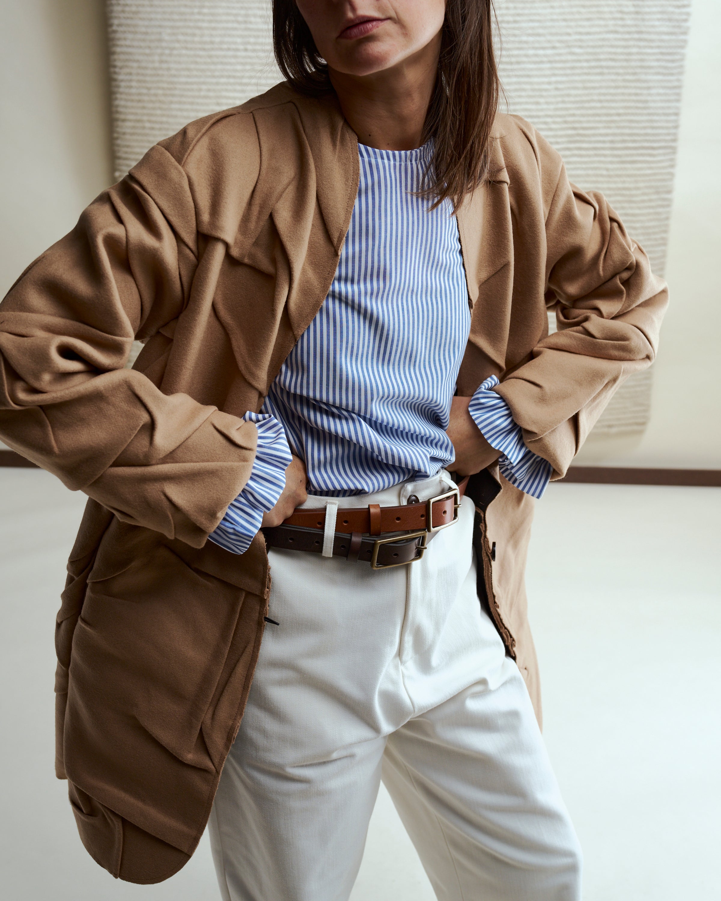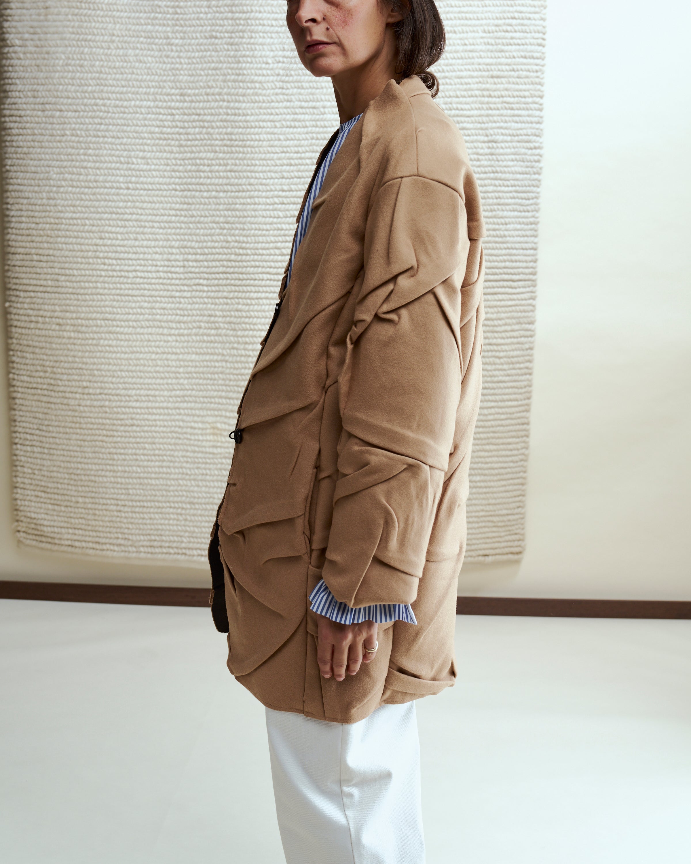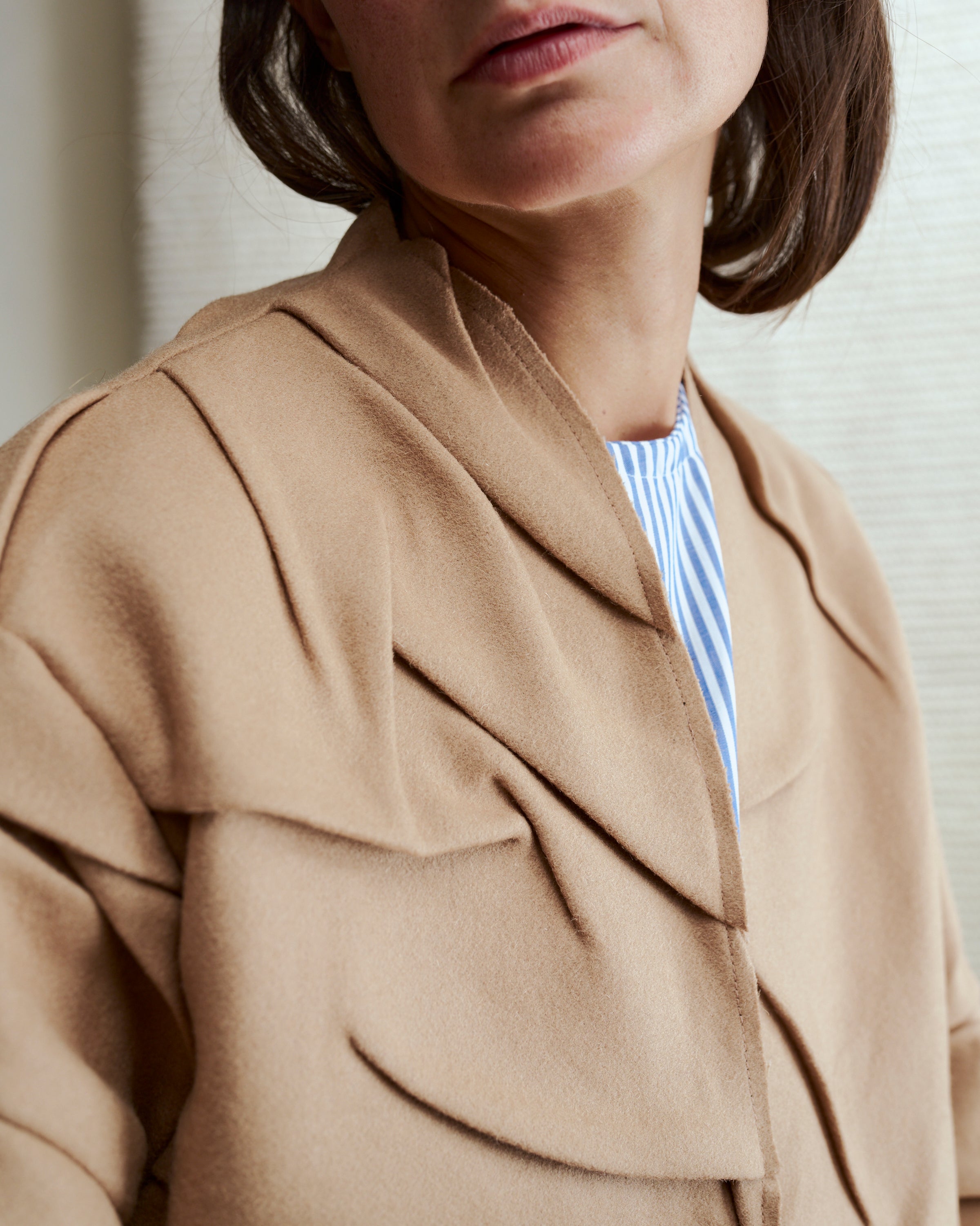Questa versione, più lunga di 20 cm, ti accompagnerà per tutta la stagione autunnale, ma la particolare lavorazione a pieghe del tessuto di lana esterno e del rivestimento interno,  sono ideali anche per la stagione fredda.
