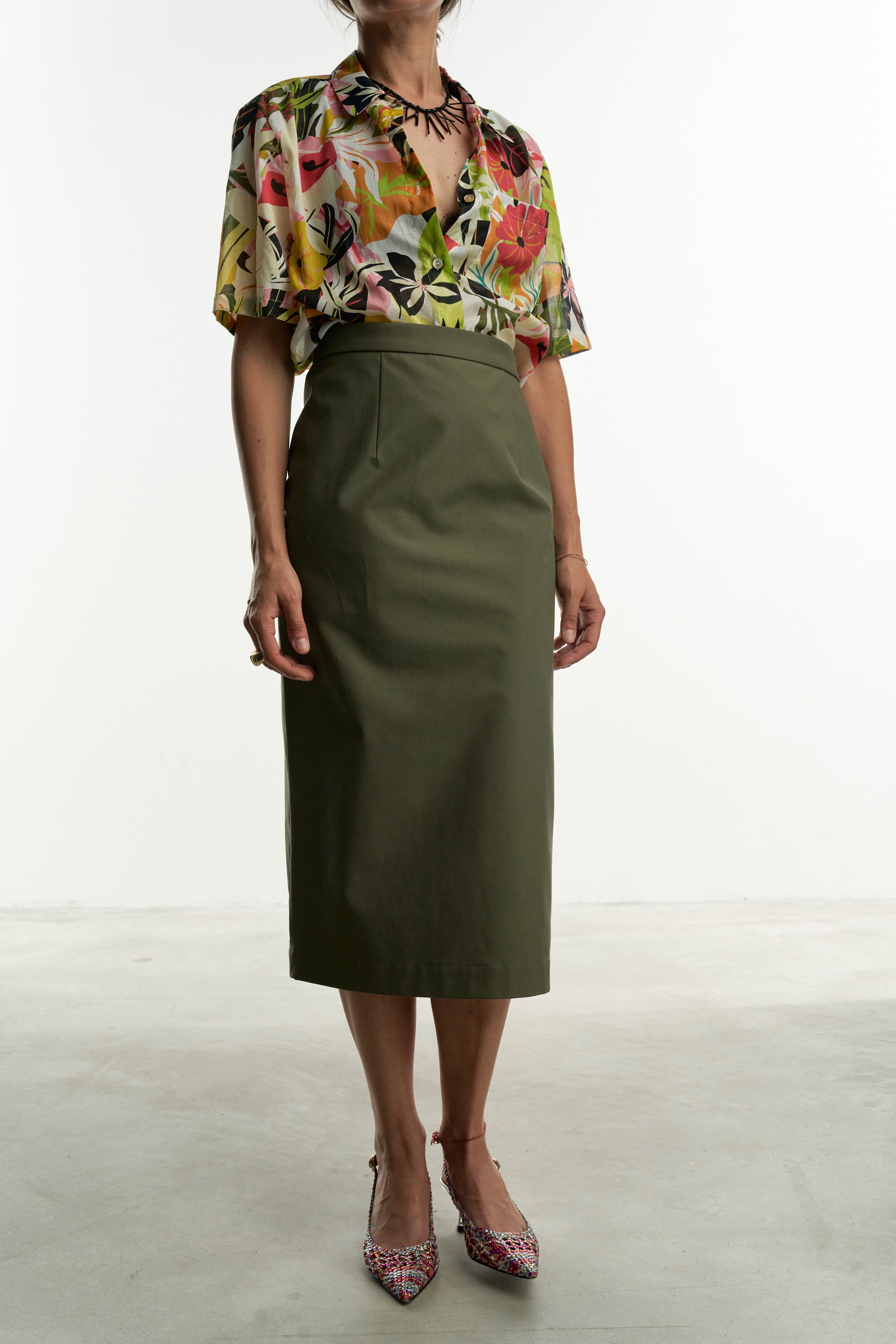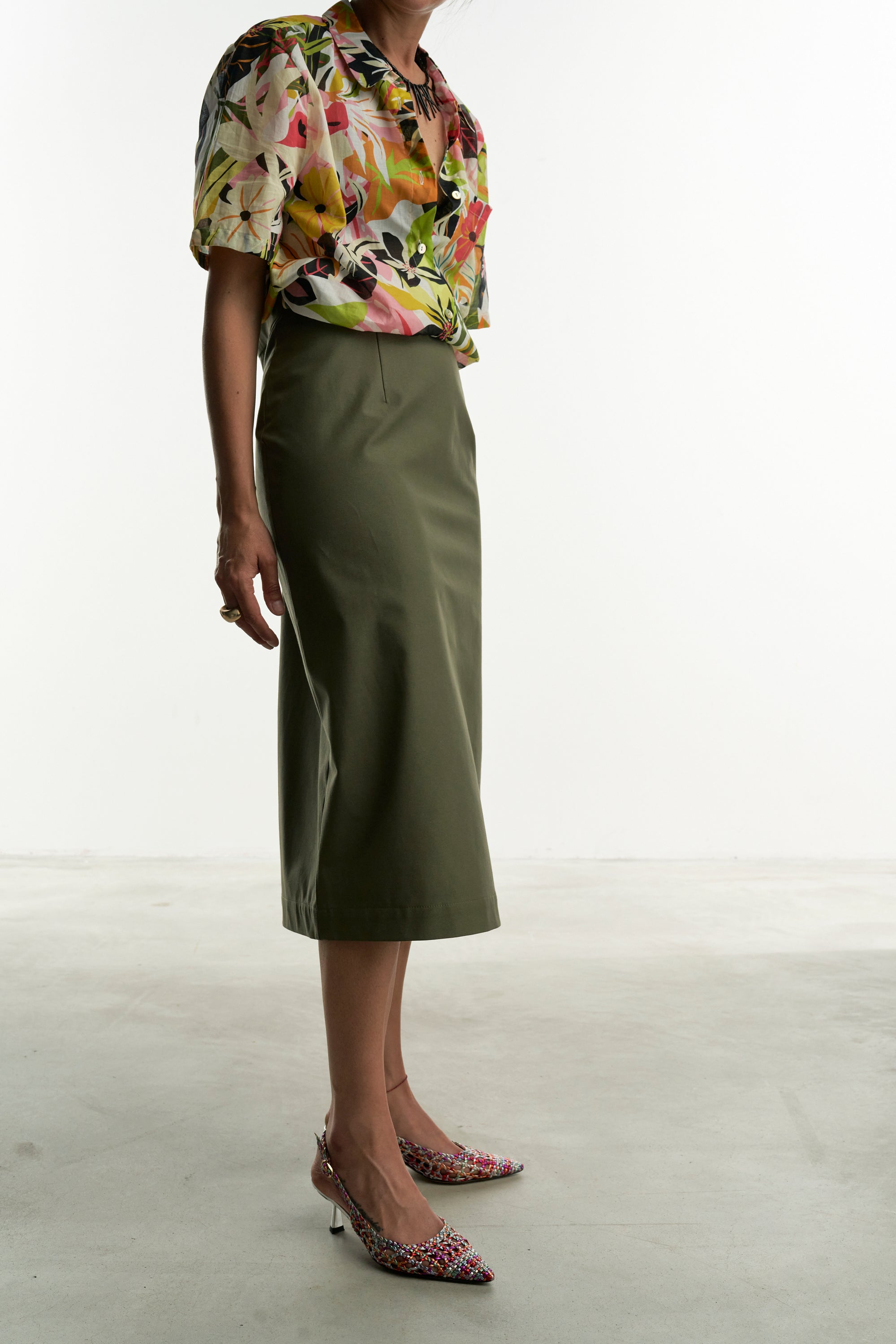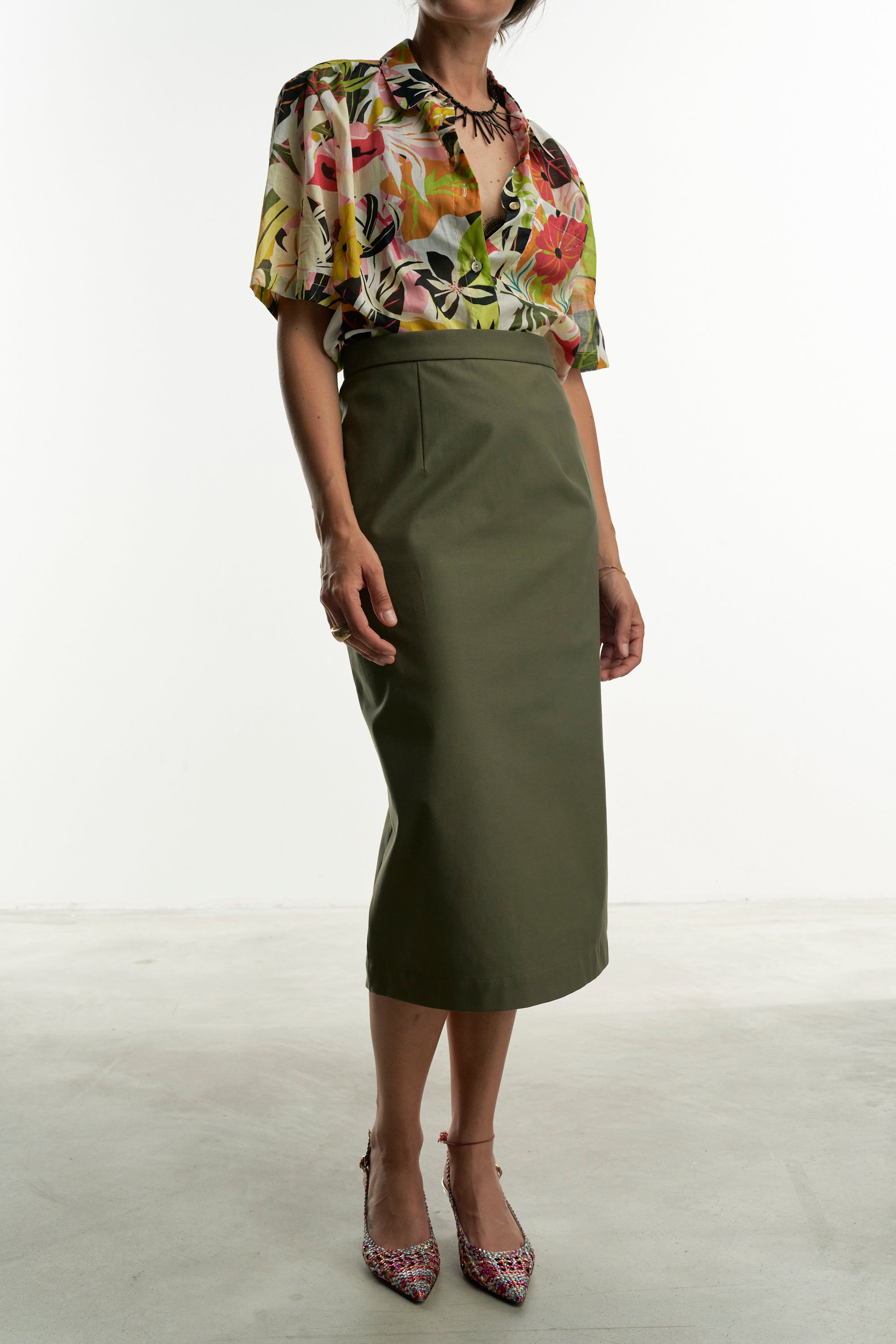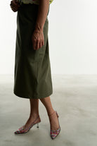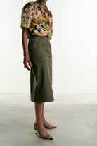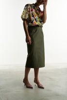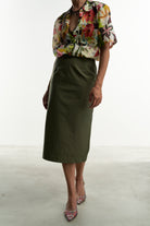Una gonna pencil rigorosa nella linea e realizzata con un tessuto color verde salvia che ben si abbina a tanti colori.