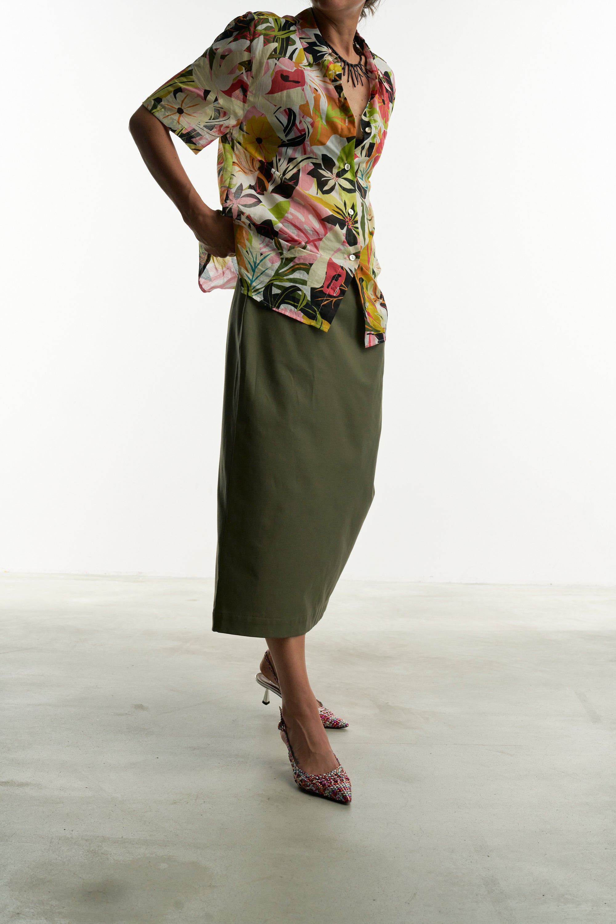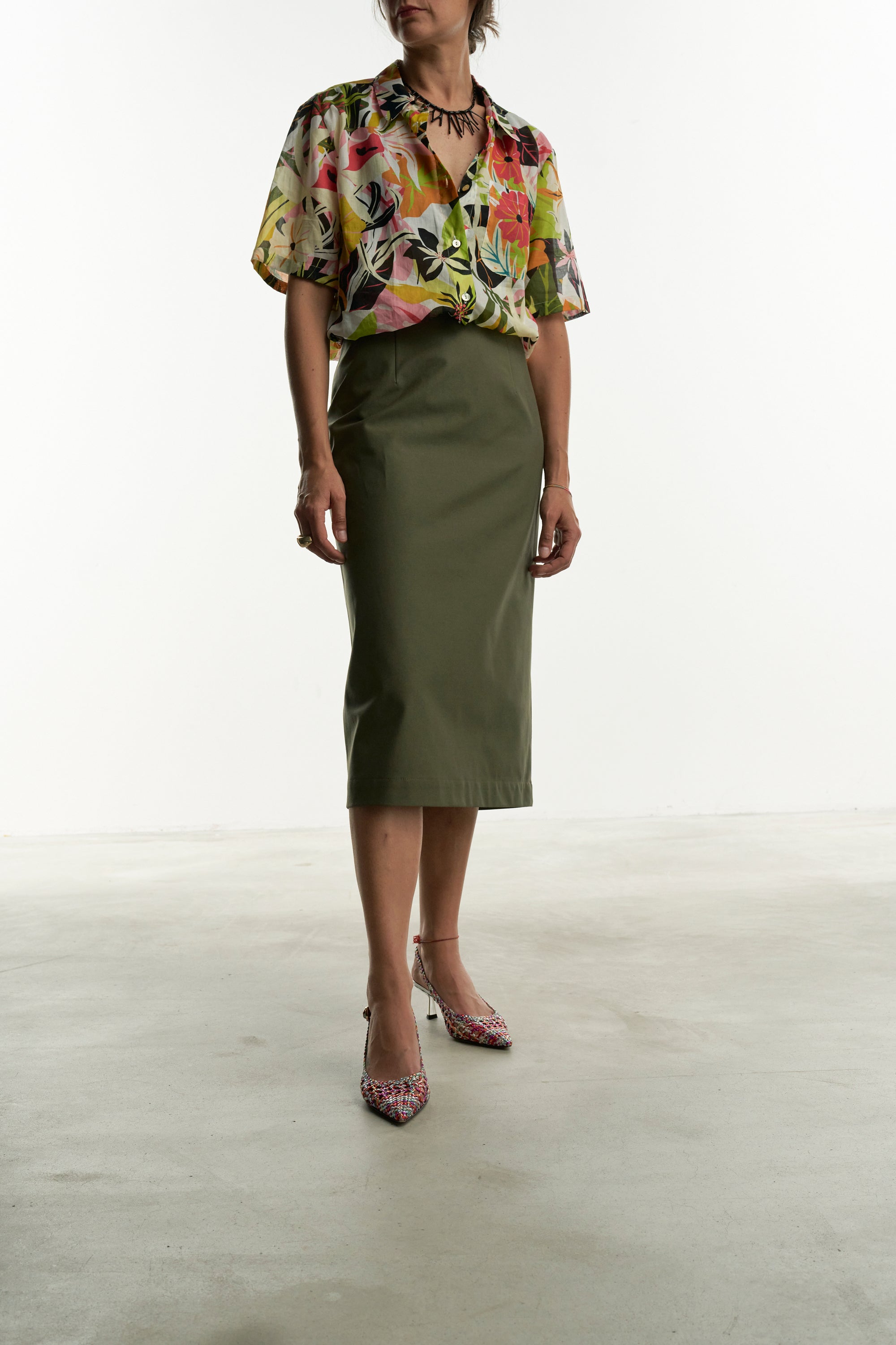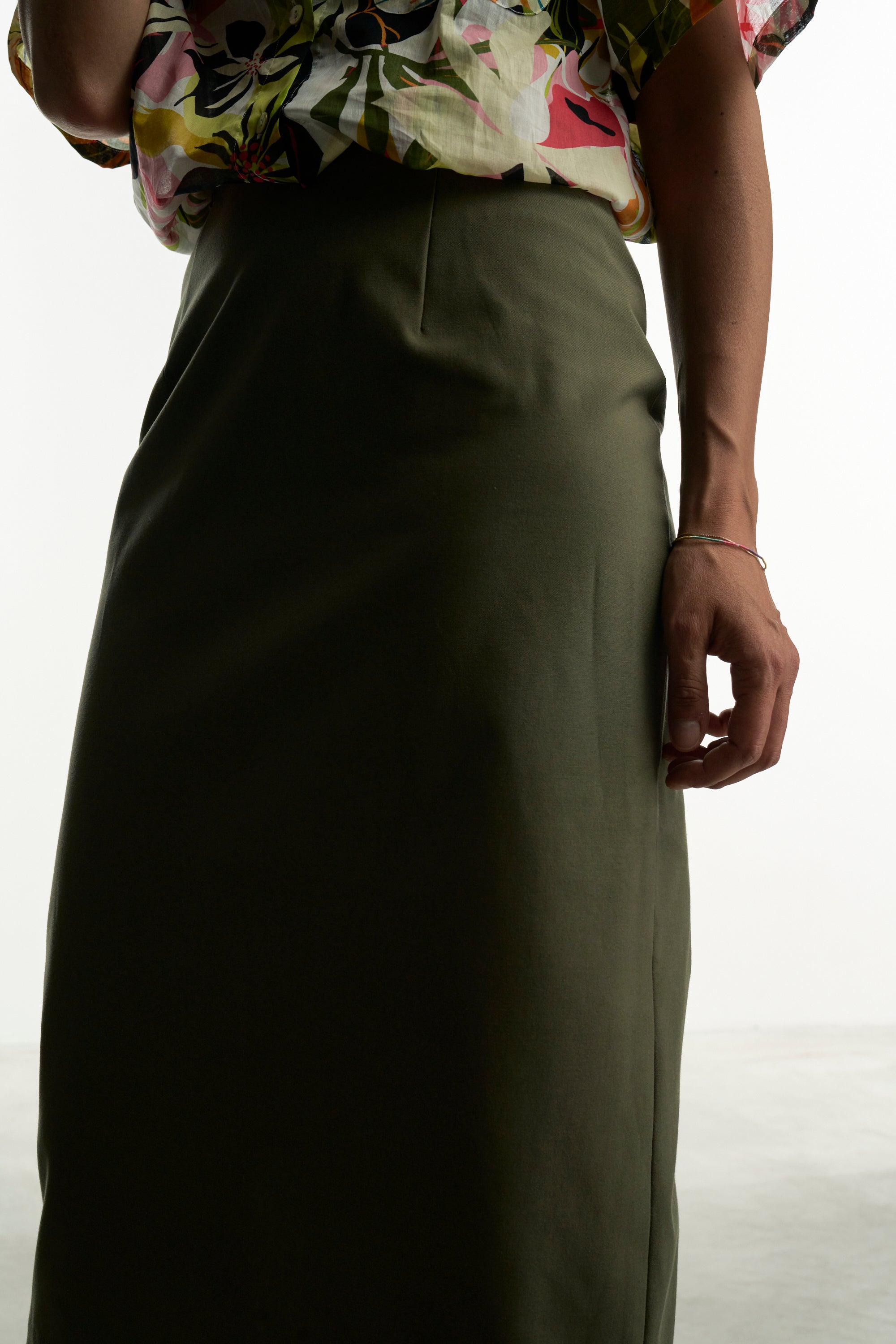 Una gonna pencil rigorosa nella linea e realizzata con un tessuto color verde salvia che ben si abbina a tanti colori.