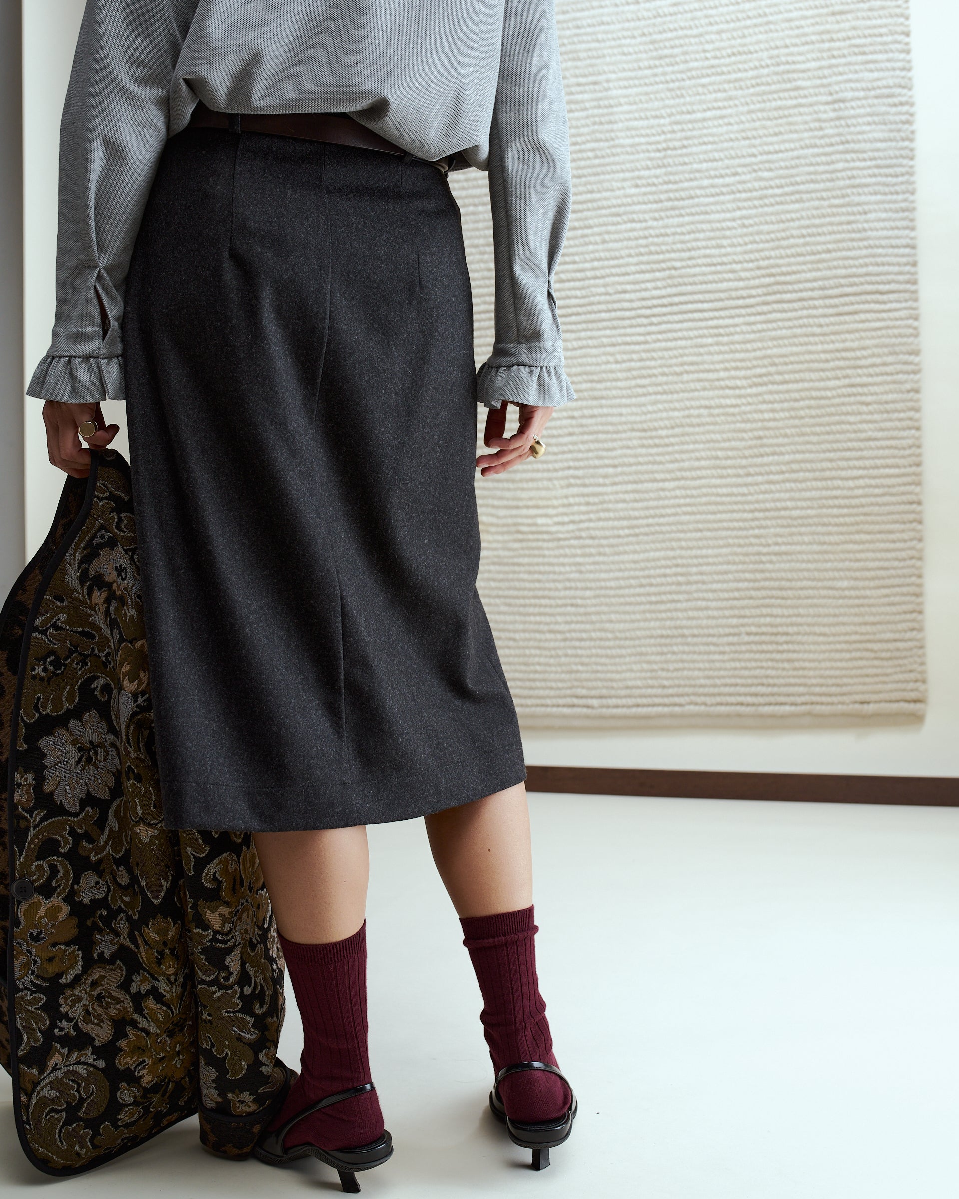E’ una gonna al ginocchio, con pannello frontale, leggermente svasata, a vita media, con cintura in vita con passanti, la chiusura del pannello è con gancetti nascosti che lasciano il fronte della gonna molto pulito.