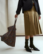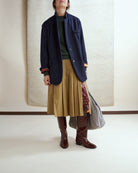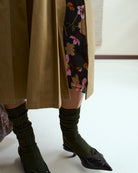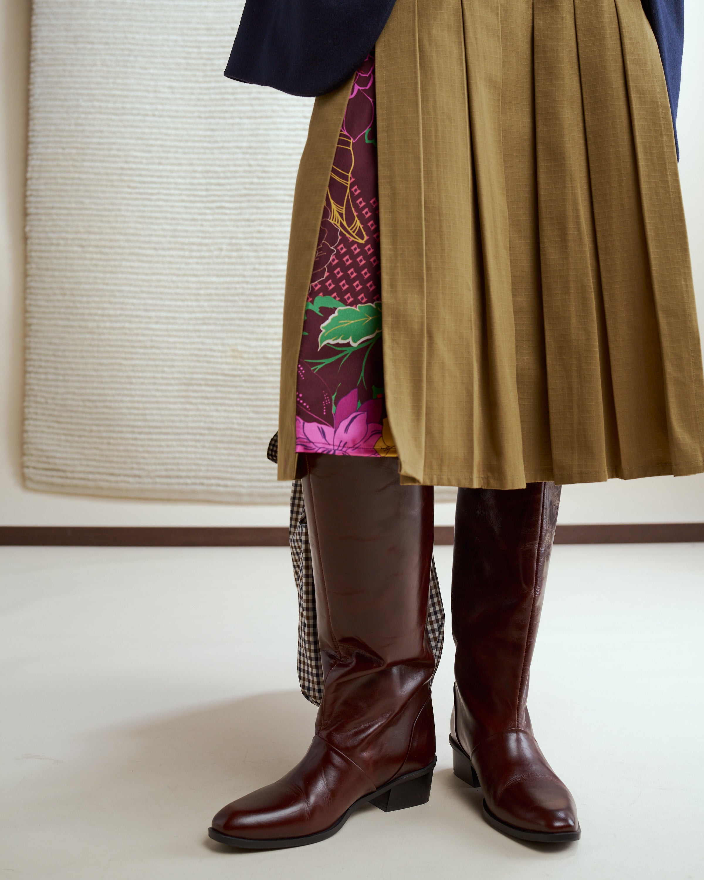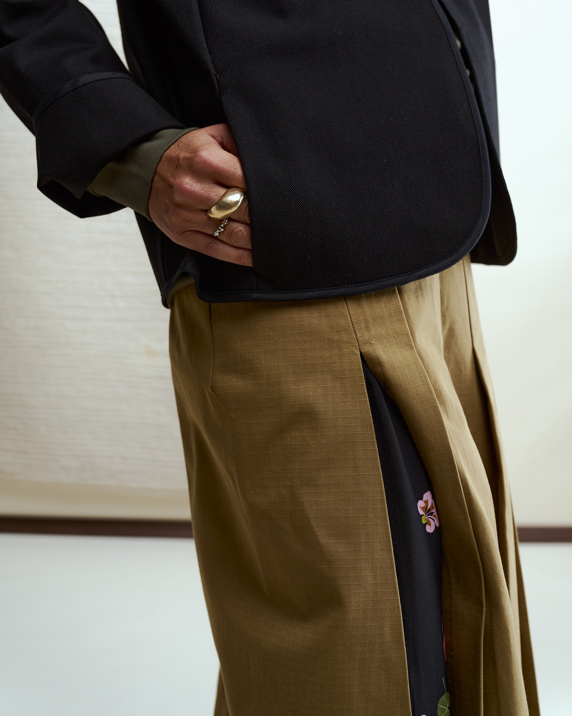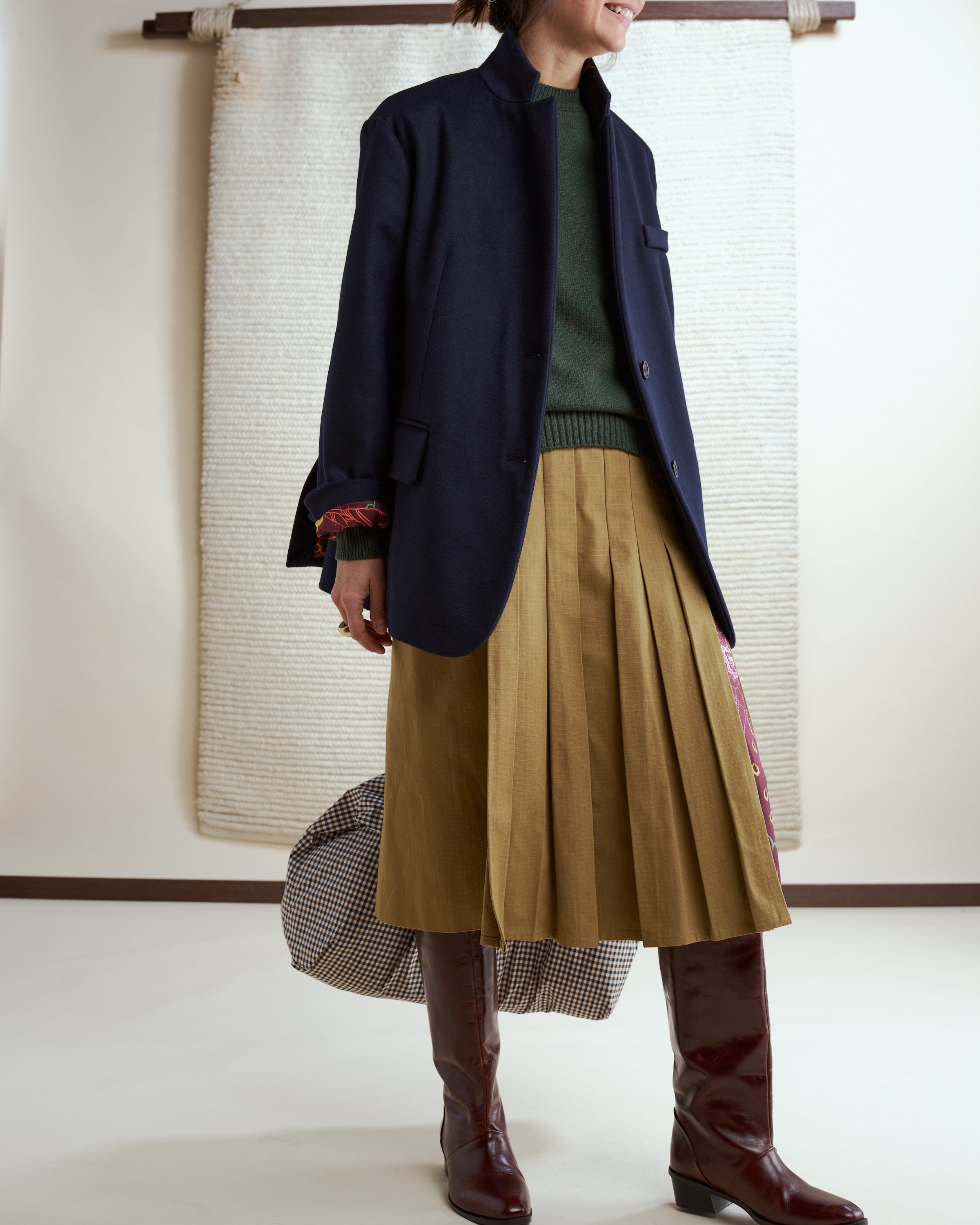Lunghezza appena sotto al ginocchio, leggermente svasata, con ampio spacco centrale sul retro e un pannello a pieghe sul davanti, che ad ogni vostro movimento si sposterà per svelare la bellissima fodera in seta.