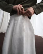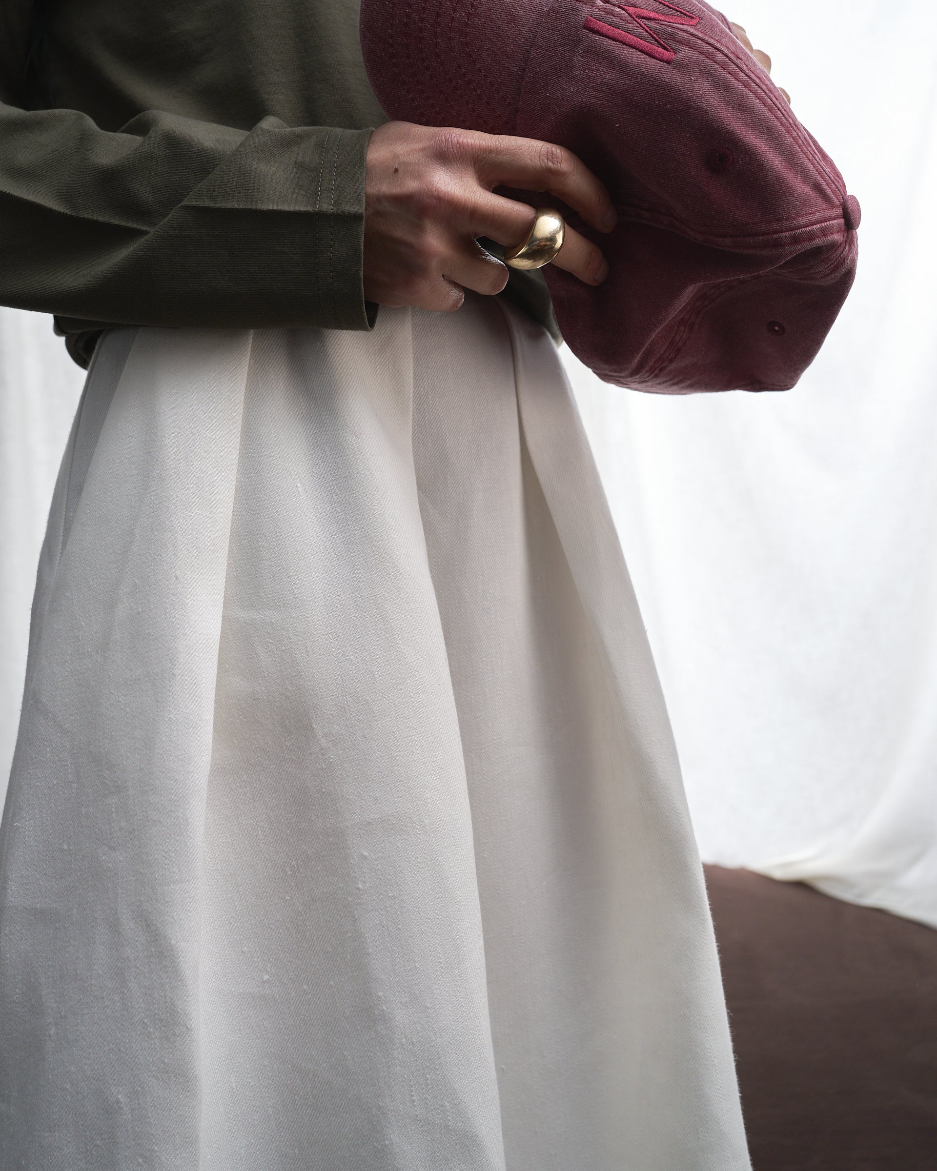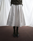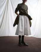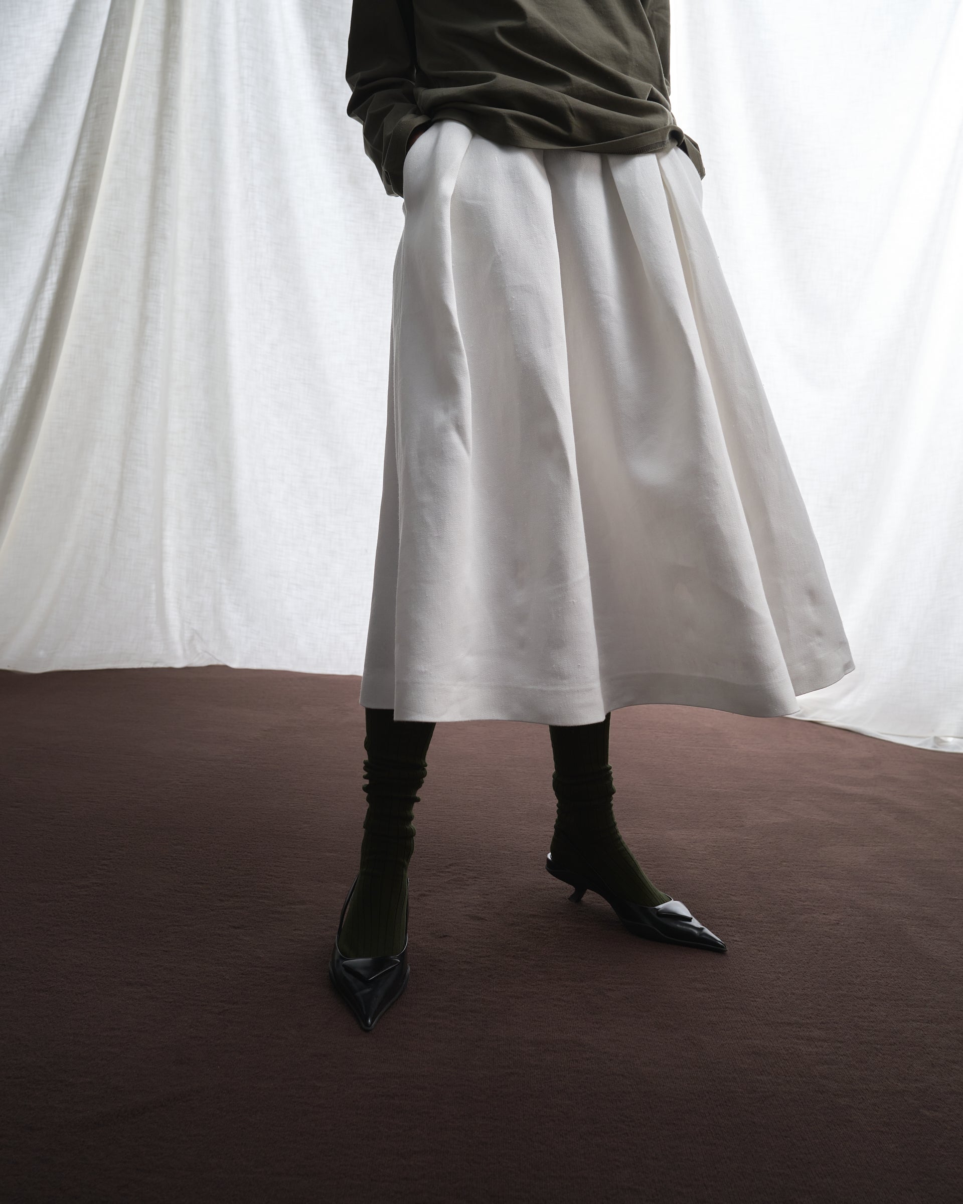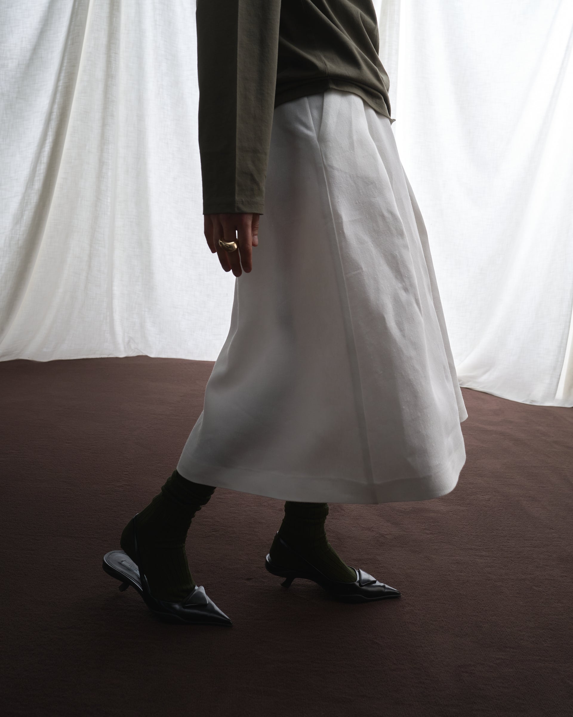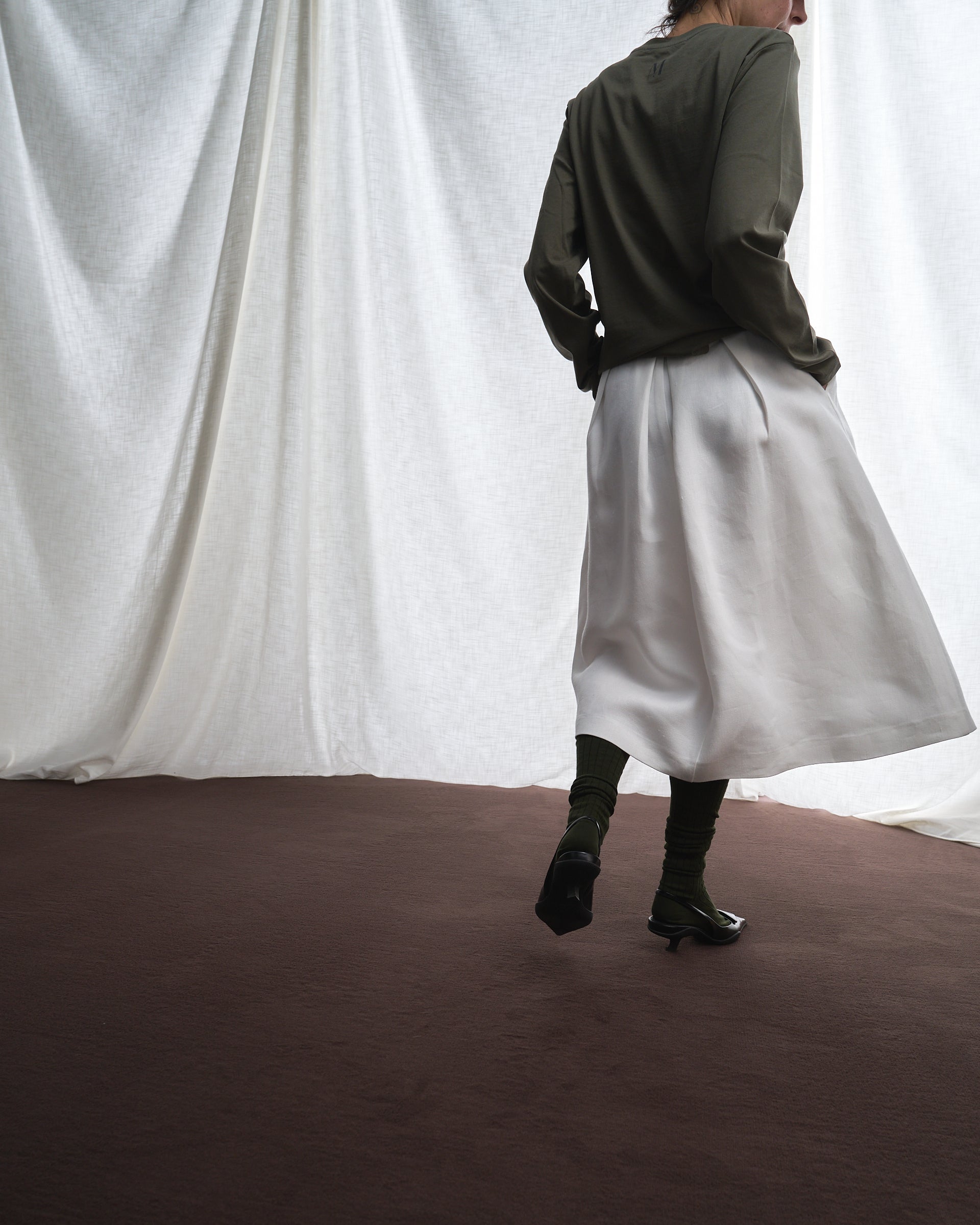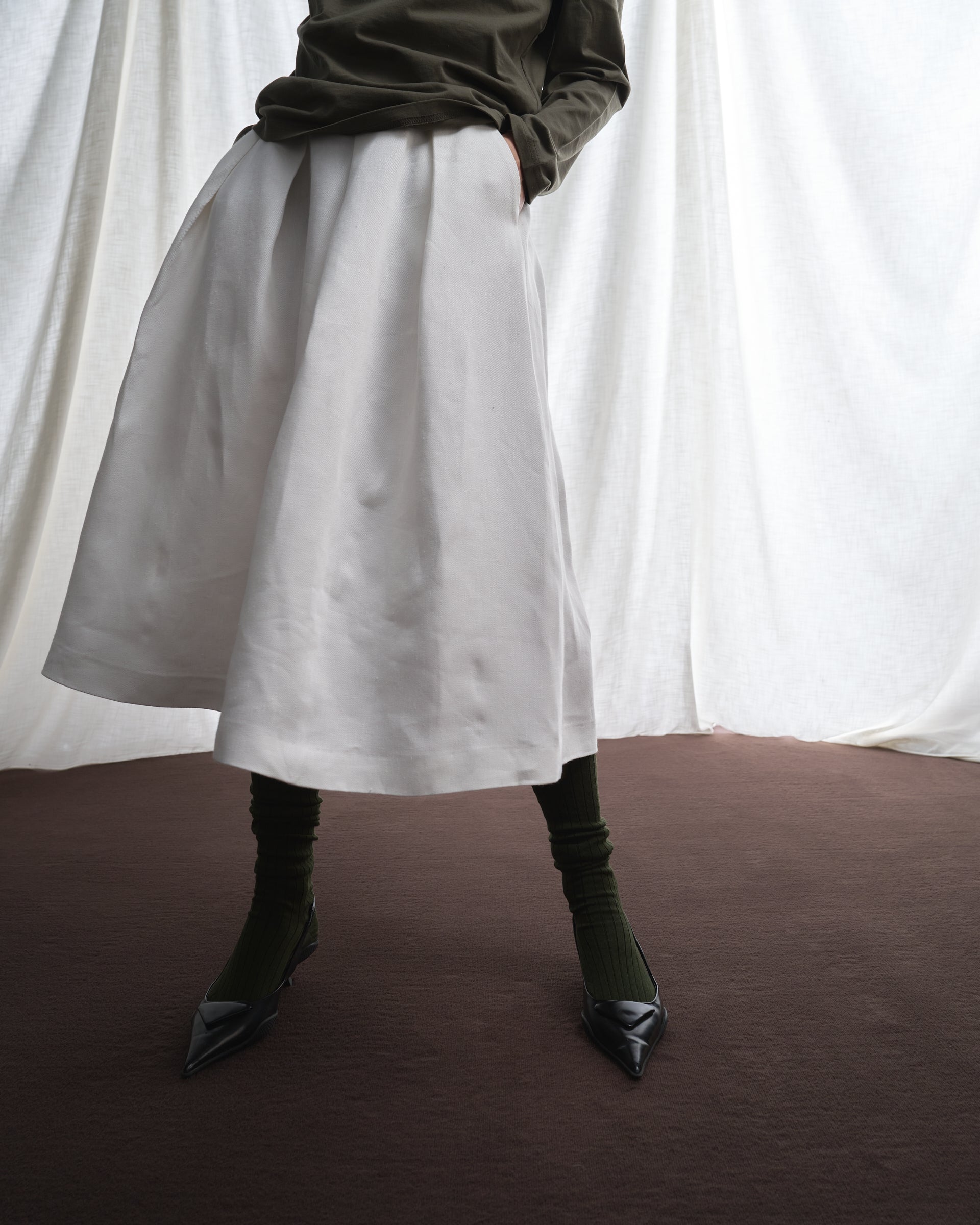 Una gonna classica a pieghe aperte lungo tutta la circonferenza, voluminosa ed elegante.