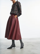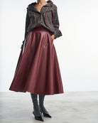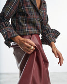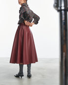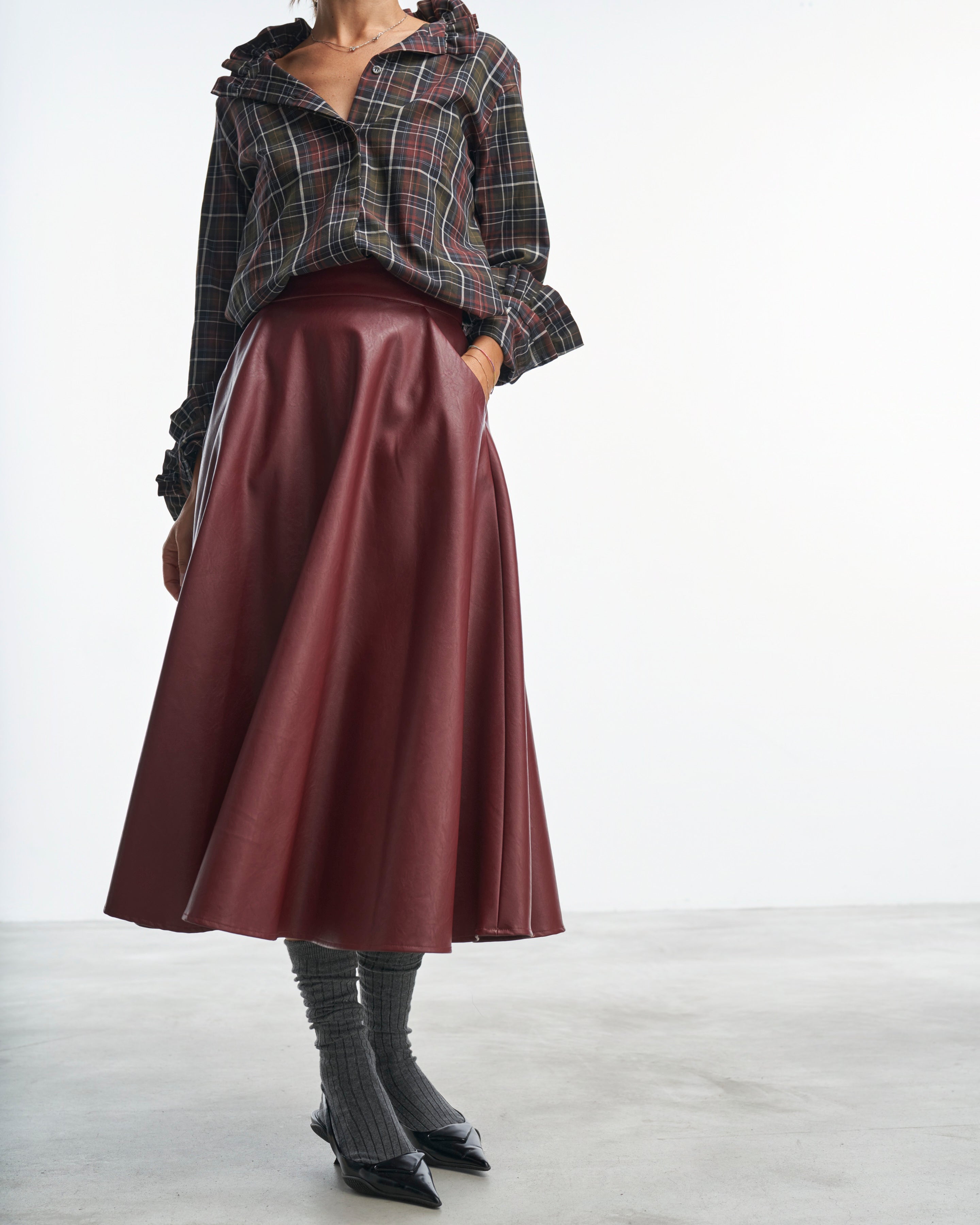 La silhouette un pò retrò è sdrammatizzata dai dettagli irriverenti della fascia alta in vita e delle tasche alla francese. Realizzata in morbida ecopelle color vino, questa gonna si adatta a tante fisicità.