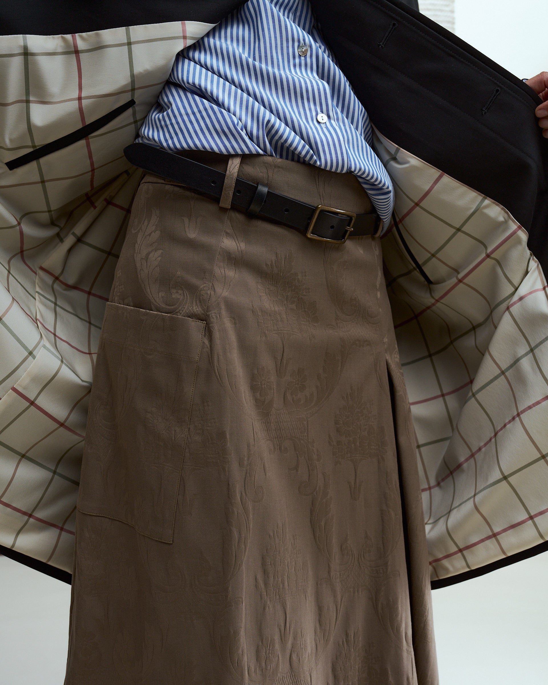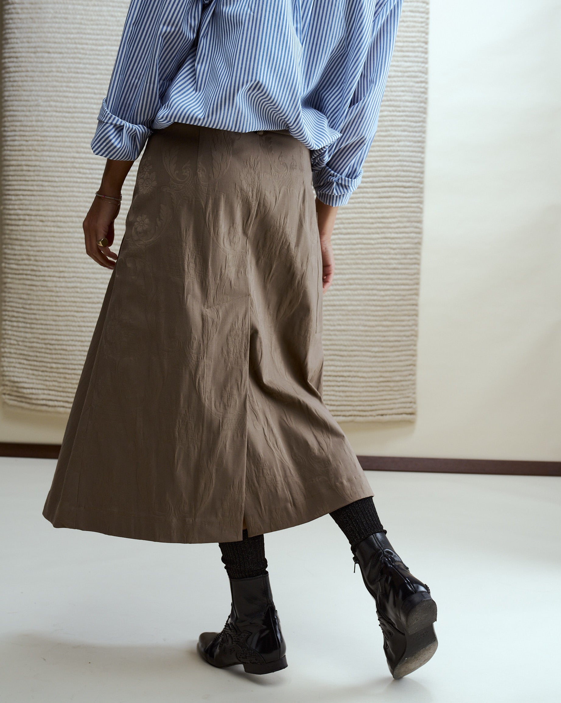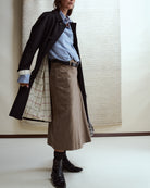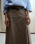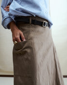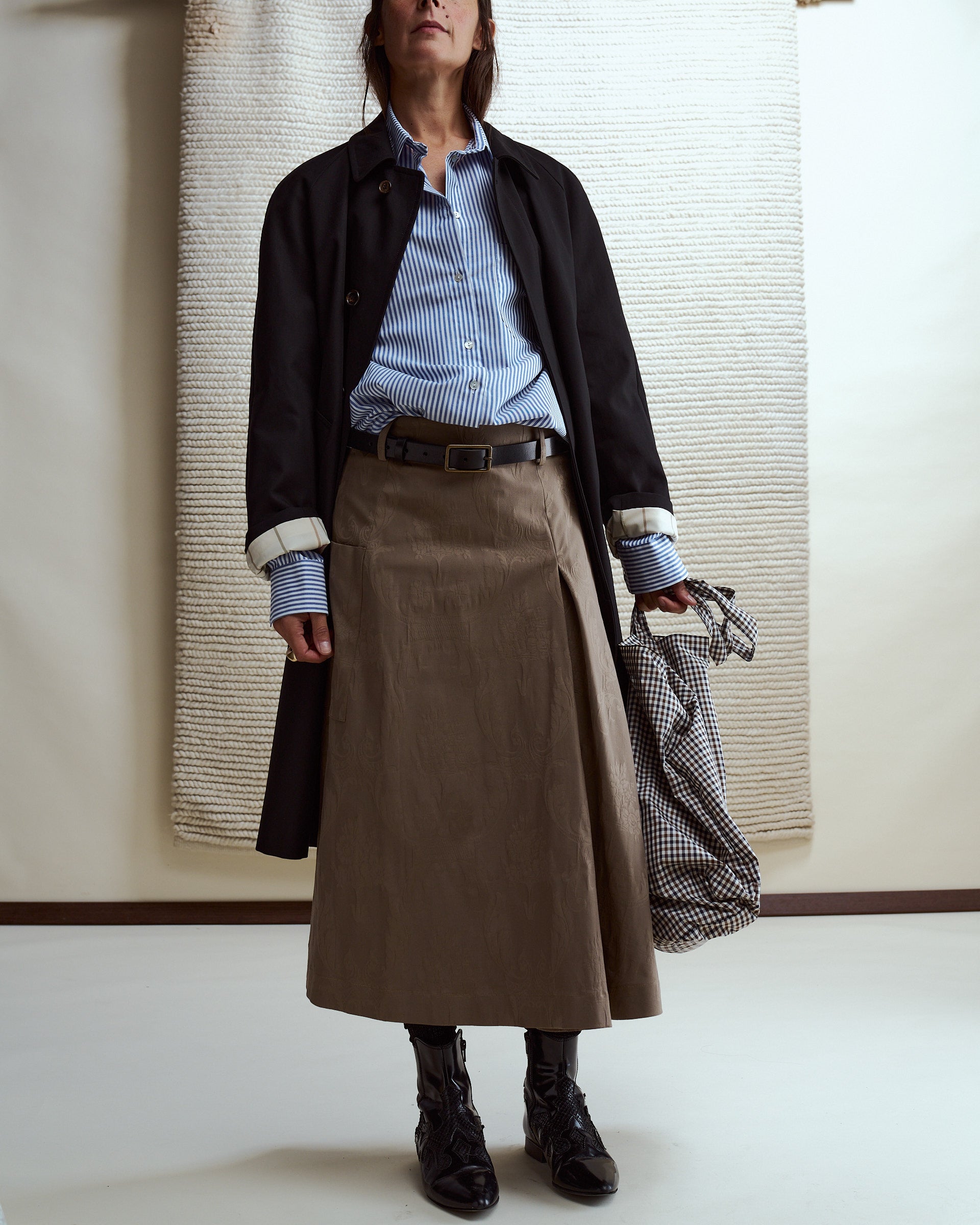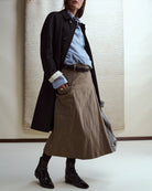 E’ una gonna midi, svasata, con un’ampia tasca applicata sotto il fianco sinistro e una piega a cannone davanti sul lato destro, allacciatura con zip sul fianco e alta cintura in vita con passanti (per poter essere portata con tutte le nostre cinture).