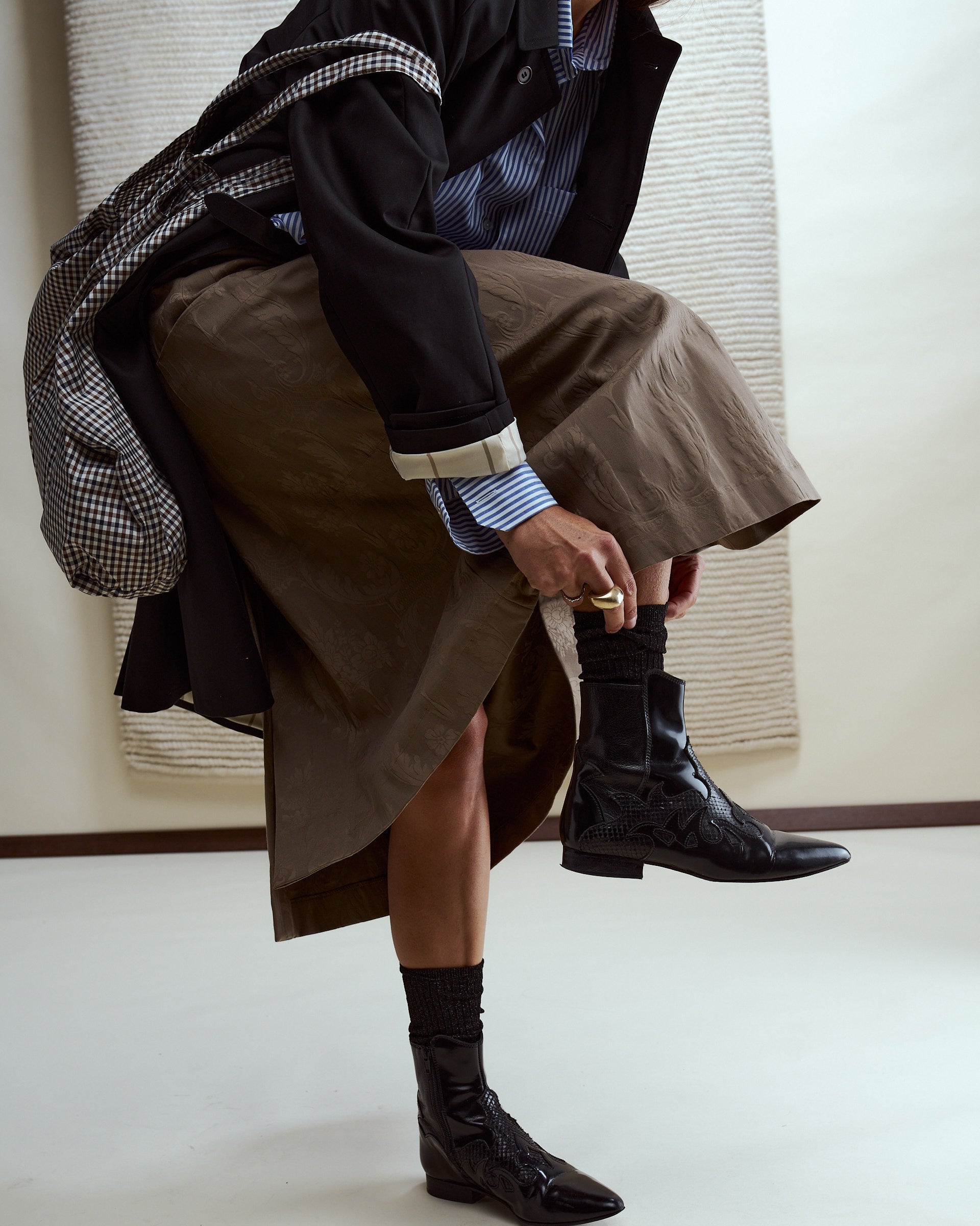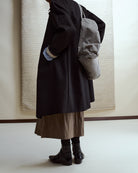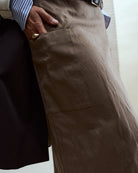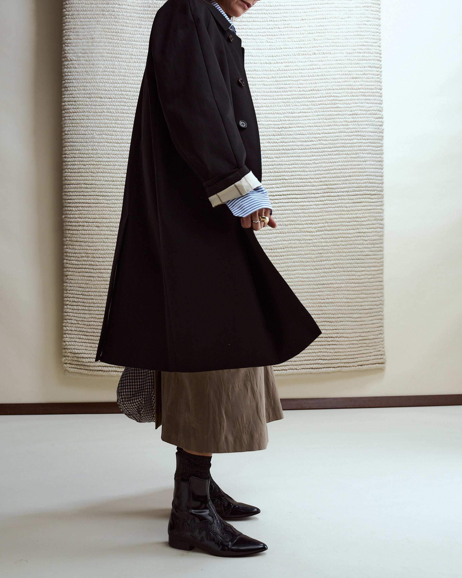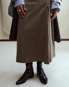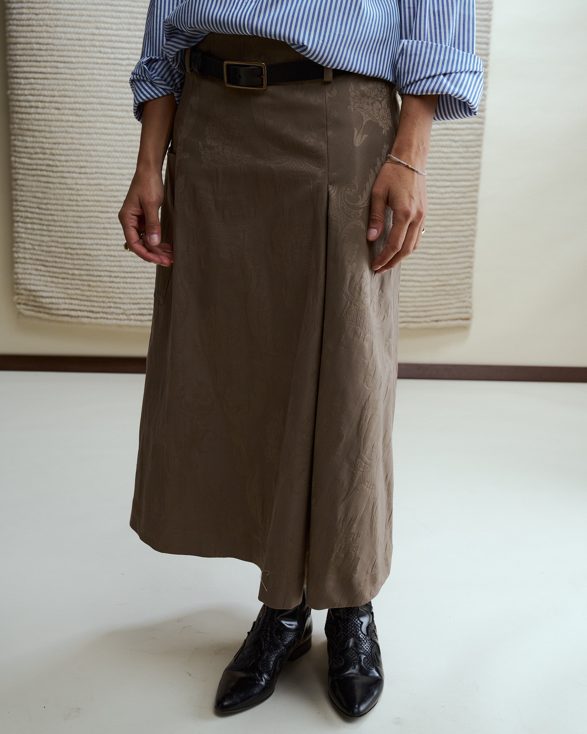 E’ una gonna midi, svasata, con un’ampia tasca applicata sotto il fianco sinistro e una piega a cannone davanti sul lato destro, allacciatura con zip sul fianco e alta cintura in vita con passanti (per poter essere portata con tutte le nostre cinture).