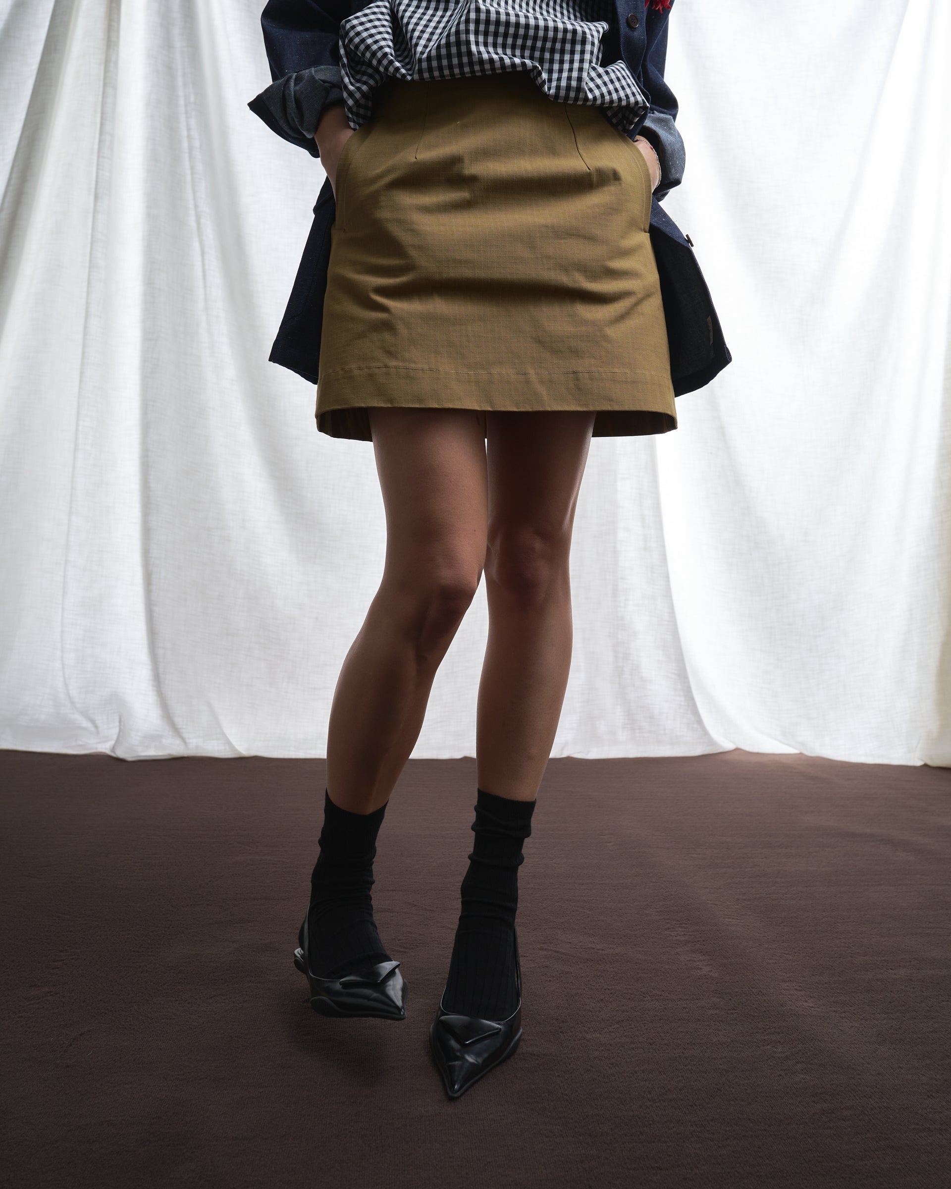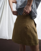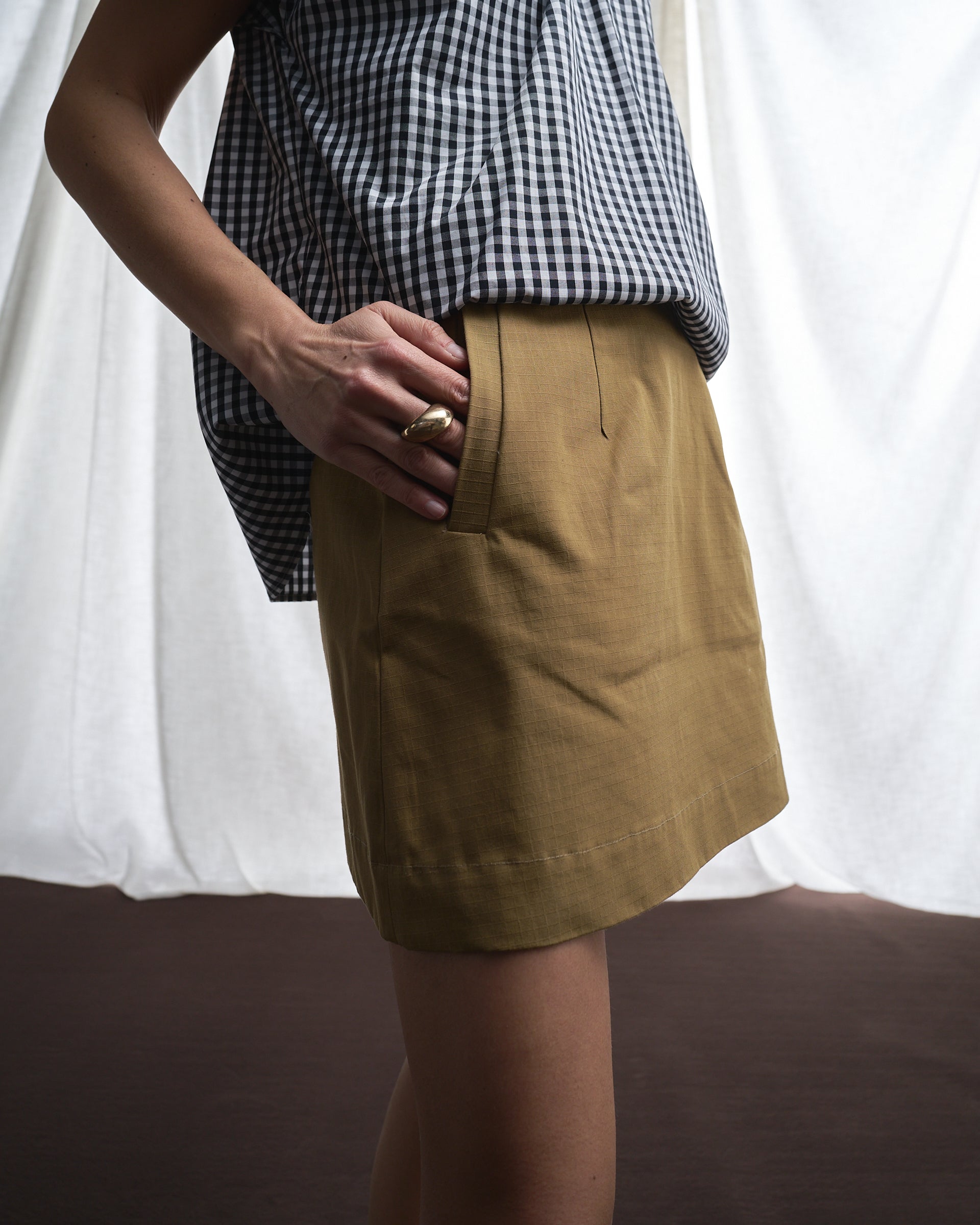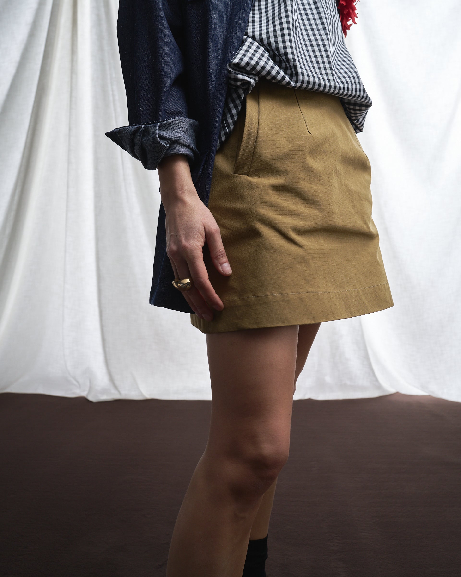 Fulvia è una minigonna a vita mediaa, svasata e lineare nella silhouette. Le due pinces sul davanti sono un dettaglio che la rende confortevole mentre le due tasche a filetto ne arricchiscono la semplicità.