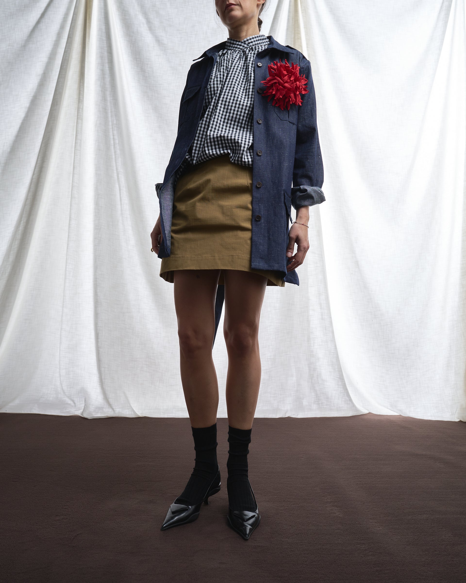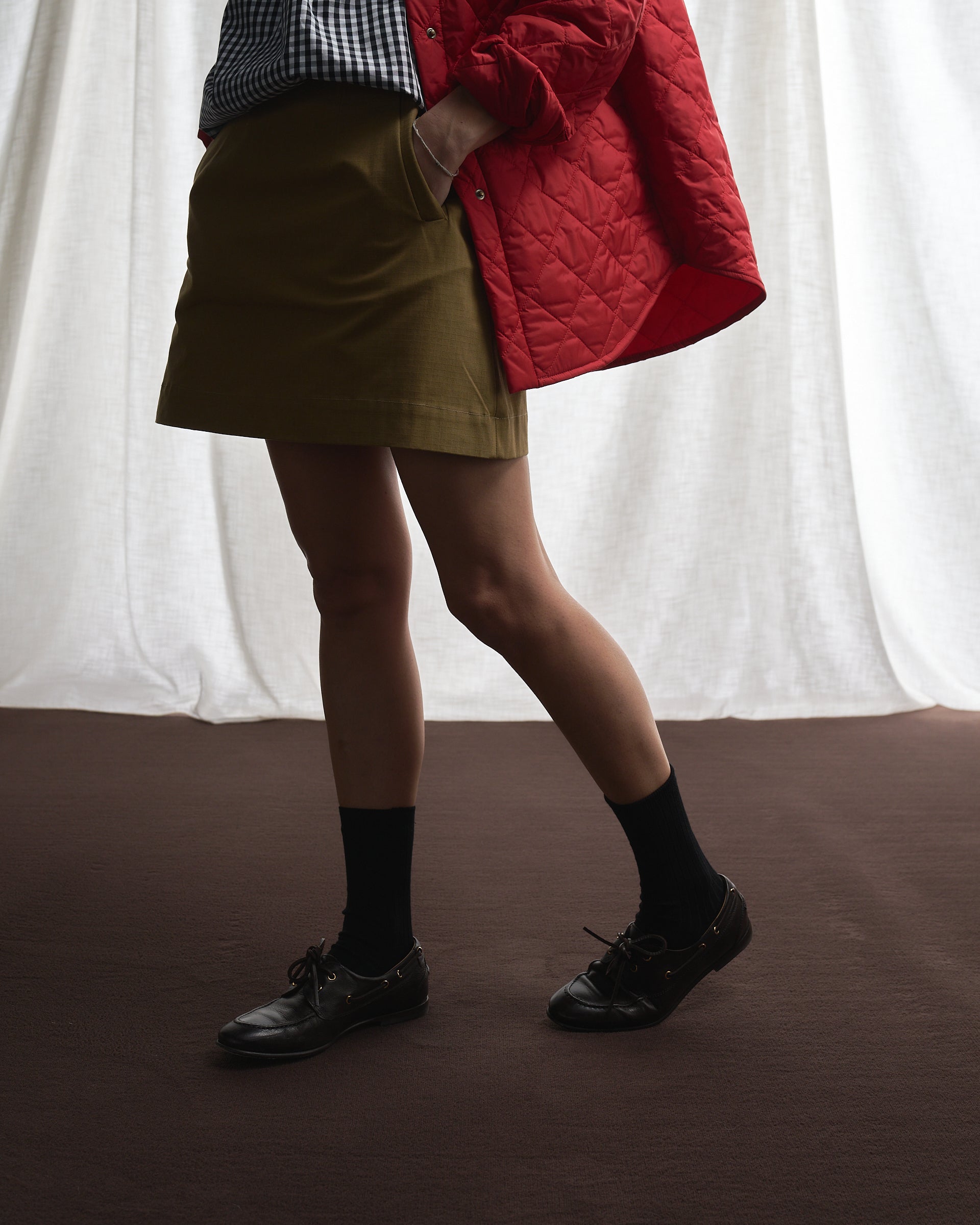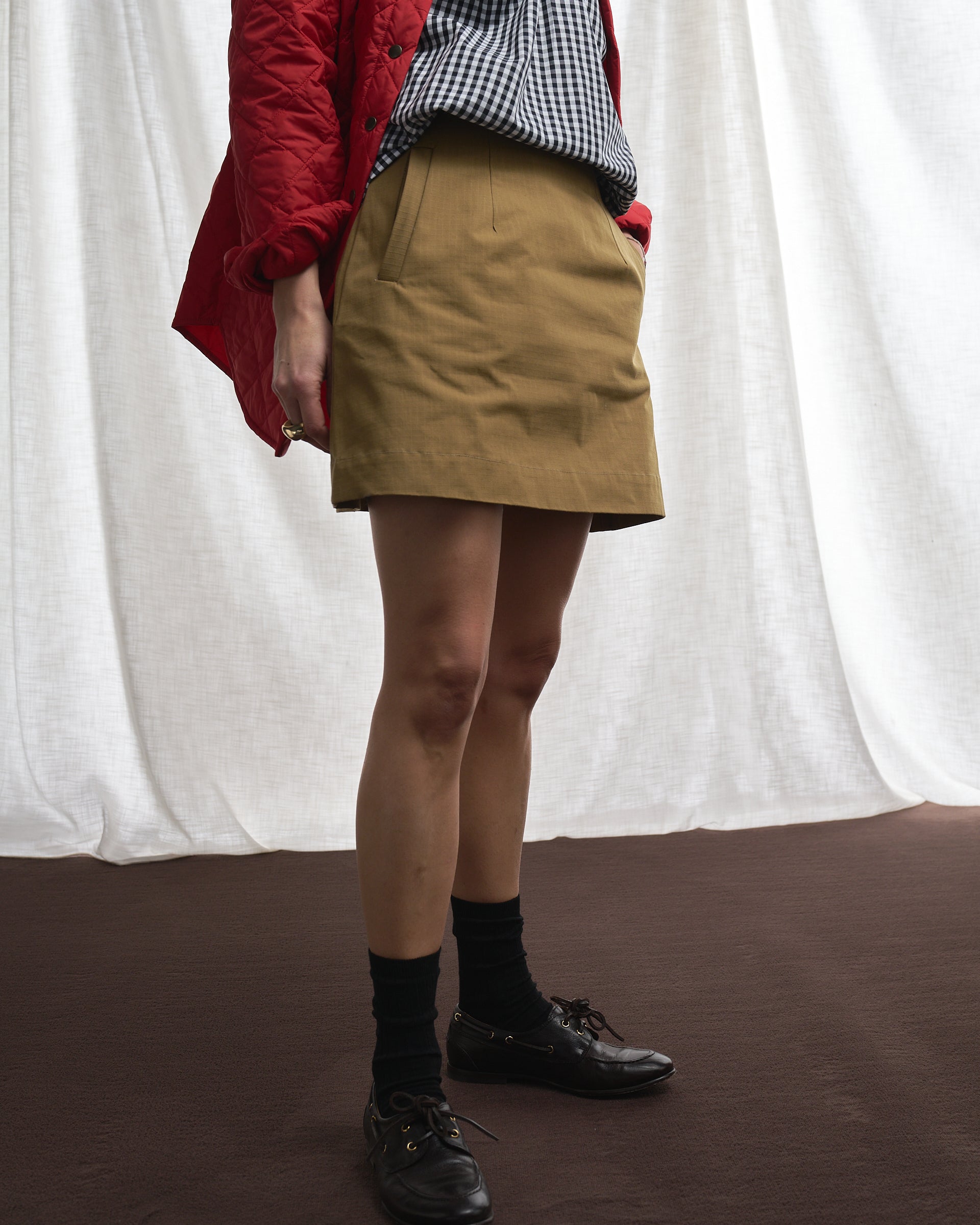 Fulvia è una minigonna a vita mediaa, svasata e lineare nella silhouette. Le due pinces sul davanti sono un dettaglio che la rende confortevole mentre le due tasche a filetto ne arricchiscono la semplicità.