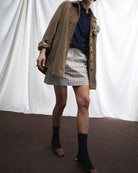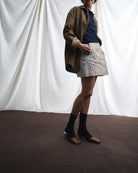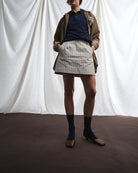 Fulvia è una minigonna a vita media, svasata e lineare nella silhouette. Le due pinces sul davanti sono un dettaglio che la rende confortevole mentre le due tasche a filetto ne arricchiscono la semplicità.