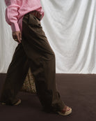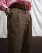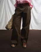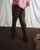 Un pantalone dal taglio maschile, con gamba ampia, vita media e irriverenti dettagli maschili, come la cintura preformata in vita, che incontrano la femminilità e l'eleganza senza tempo di un pantalone di qualità.