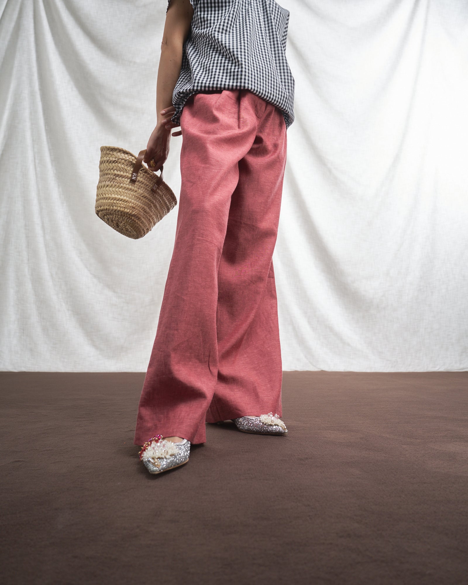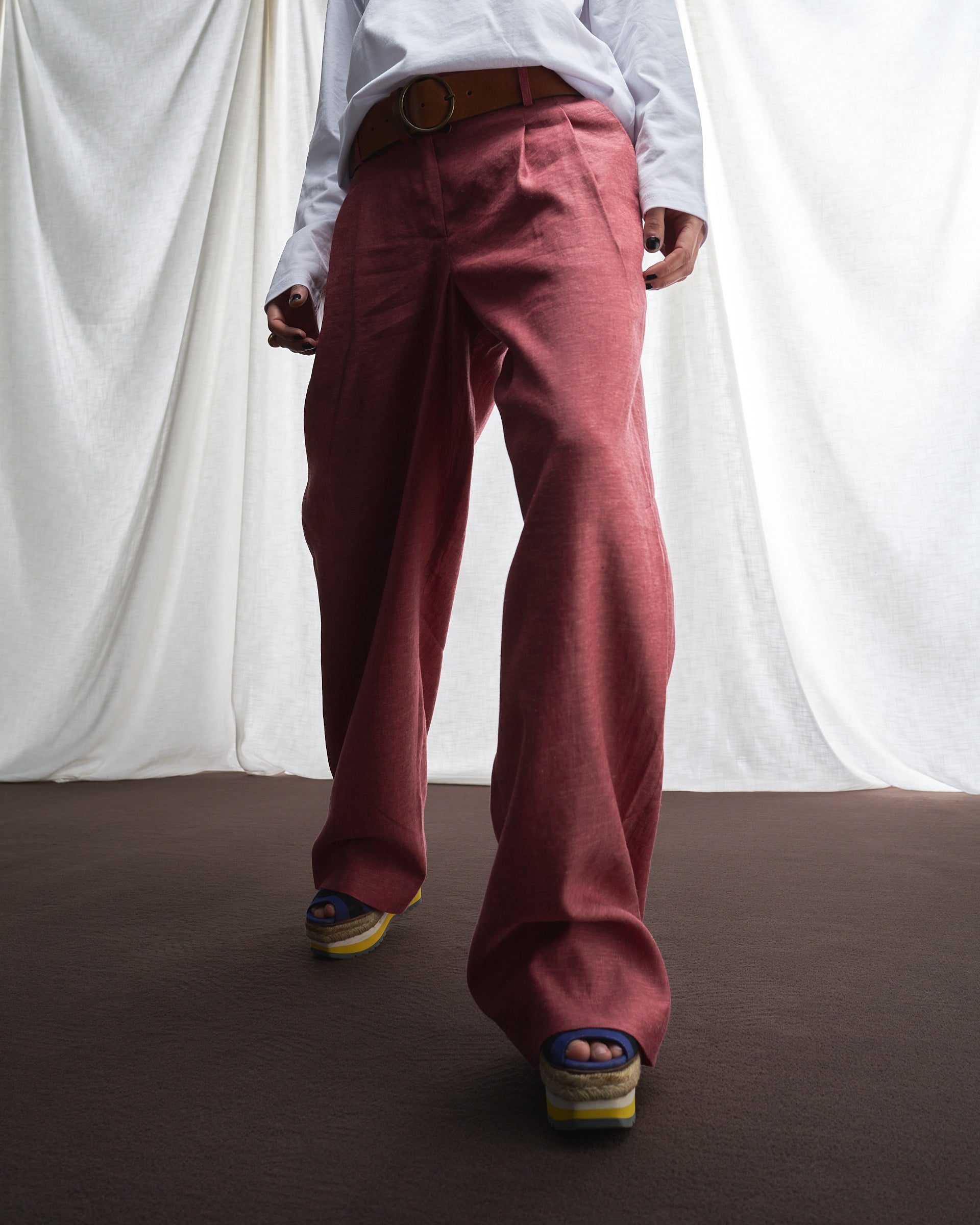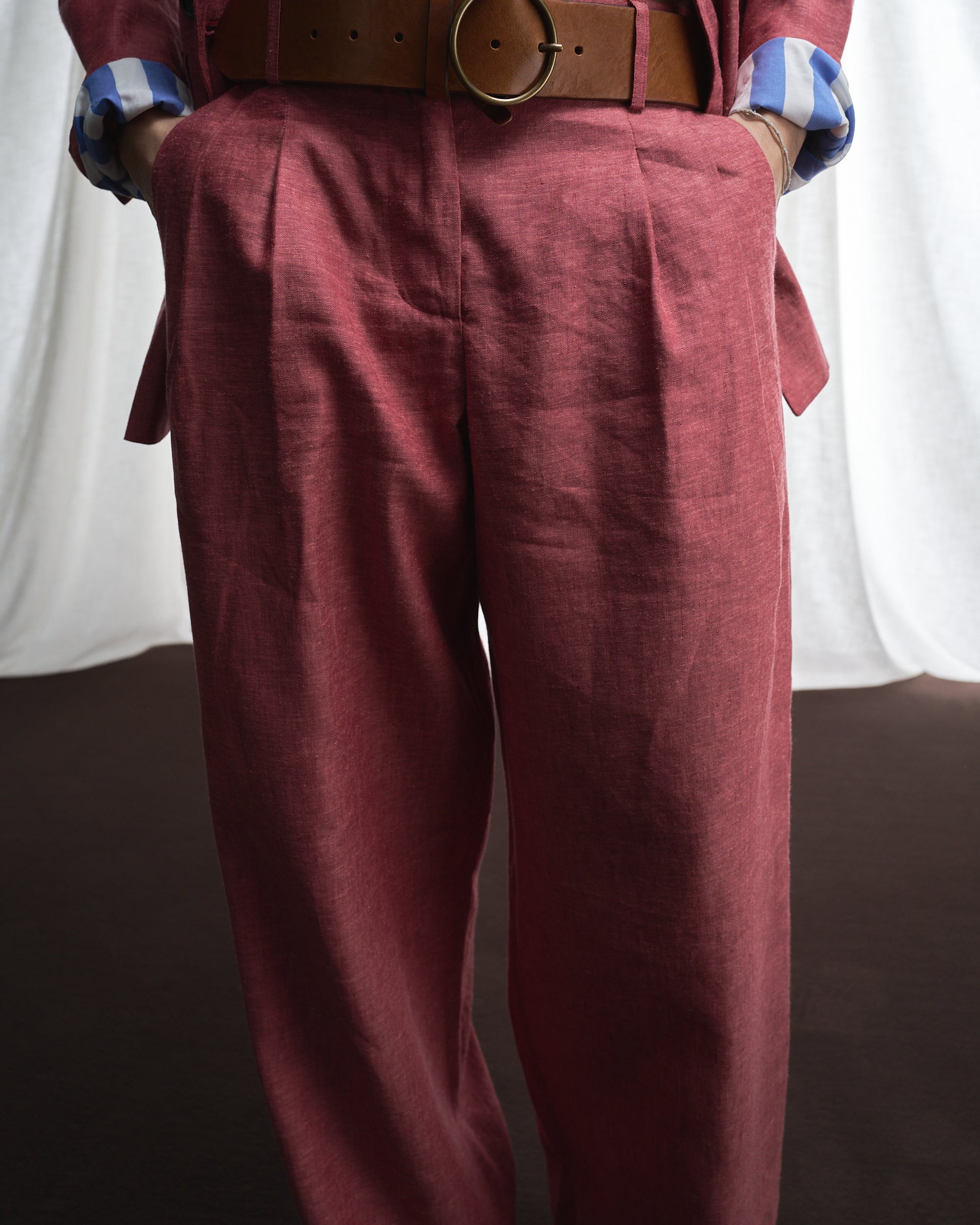 Un pantalone dal taglio maschile, con gamba ampia, vita media e irriverenti dettagli maschili, come la cintura preformata in vita, che incontrano la femminilità e l'eleganza senza tempo di un pantalone di qualità.