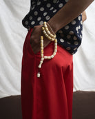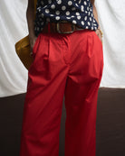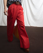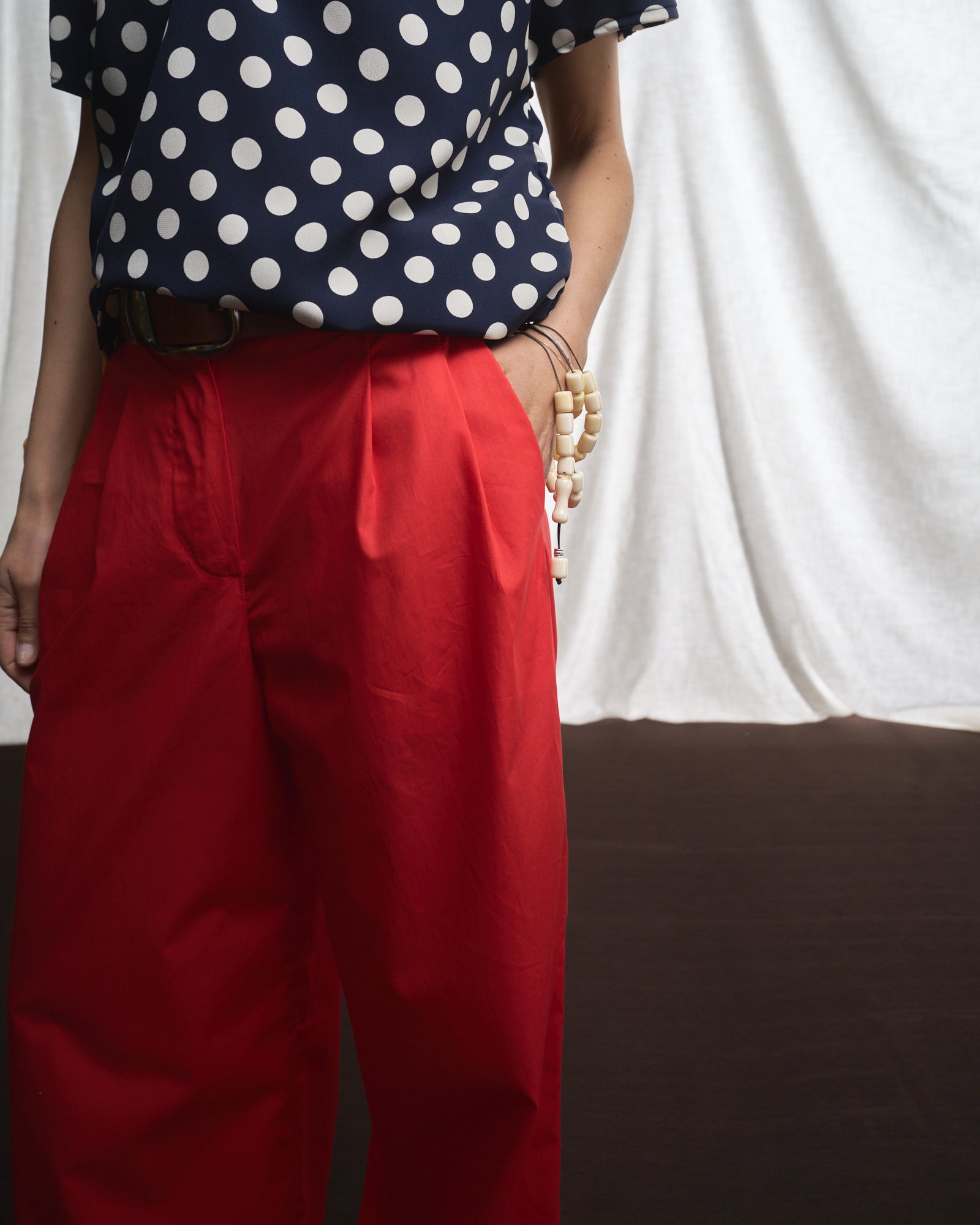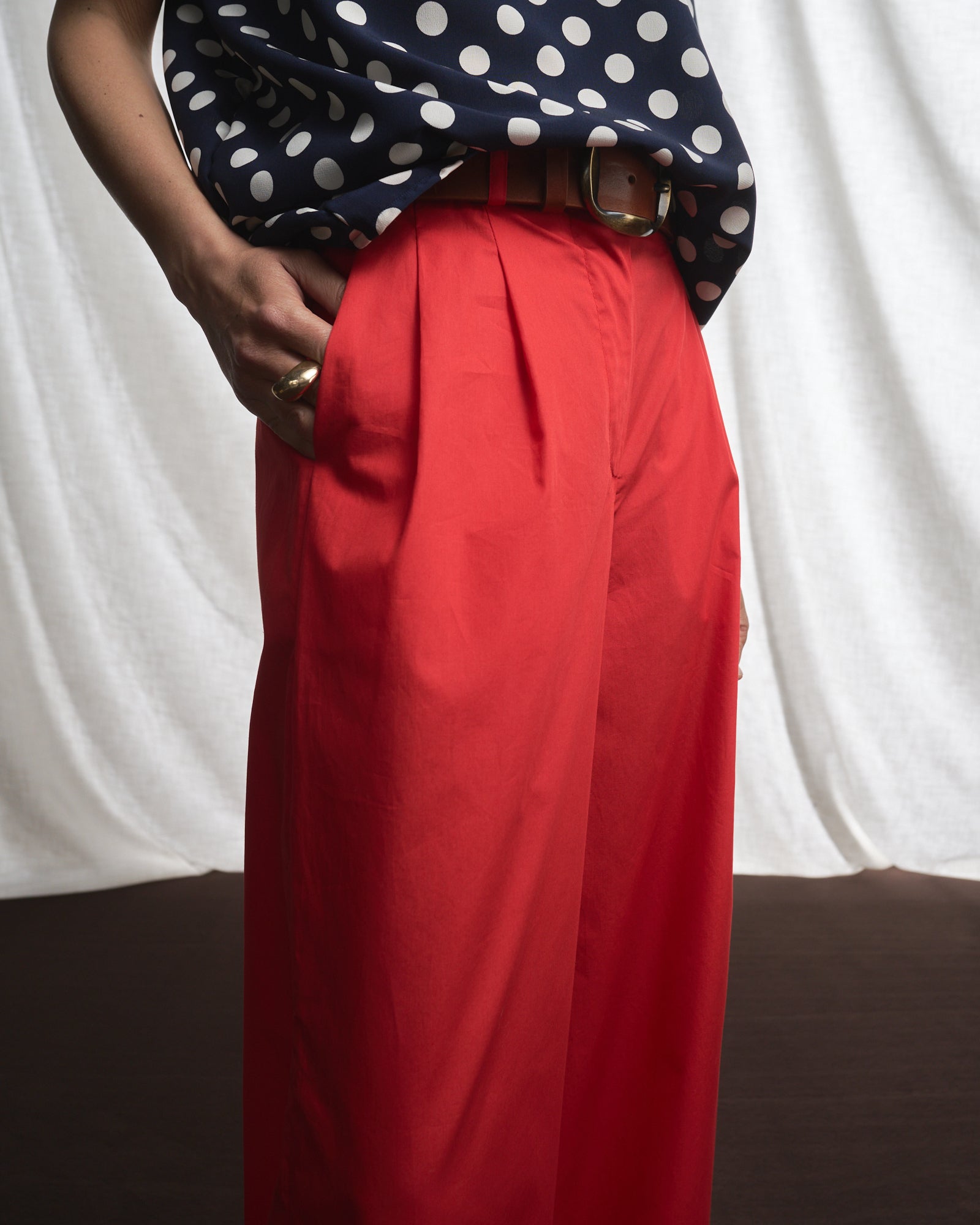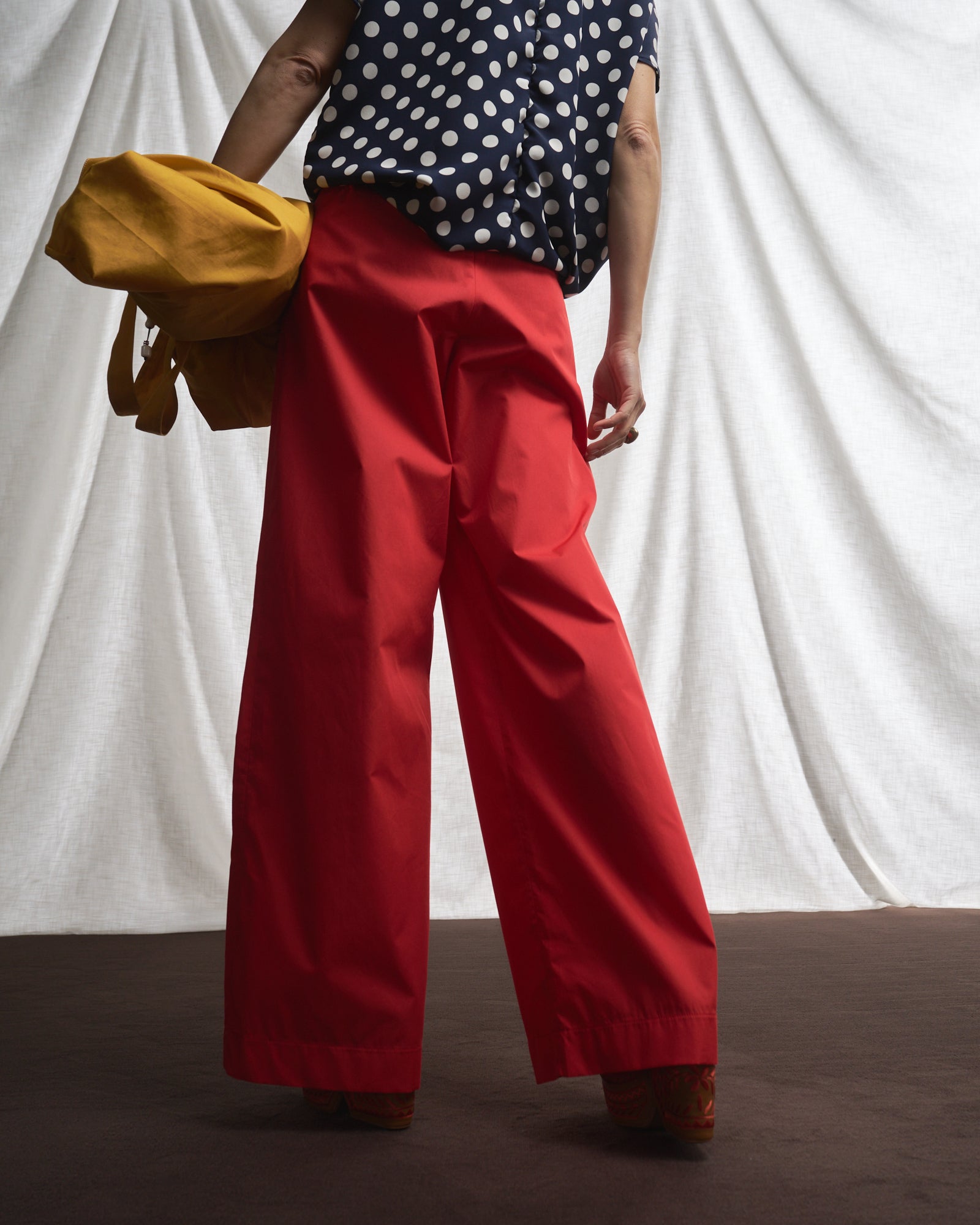 Un pantalone palazzo con gamba ampia, a vita alta, dai forti e irriverenti dettagli maschili, che incontrano la femminilità e l'eleganza senza tempo di un pantalone di qualità.