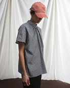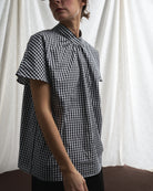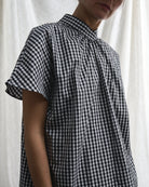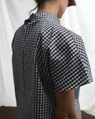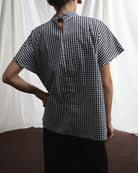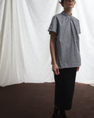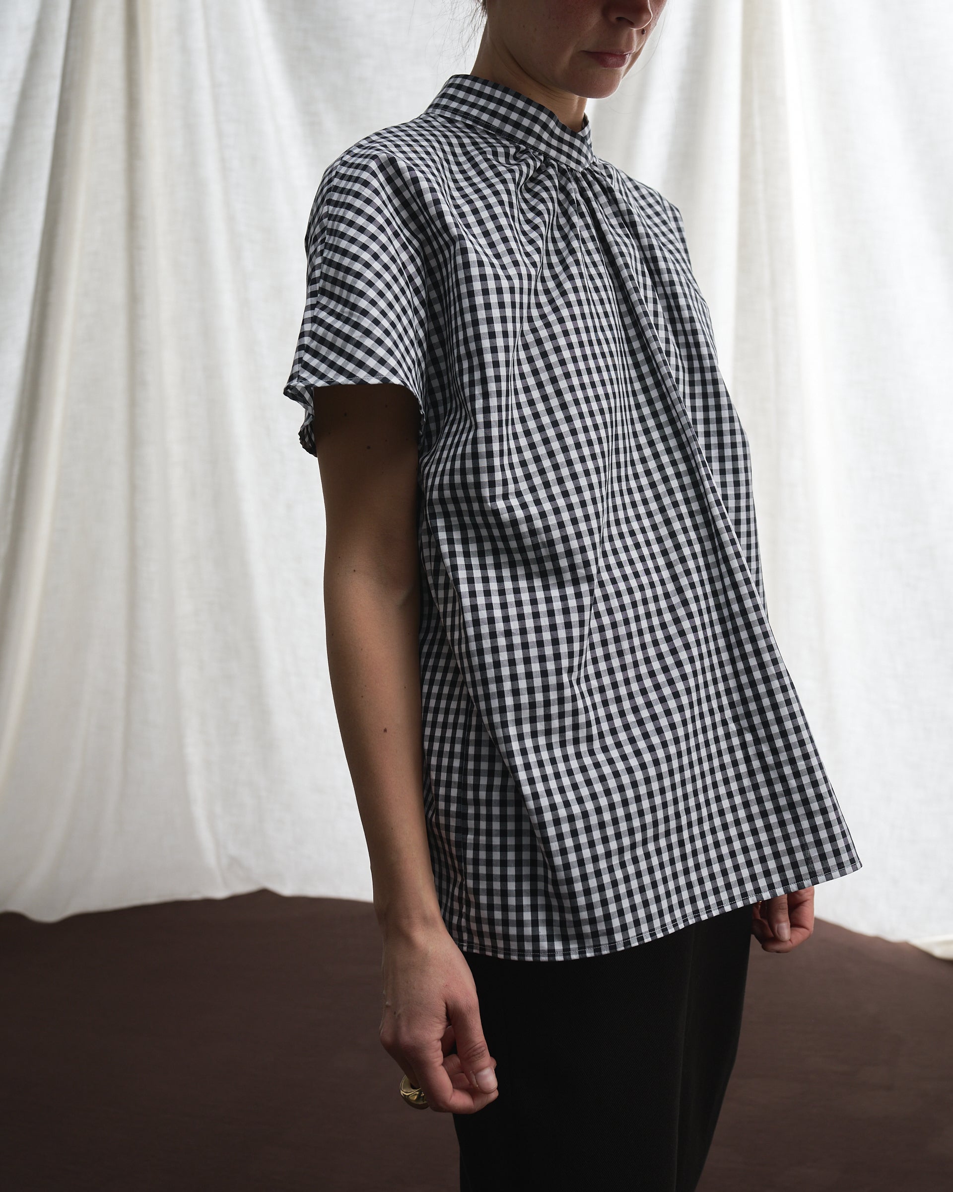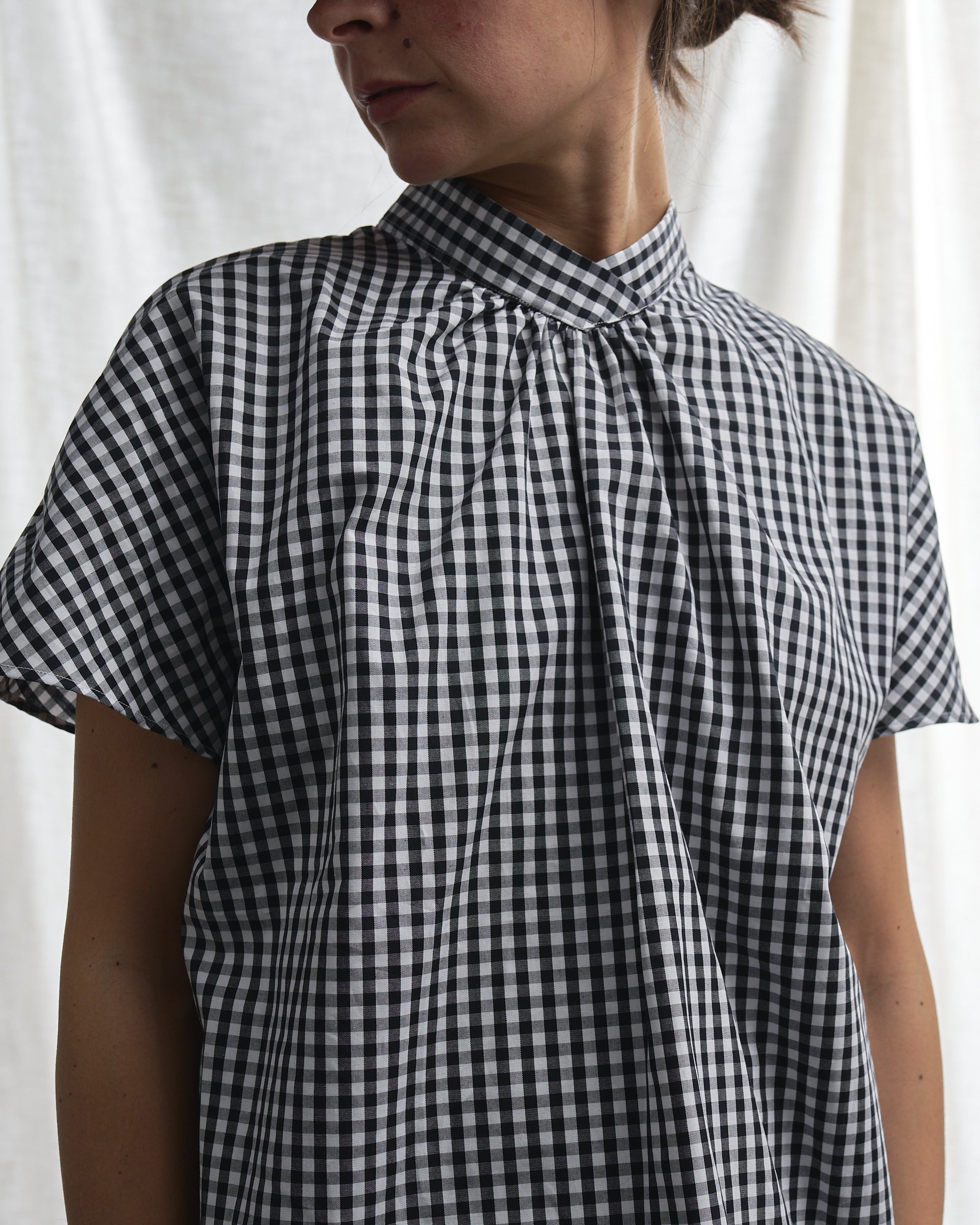 Top over con allacciatura sul collo, con bottoni in madreperla, apertura a goccia sulla schiena e colletto alla coreana, svasato e impreziosito da una leggera arricciatura, tutti dettagli che rendono questo top kimono a mezza manica versatile e pratico, oltre che elegante e femminile.