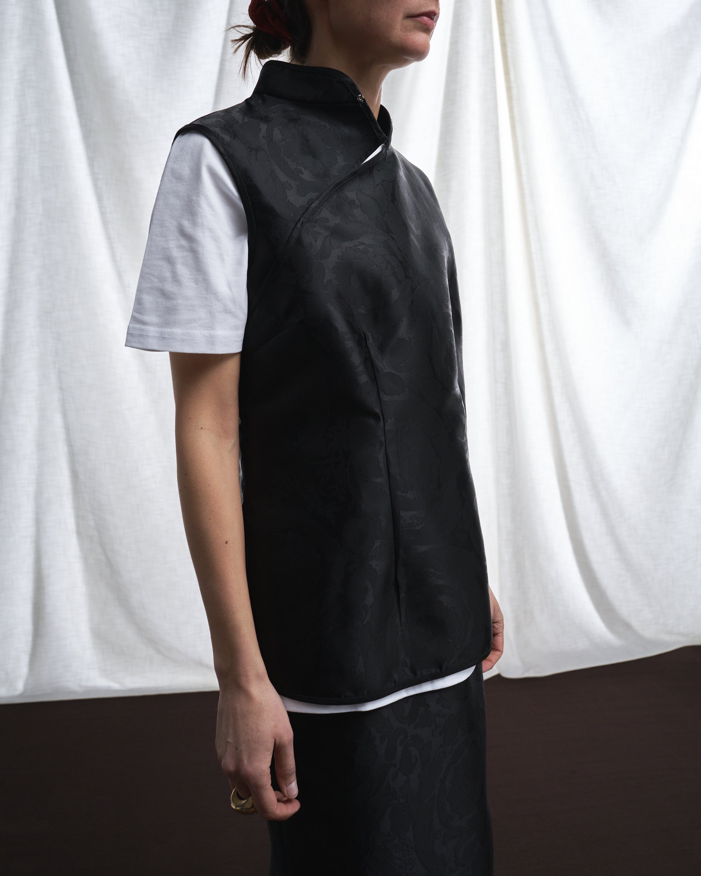 Ispirato all’eleganza raffinata del Qipao, il top Macao è un capo esclusivo, realizzato in un pregiato tessuto damascato in edizione super limitata.
