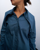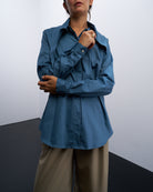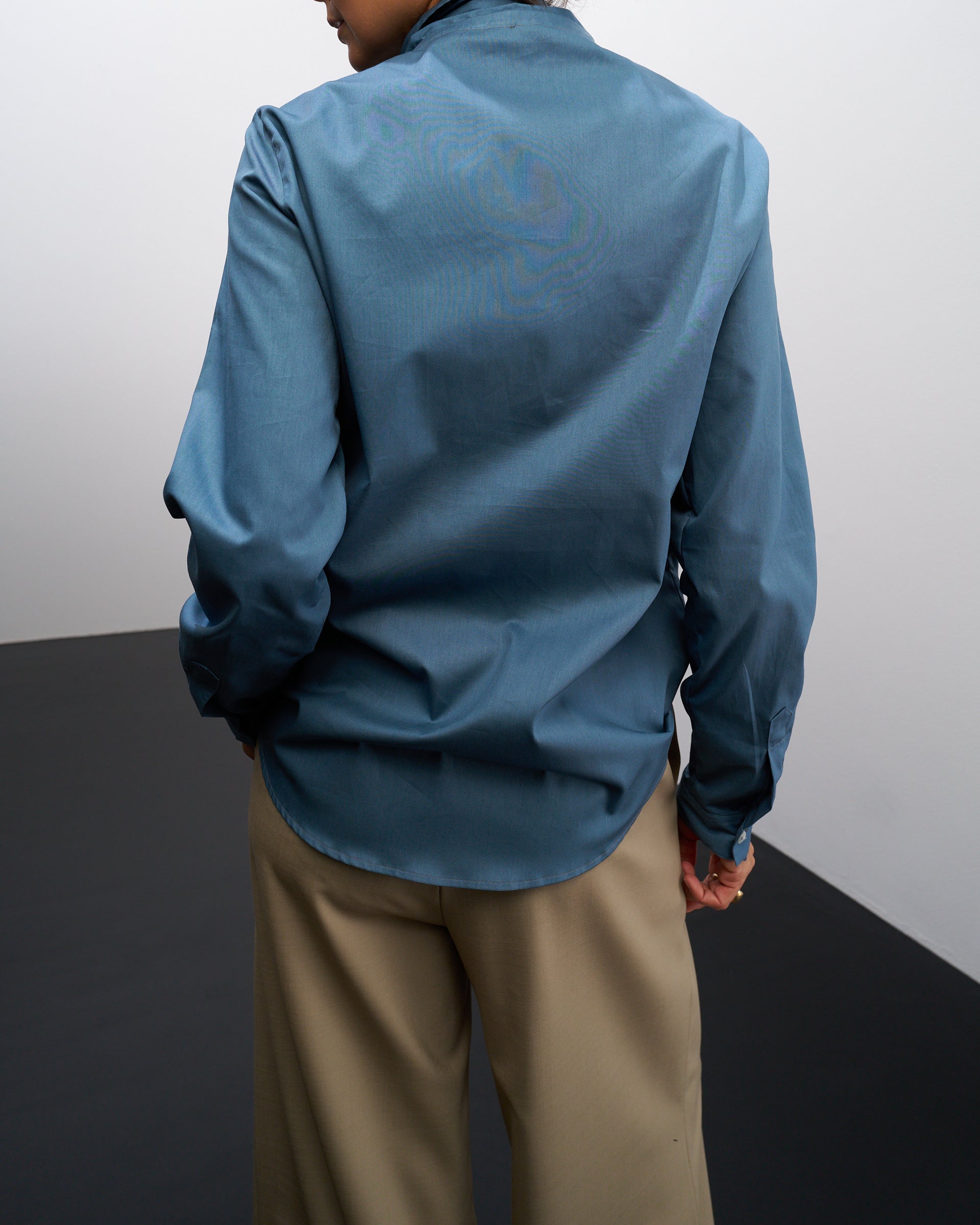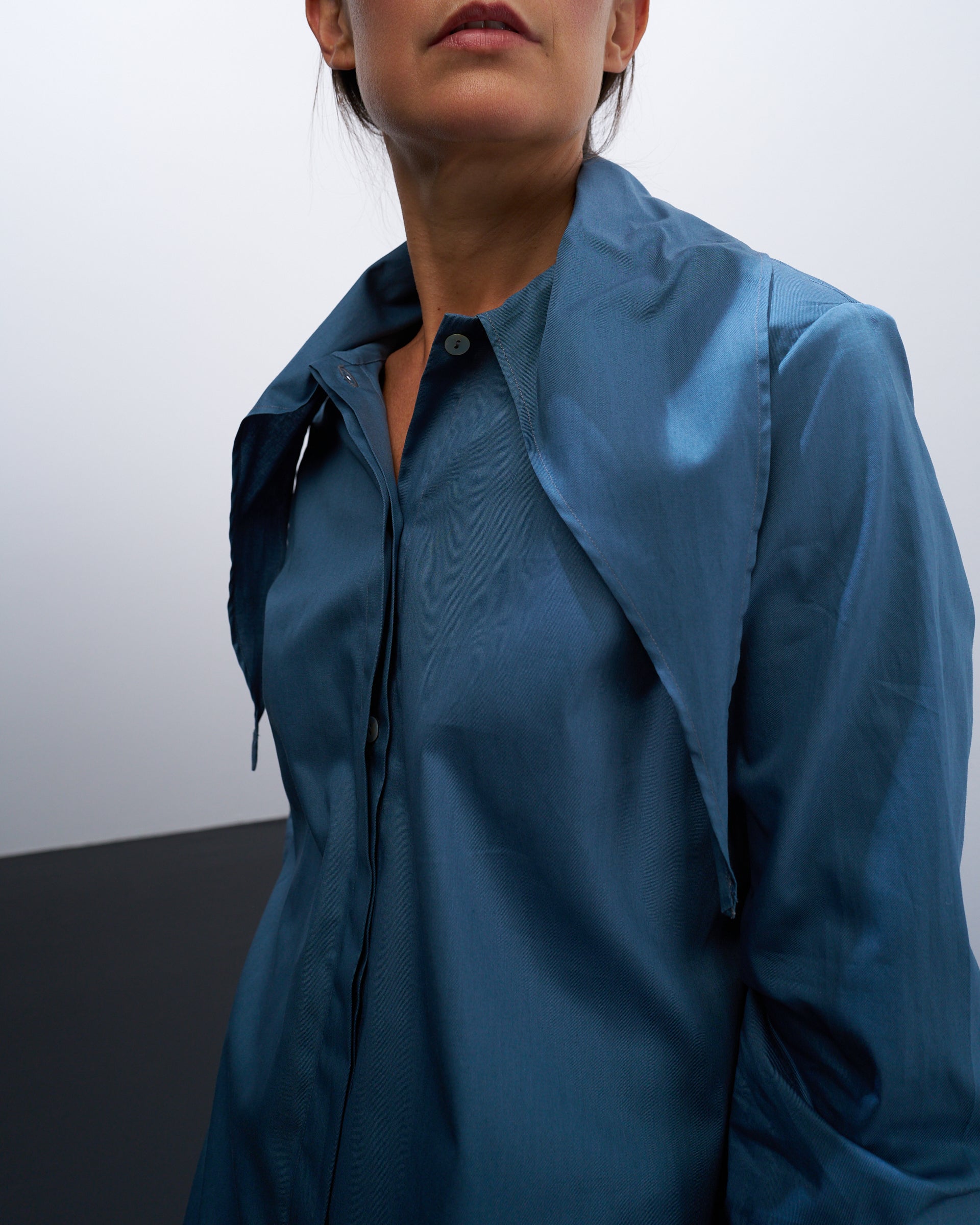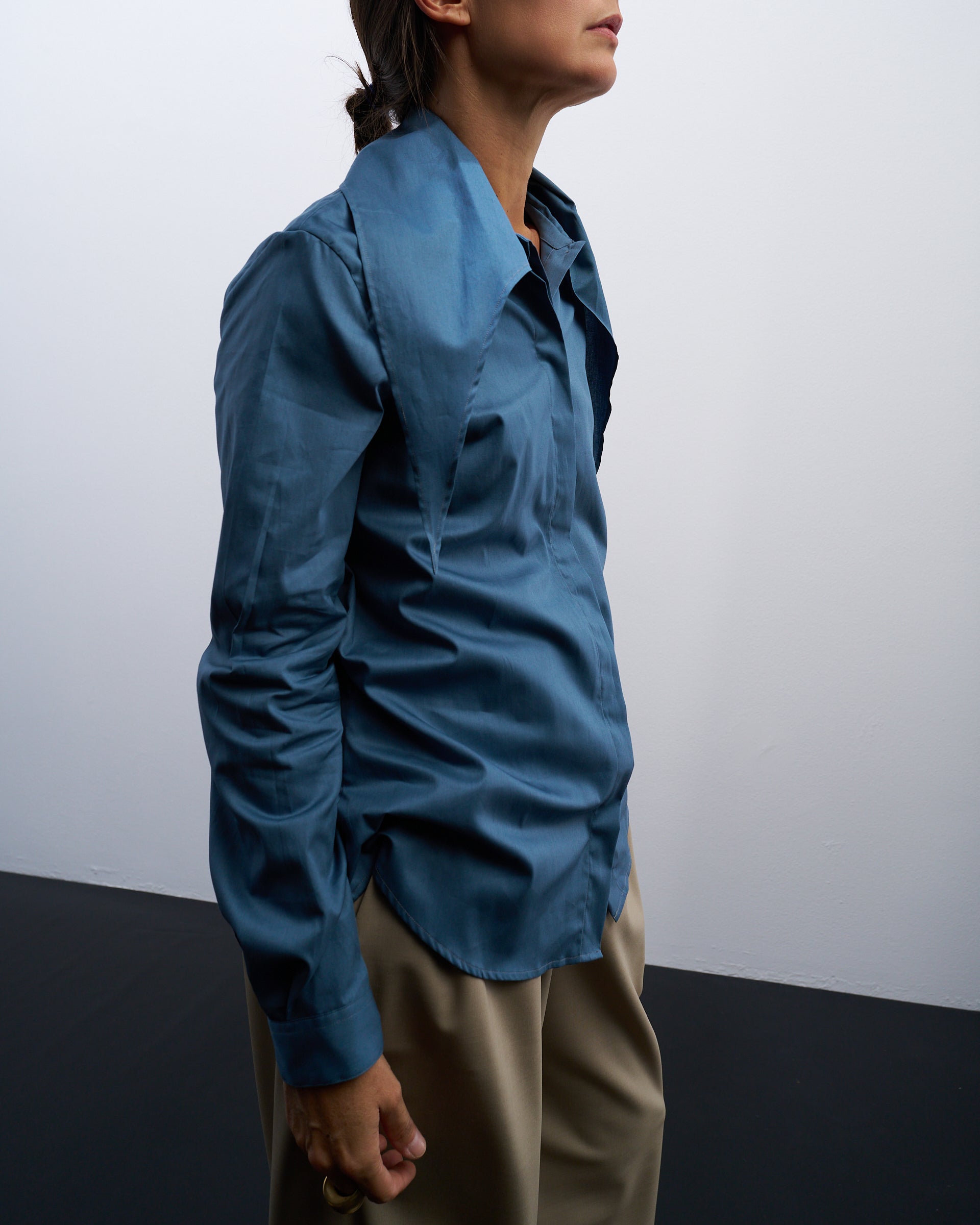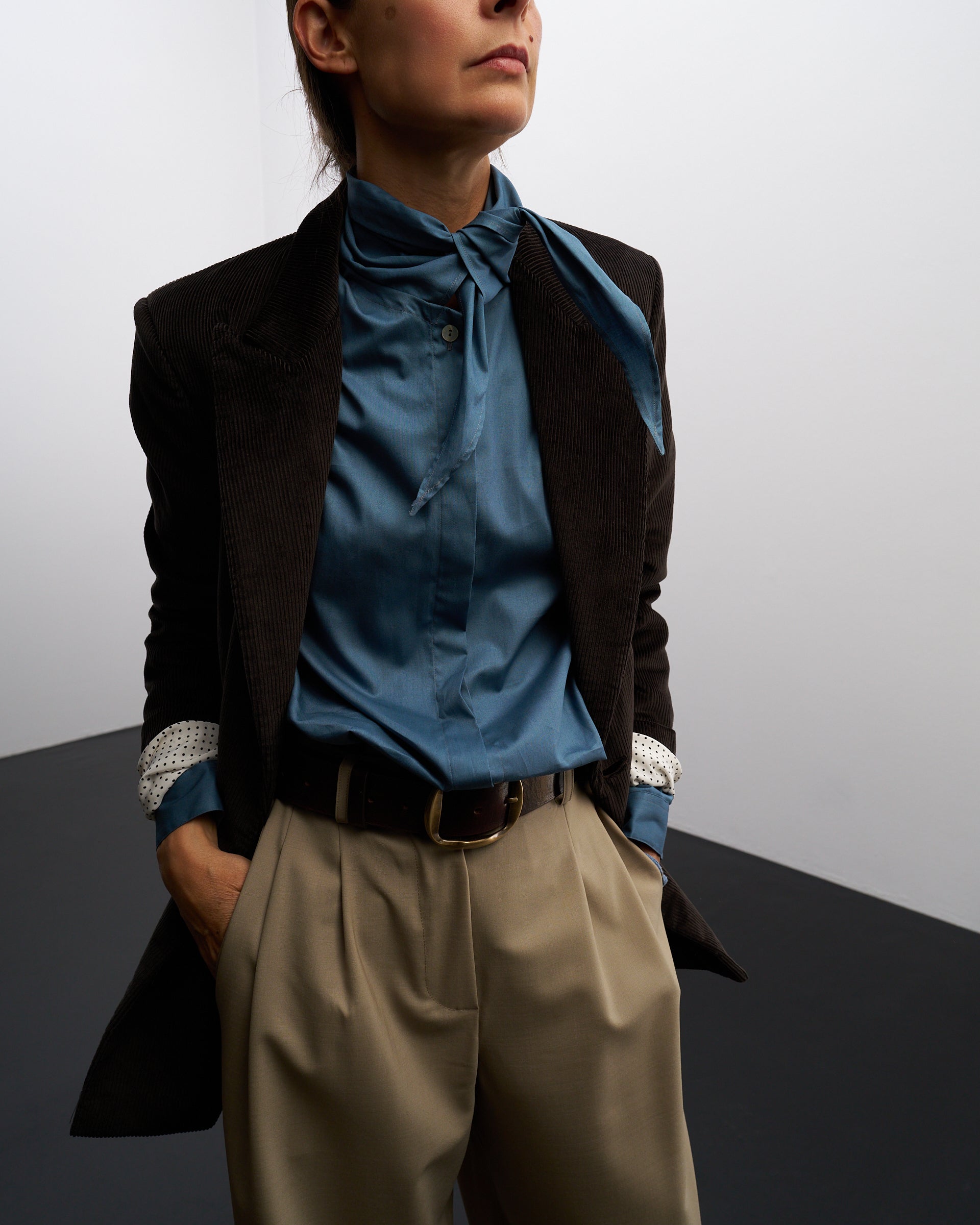 La silhouette leggermente sciancrata, le maniche lunghe e non troppo ampie, i bottoni coperti e soprattutto il collo a fiocco, la rendono davvero unica.