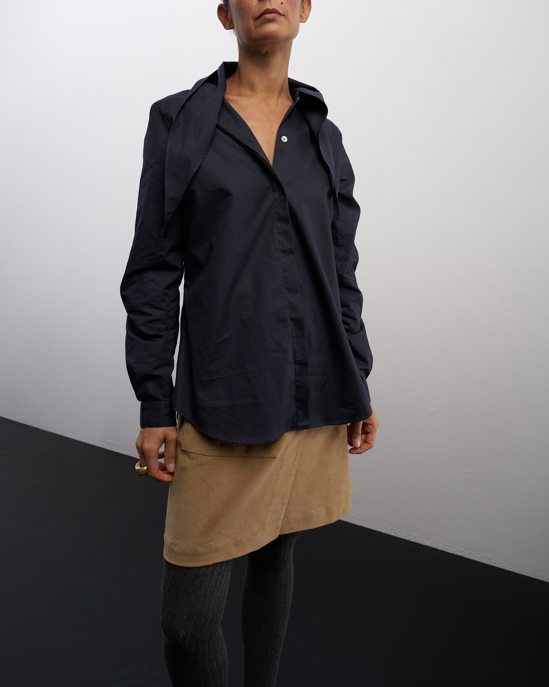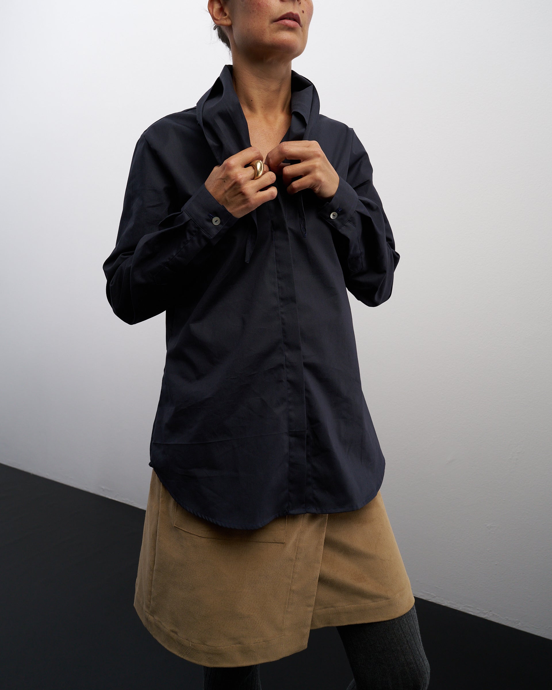 Il collo può essere lasciato slacciato e aperto e appoggiarsi sul davanti (anche se avete una maglia sopra la camicia) oppure essere allacciato a formare un piccolo fiocco.