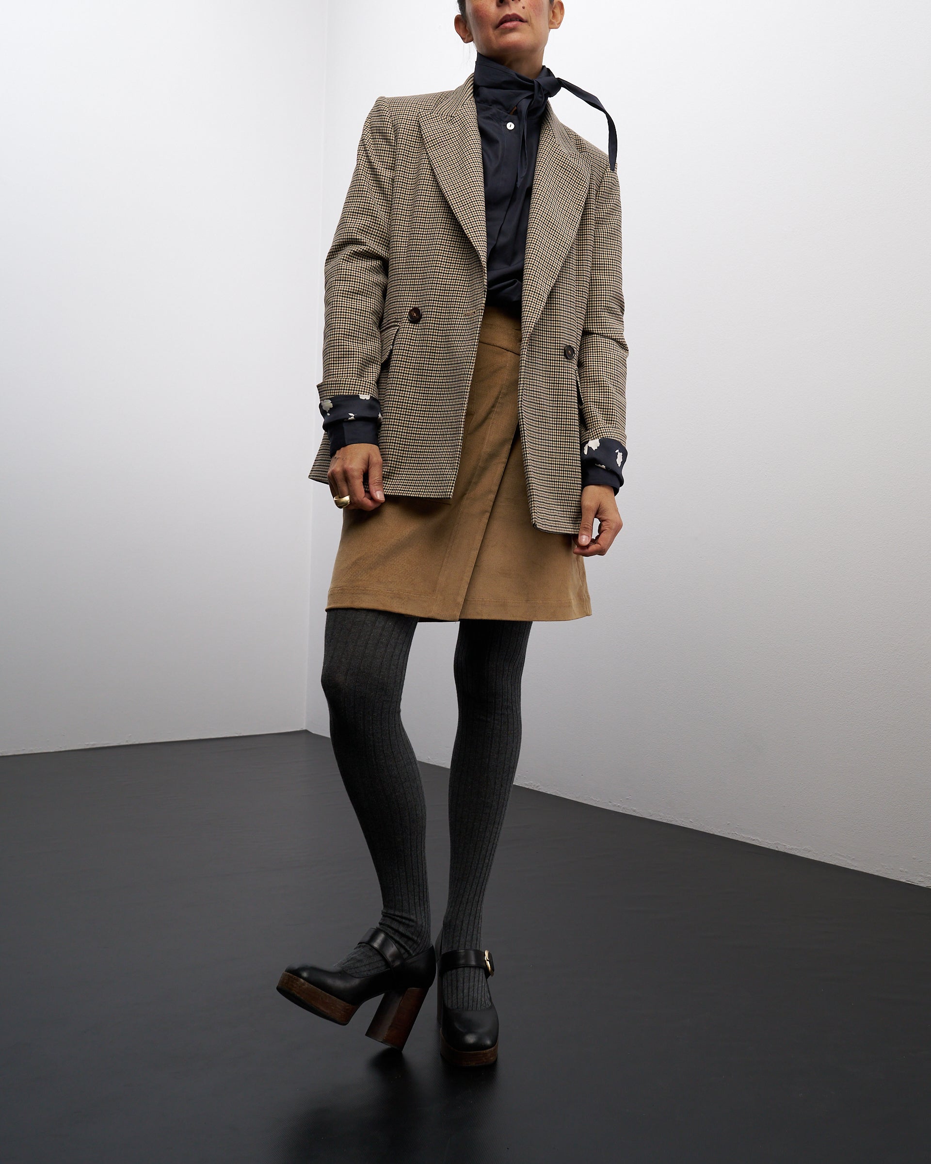 La silhouette leggermente sciancrata, le maniche lunghe e non troppo ampie, i bottoni coperti e soprattutto il collo a fiocco, la rendono davvero unica.