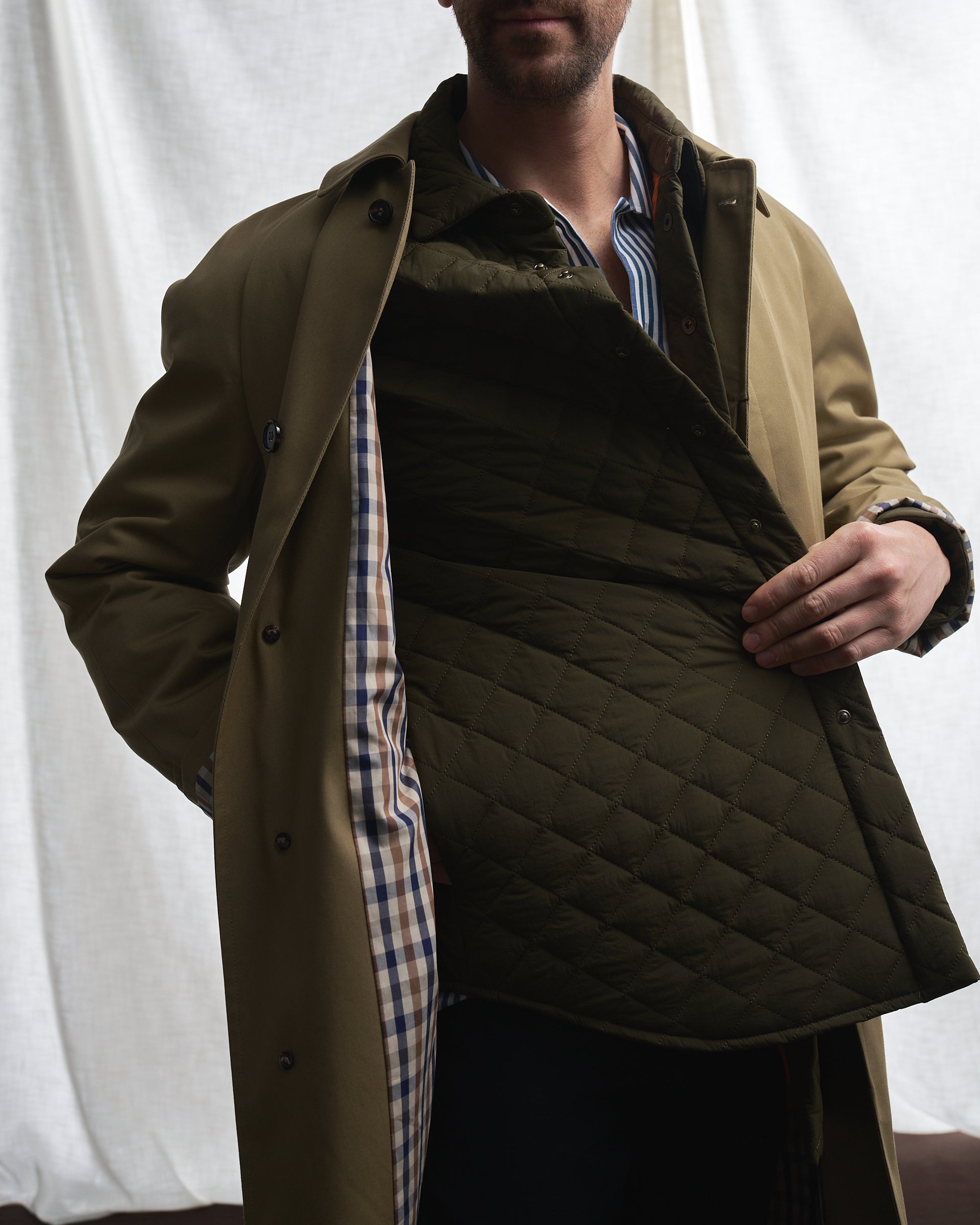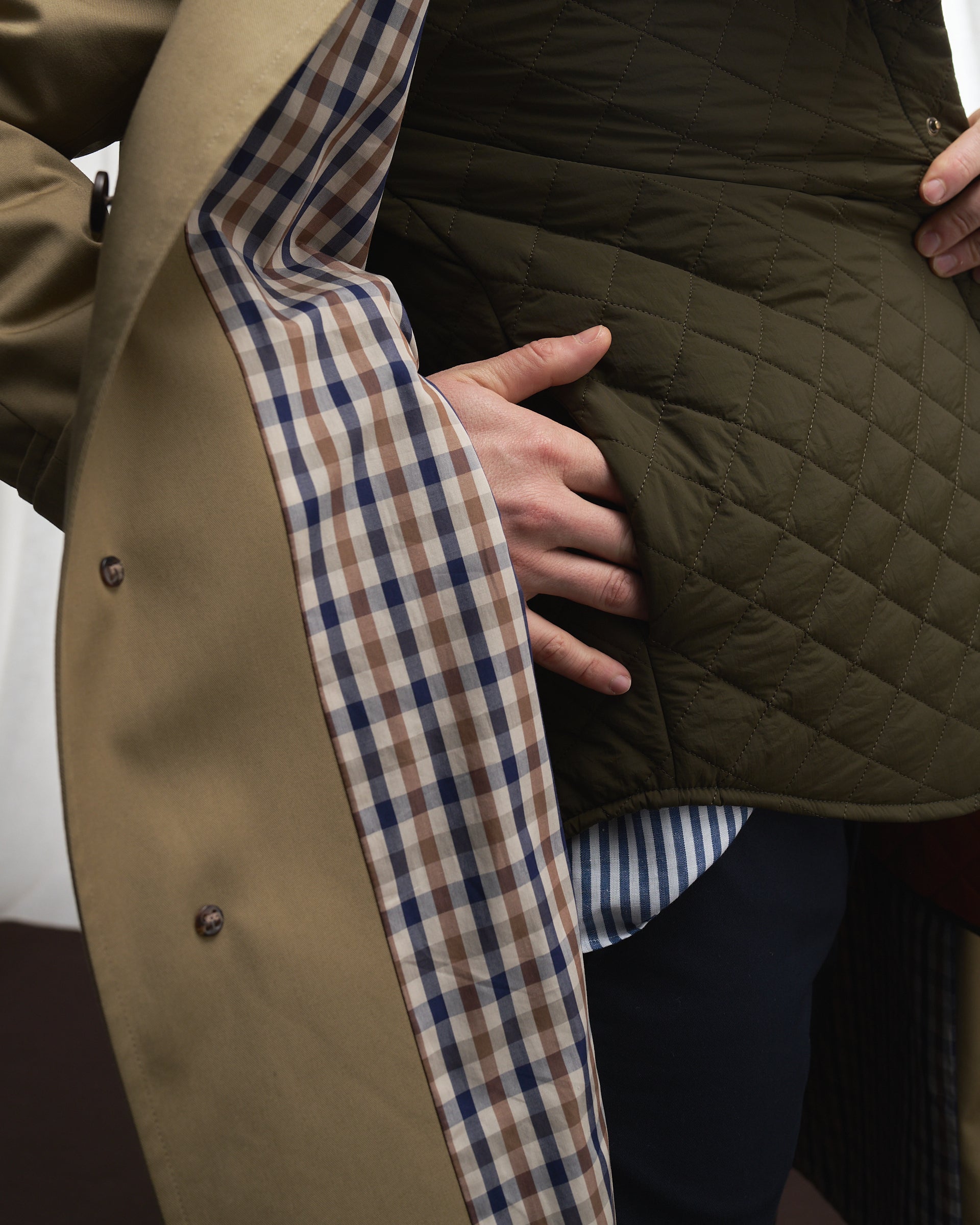 Gli elementi che caratterizzano questo capo sono la classica allacciatura sul davanti con bottoni coperti, il colletto rigoroso, i bottoni alle maniche e le tasche sul davanti, che sono anche passanti, per consentire di arrivare alle tasche dei pantaloni senza slacciare l’impermeabile.