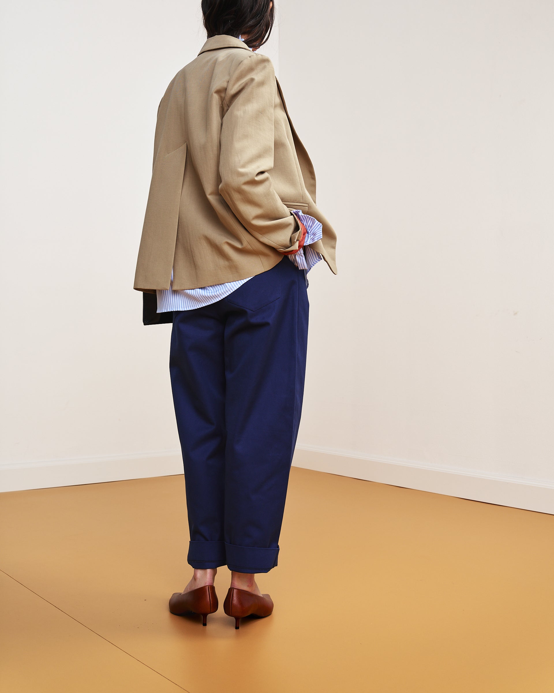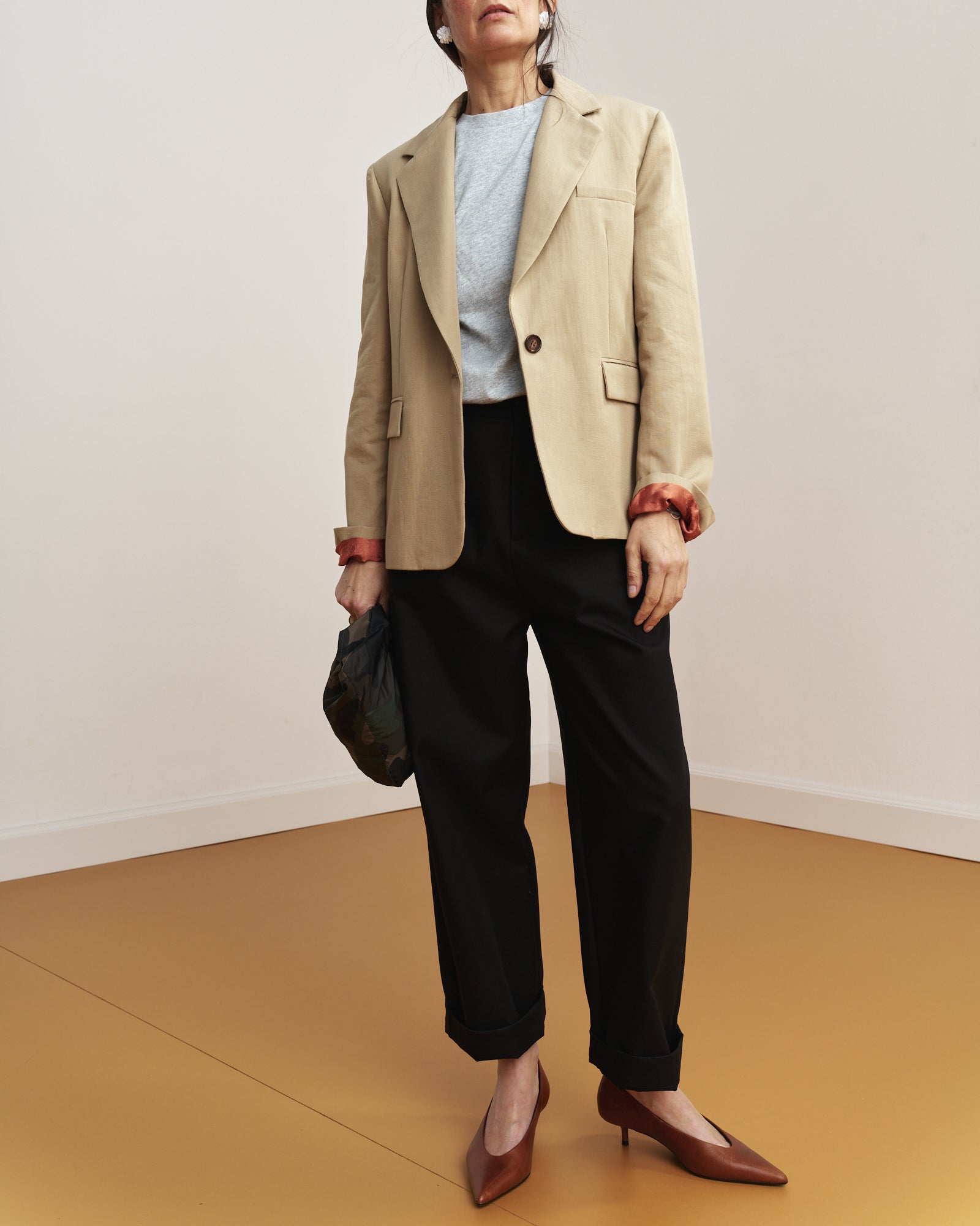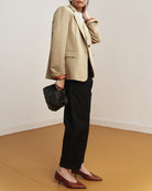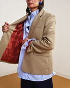 Le lance del bavero, le tasche laterali sul davanti, il finto taschino sul petto e la tasca interna richiamano la costruzione del blazer maschile e definiscono lo stile di questa giacca. Alcuni dettagli ne alleggeriscono il rigore, come la fodera interna in viscosa, il profondo spacco centrale sul retro e le maniche con spacchetto sul fondo al posto dei classici bottoni.
