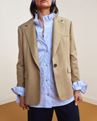 Primo è un blazer dalla classica impostazione monopetto, chiuso con un unico bottone, dalla linea pulita ed elegante.