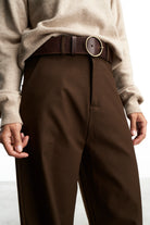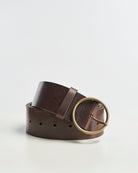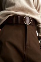 Cintura liscia, in pelle color testa di moro, h. 5 cm, con fibbia tonda, prodotta in Italia.