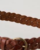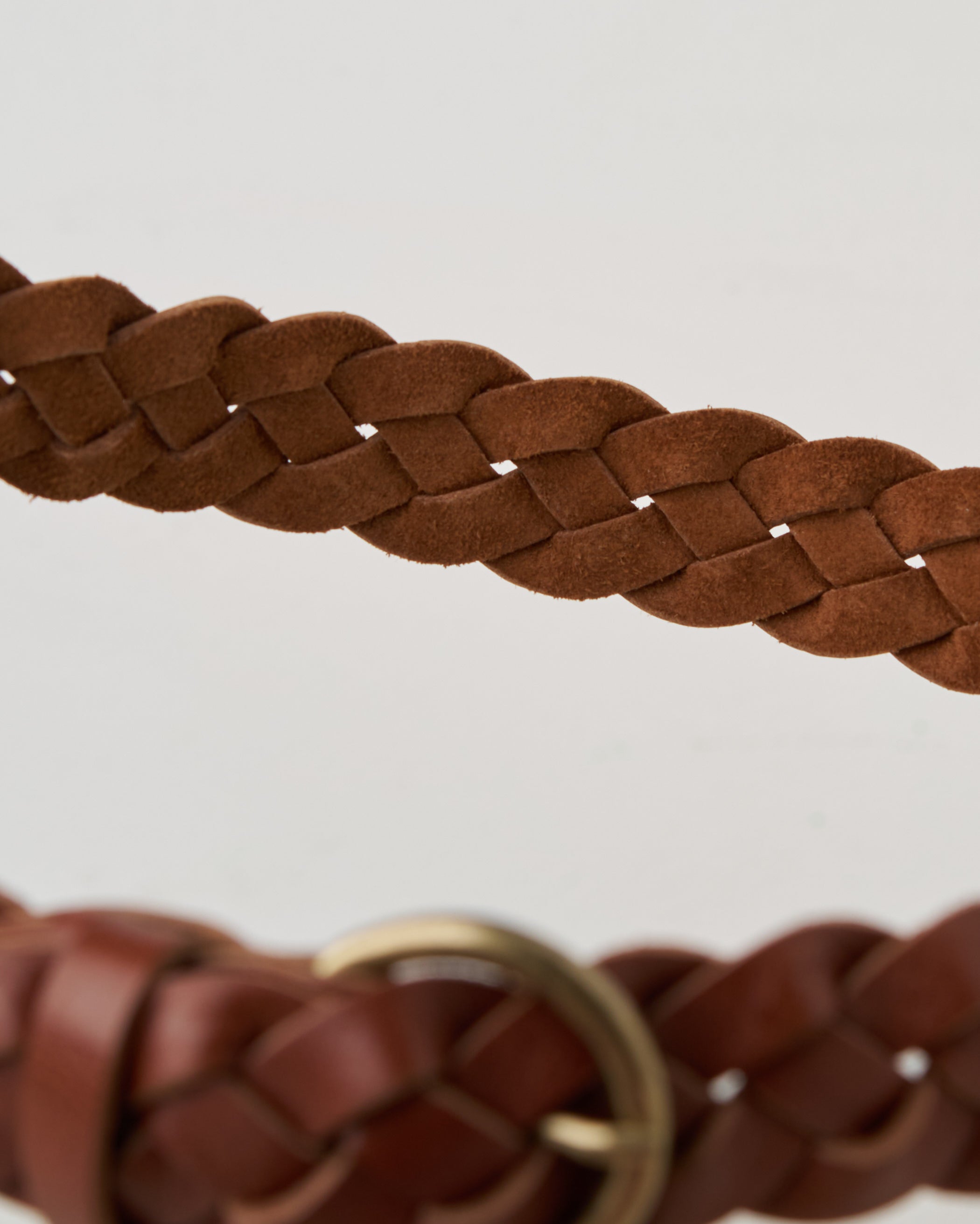 Cintura intrecciata, h. 3 cm, in color cuoio, con fibbia tonda galvanica bronzo invecchiato, prodotta in Italia.