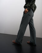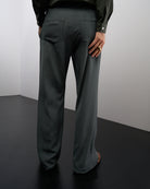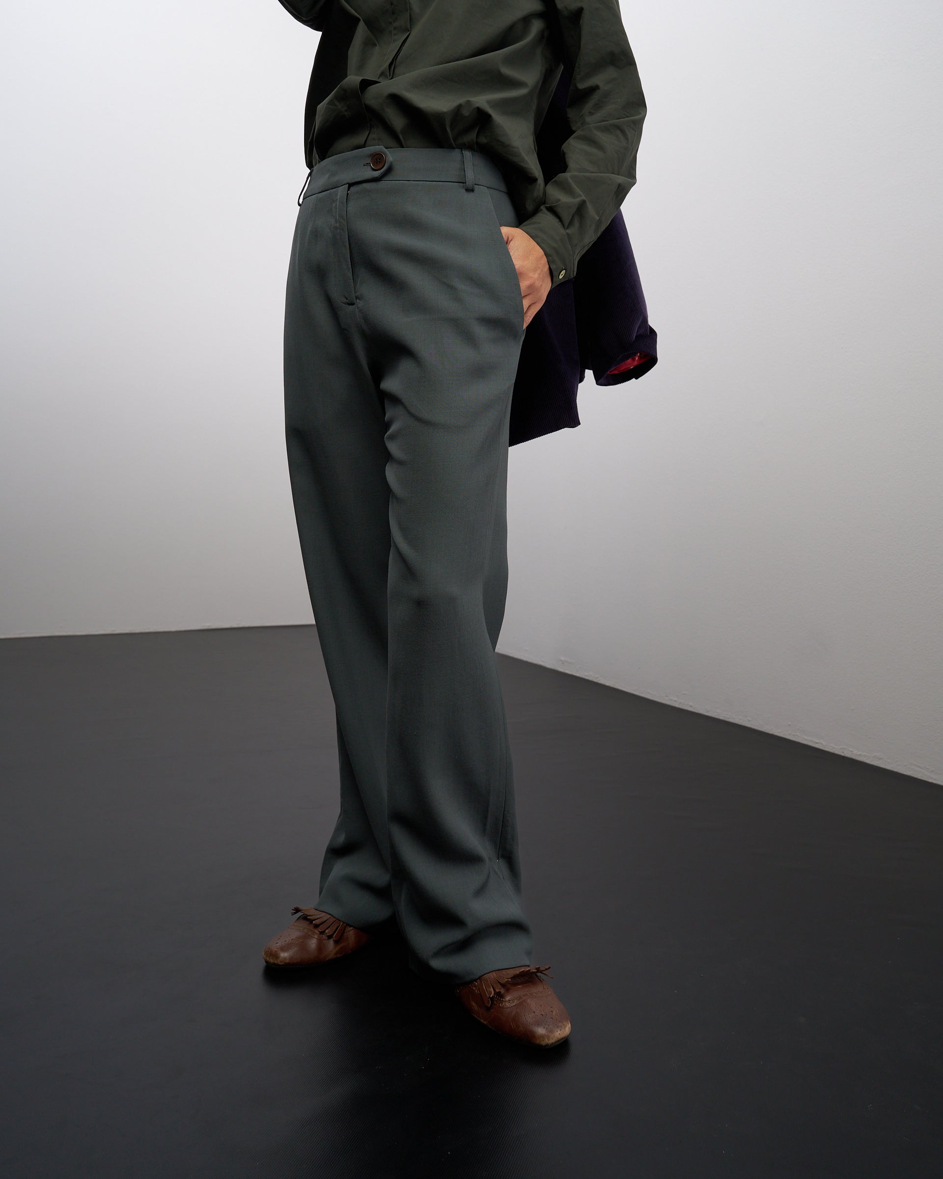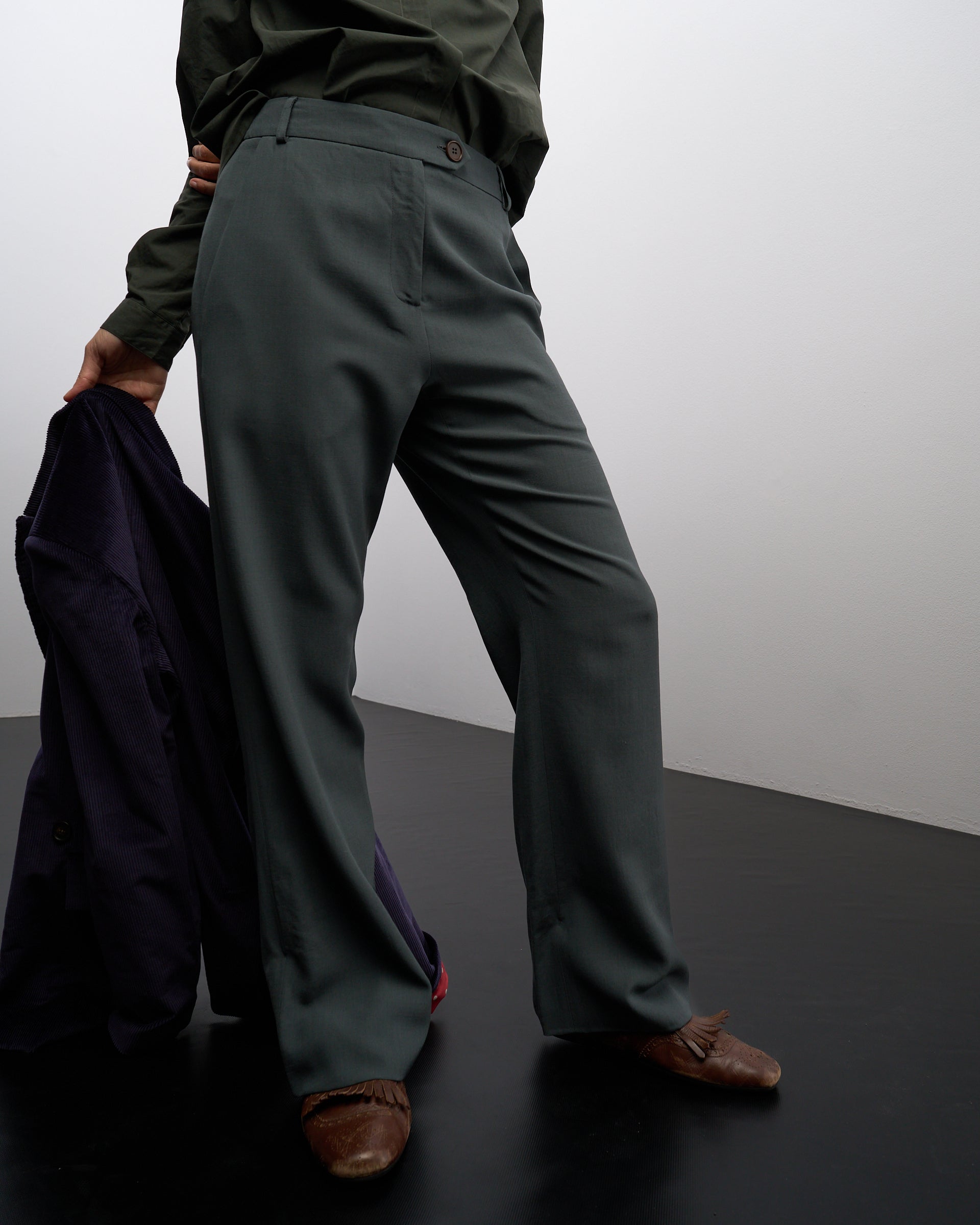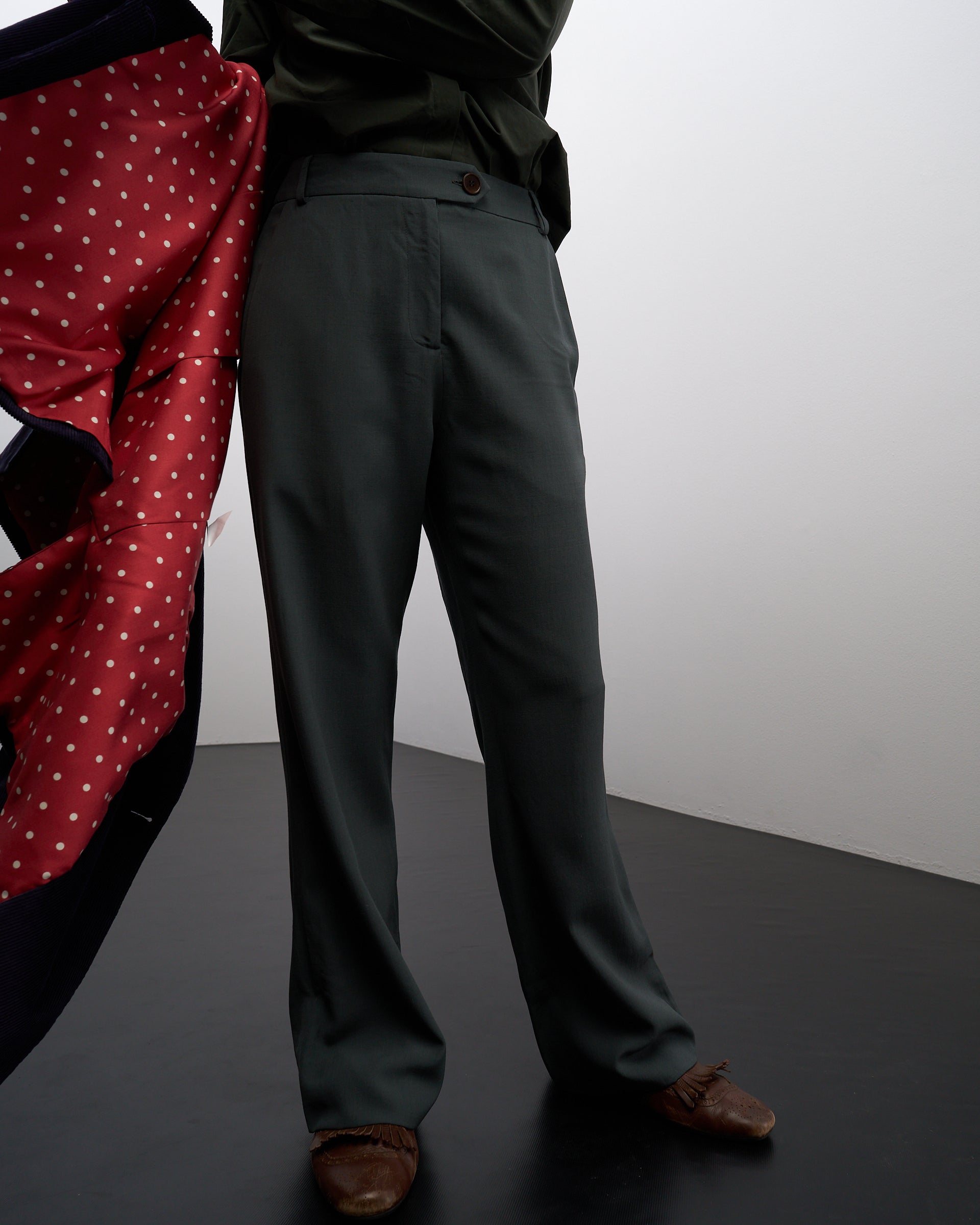 Un pantalone classico, con gamba dritta e ampia, tasche alla francese, vita media e cintura con passanti in vita e allacciatura con doppio bottone.