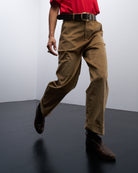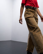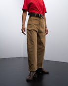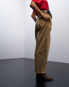 Piuttosto ampio sulla gamba, che va stringendosi alla caviglia, con una silhouette baggy e il cavallo basso.