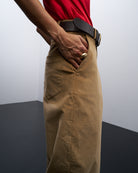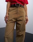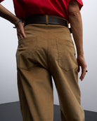 Ha cinta e passanti in vita da 4,5 cm e tasche alla francese sul davanti, chiusura con zip e bottone in corozo bruno.