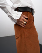 Ha cinta e passanti in vita da 4,5 cm e tasche alla francese sul davanti, chiusura con zip e bottone in corozo bruno.