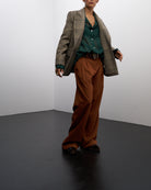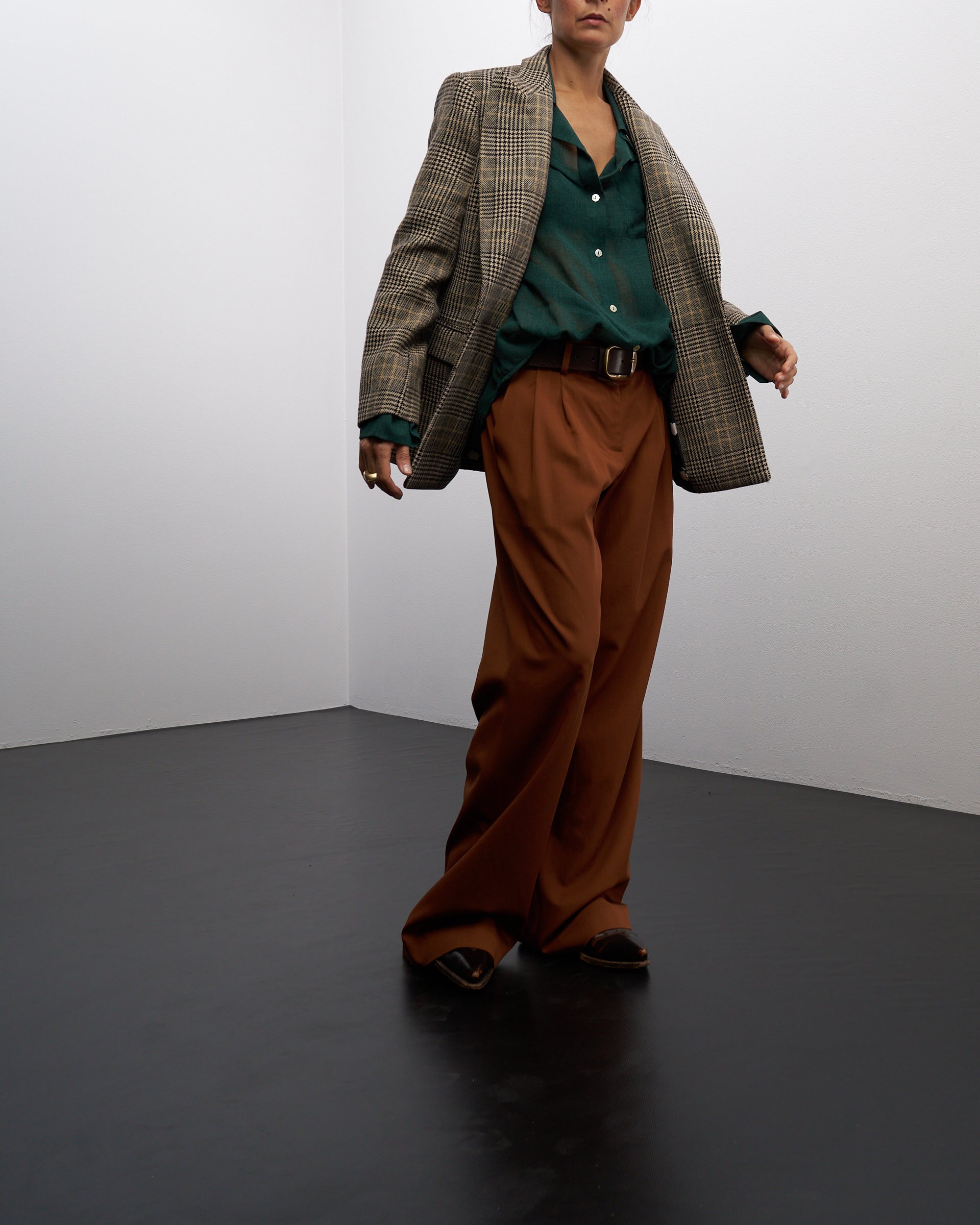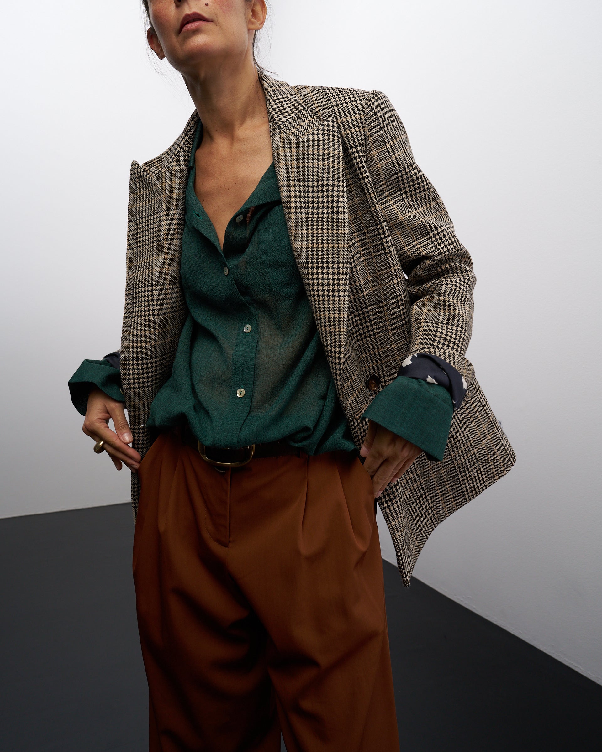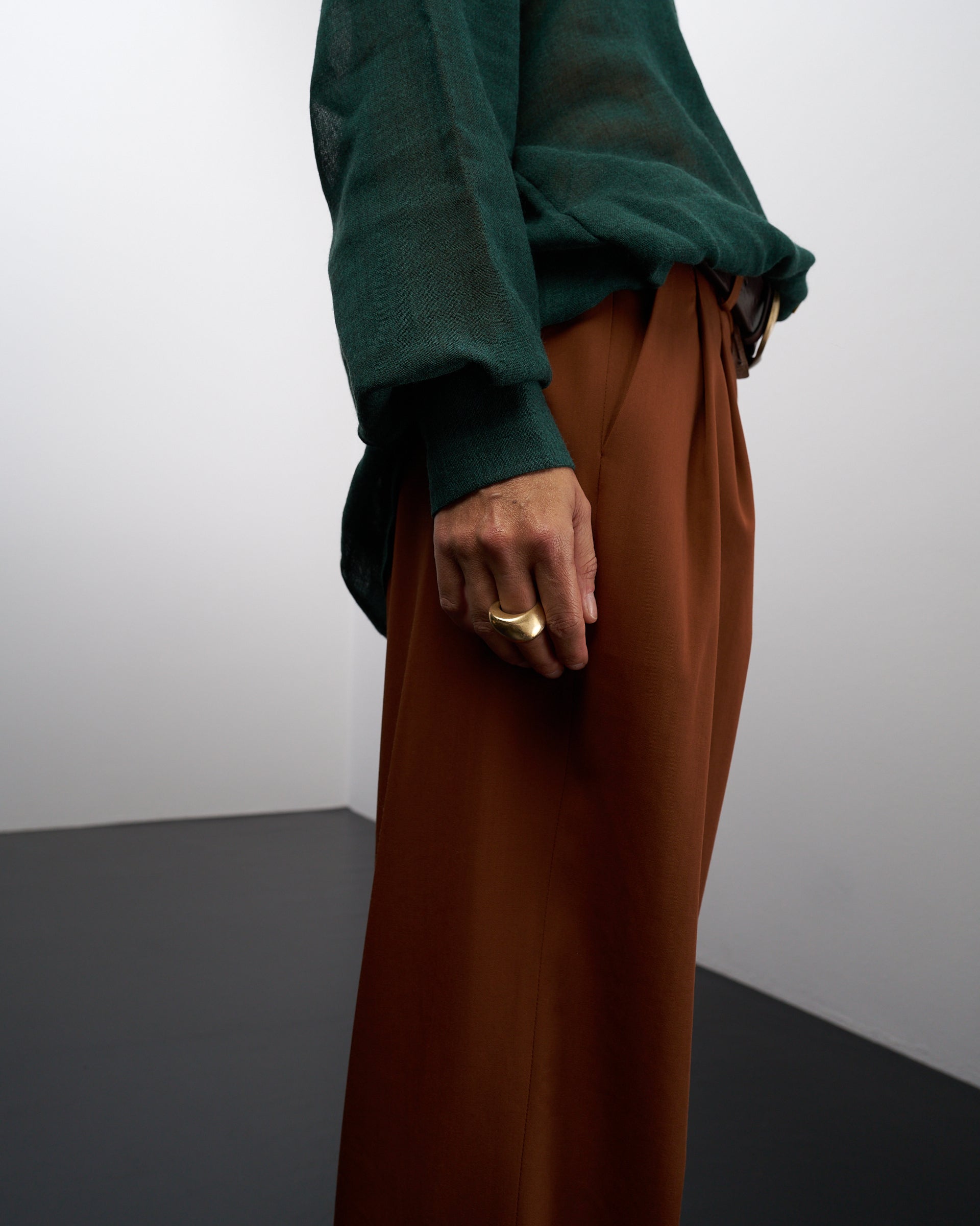 Il pantalone Orlando, è un capo dal taglio maschile, con gamba dritta e ampia, vita media e irriverenti dettagli maschili, come la cintura preformata in vita, che incontrano la femminilità e l'eleganza senza tempo di un pantalone di qualità.