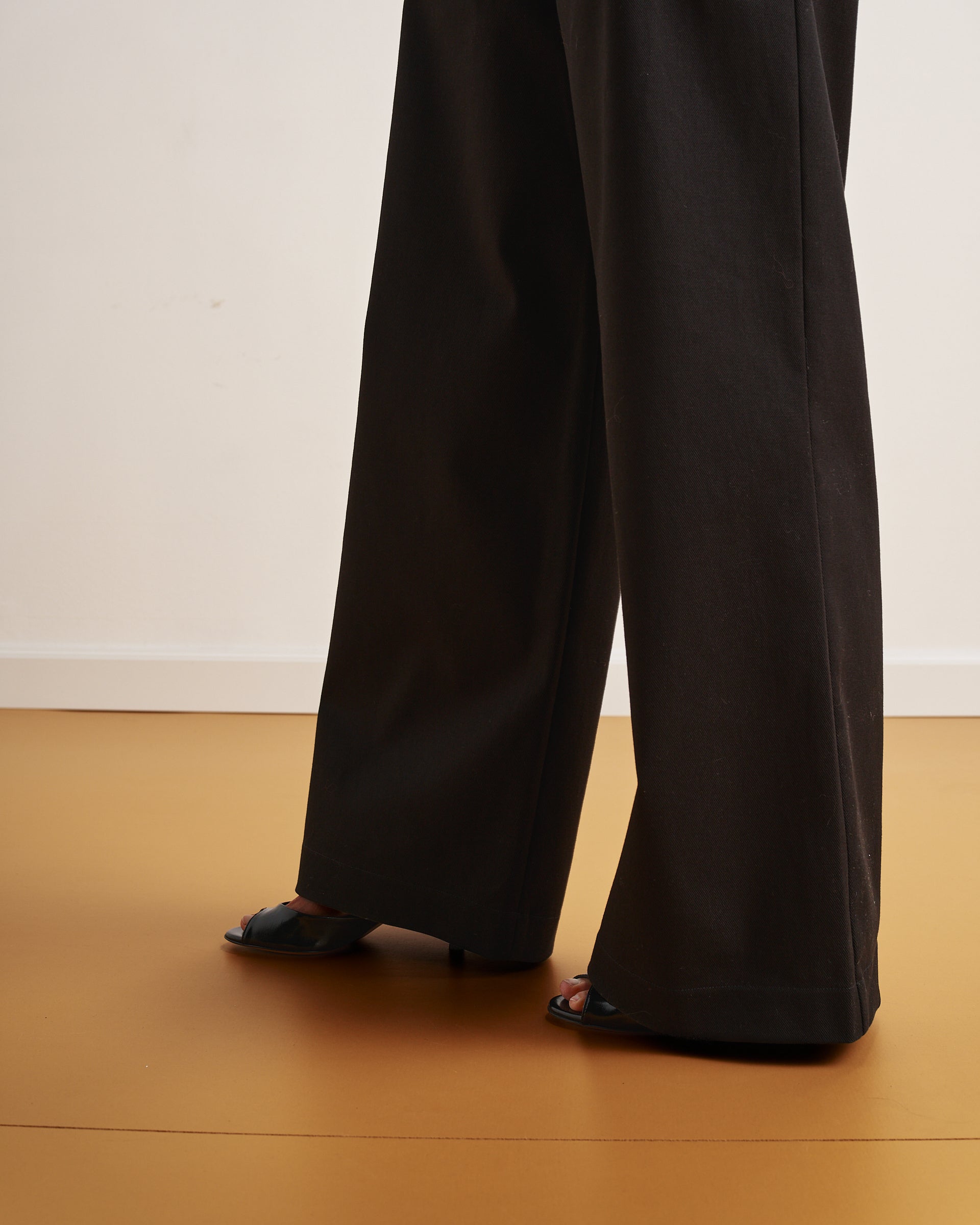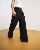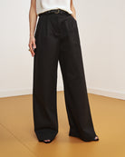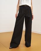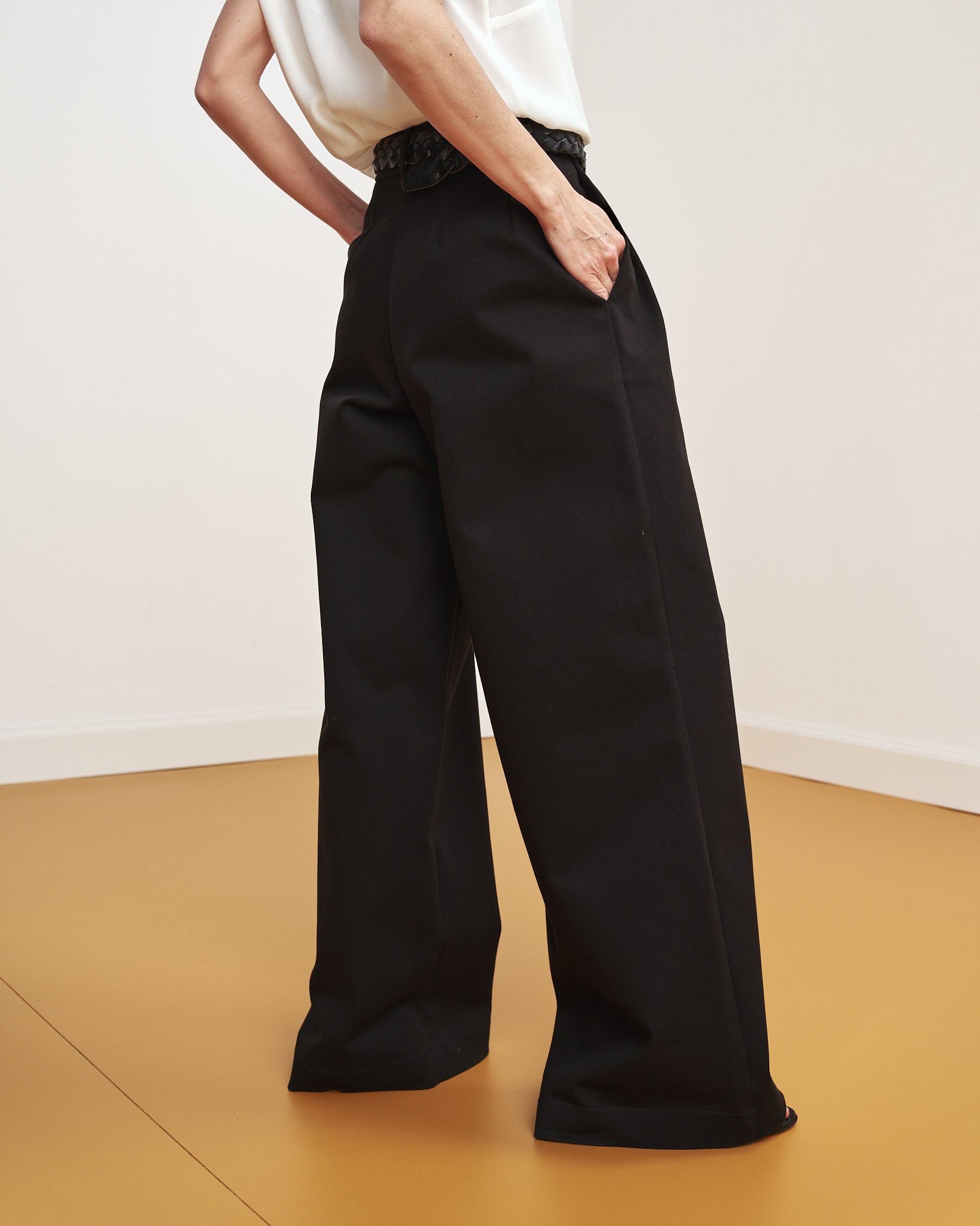 Un pantalone palazzo a vita alta, con gamba ampia e linea di ispirazione maschile, reinterpretata con eleganza e femminilità.