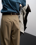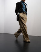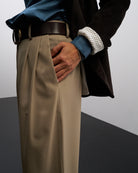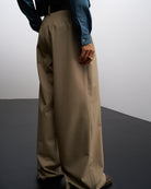Un pantalone palazzo con gamba ampia, a vita alta, dai forti e irriverenti dettagli maschili, che incontrano la femminilità e l'eleganza senza tempo di un pantalone di qualità.