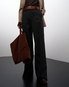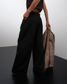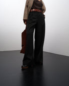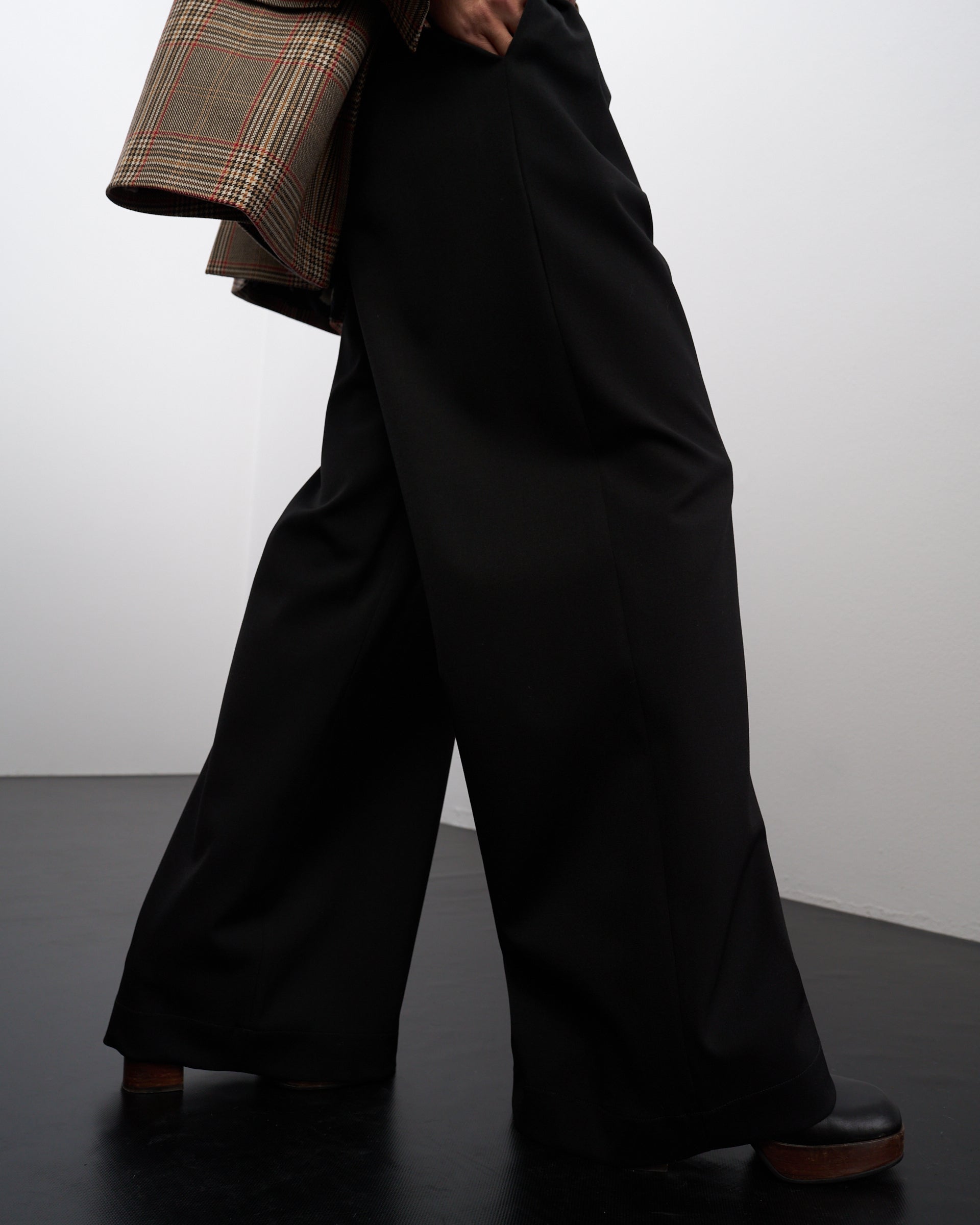 Un pantalone palazzo con gamba ampia, a vita alta, dai forti e irriverenti dettagli maschili, che incontrano la femminilità e l'eleganza senza tempo di un pantalone di qualità.