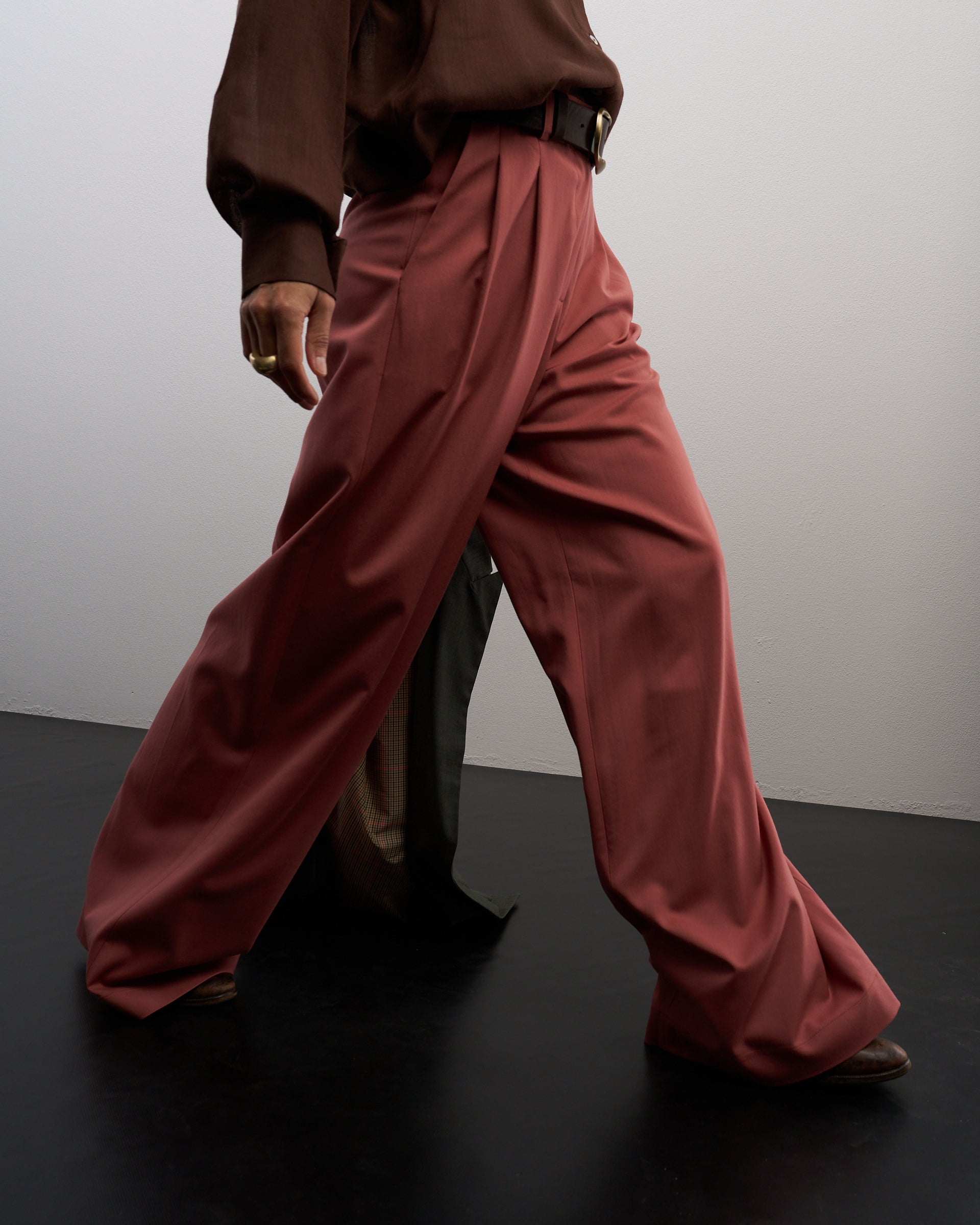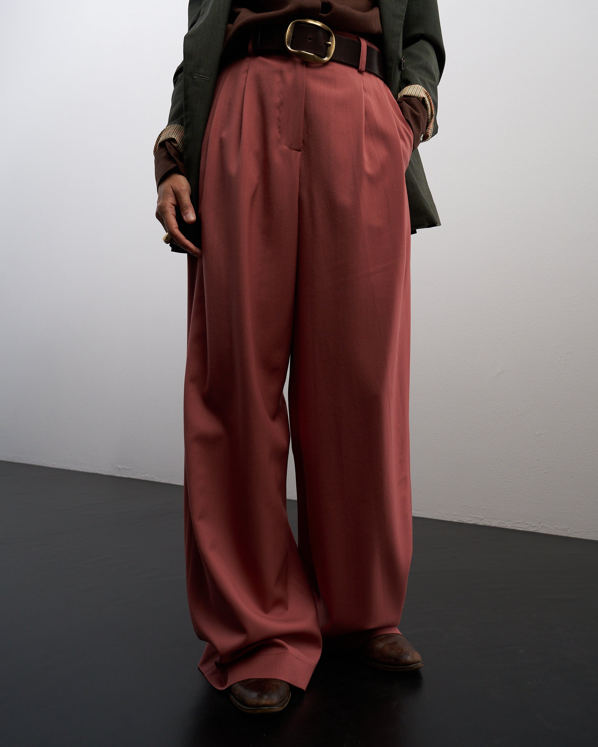 Un pantalone palazzo con gamba ampia, a vita alta, dai forti e irriverenti dettagli maschili, che incontrano la femminilità e l'eleganza senza tempo di un pantalone di qualità.
