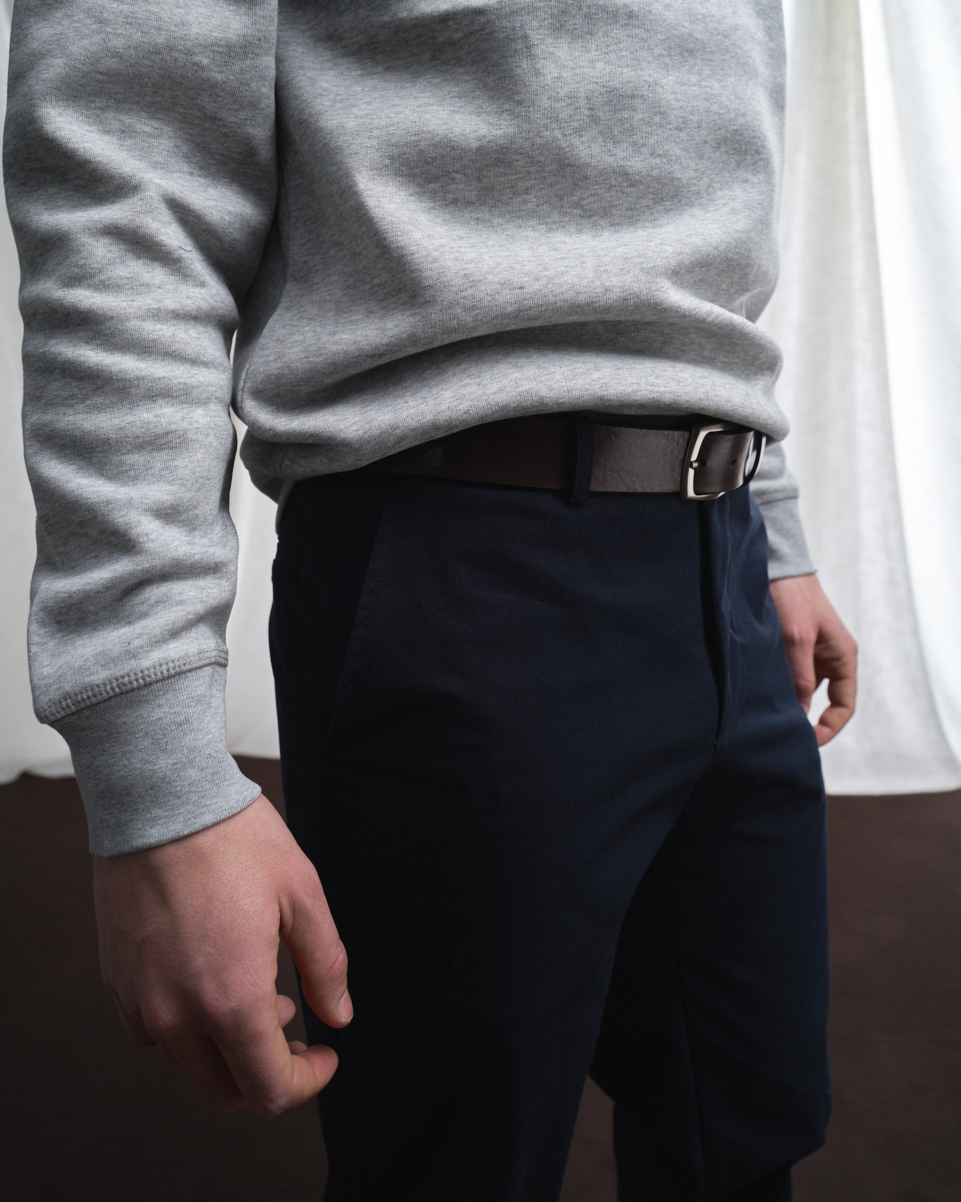 Quì nella versione con le classiche maniche a giro; colletto, polsini e bordo inferiore a costine; nastrino di rinforzo con motivo spigato sull’interno collo; impuntura piatta su tutte le cuciture; mezzaluna (con logo ricamato) sull’interno del collo nel tessuto principale.
