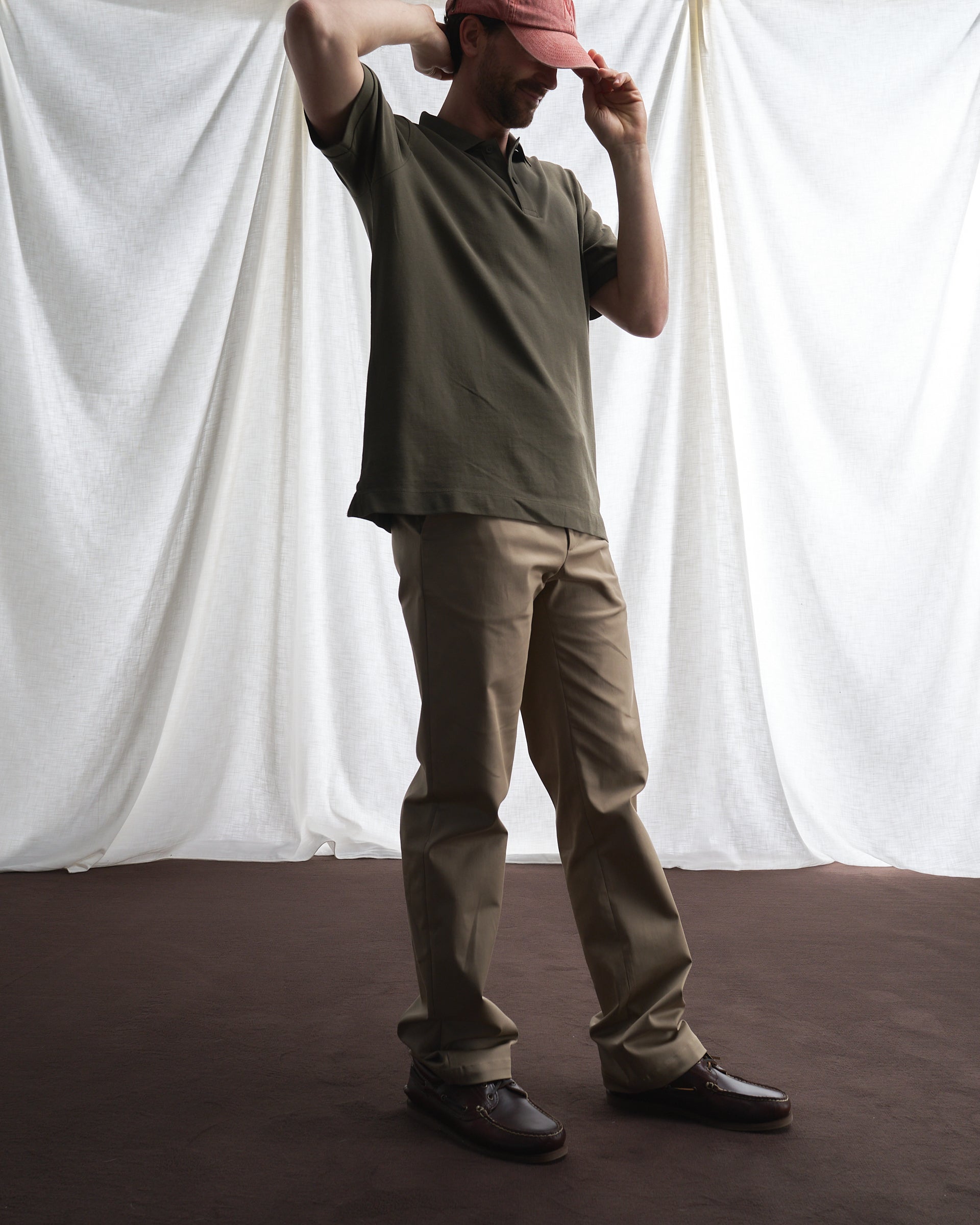 Il cannoncino anteriore inserito con due bottoni in tinta con il corpo, aggiunge un tocco di raffinatezza, arricchito dallo spacco e dalla finitura con travetta sull'orlo della cucitura laterale. Inoltre, la cucitura con ago singolo sulle spalle e l'orlo inferiore rifinito con cucitura stretta a doppio ago garantiscono resistenza e durata nel tempo.