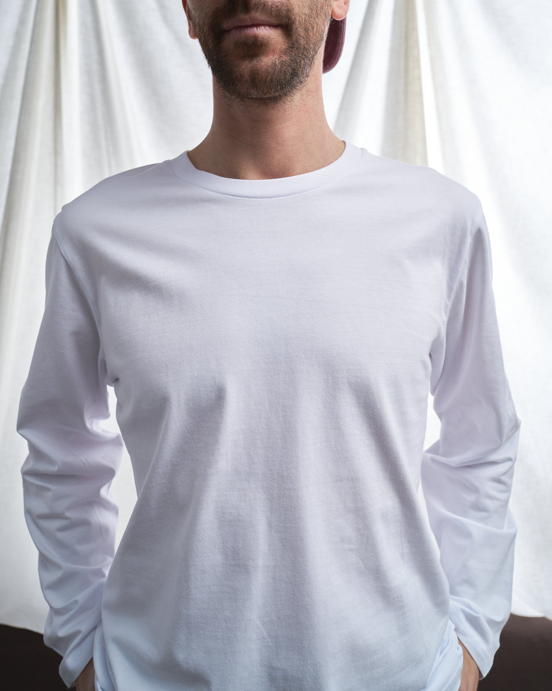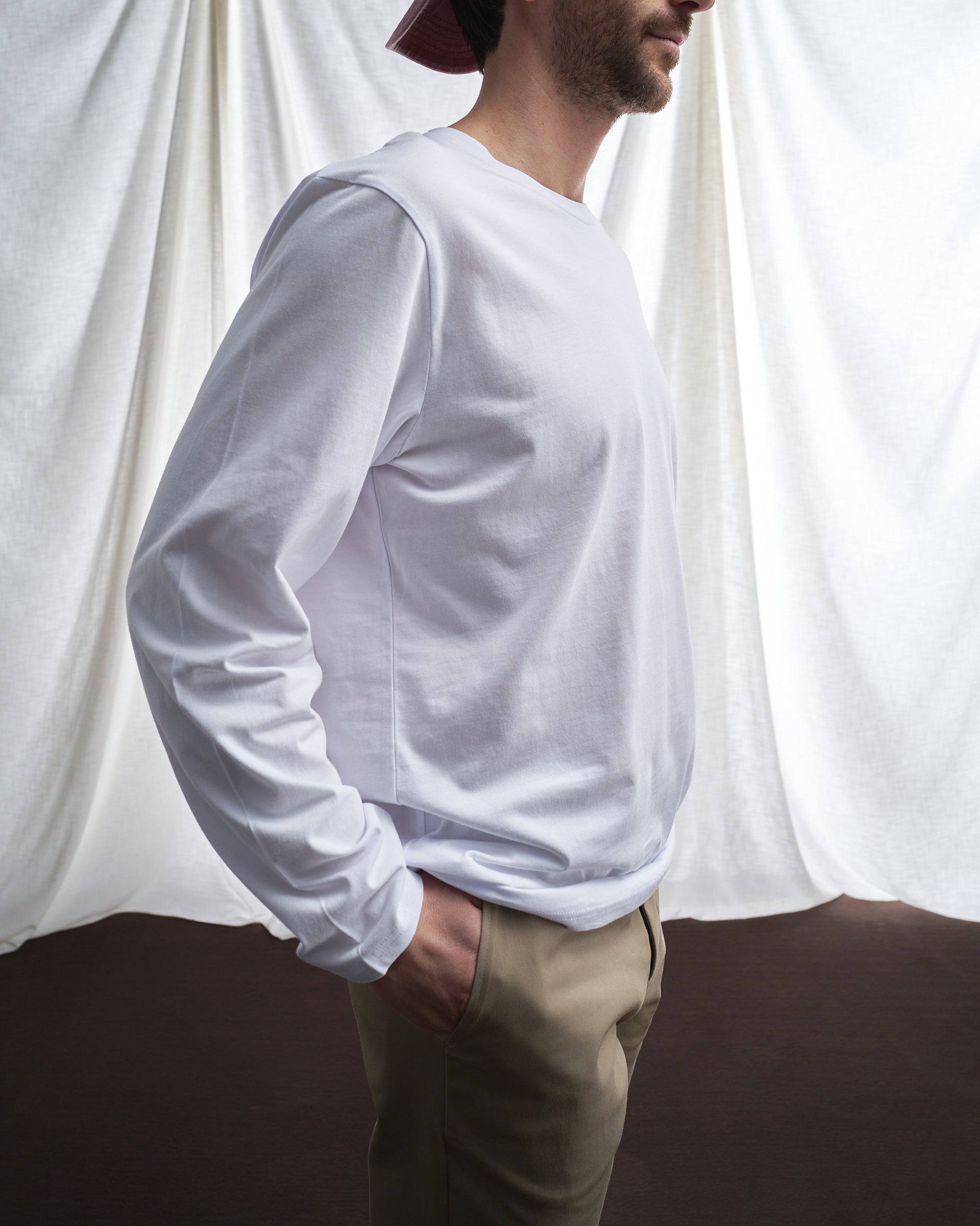 Realizzata in jersey 100% cotone biologico filato e pettinato, è morbida sulla pelle e perfetta per ogni stagione. Il colletto in costina garantisce una vestibilità curata, mentre il nastro interno in tessuto sul collo aggiunge struttura e resistenza. Le maniche a giro e le finiture a doppio ago su polsini e orlo conferiscono un tocco di eleganza minimalista, perfetta per un look disinvolto ma ricercato.