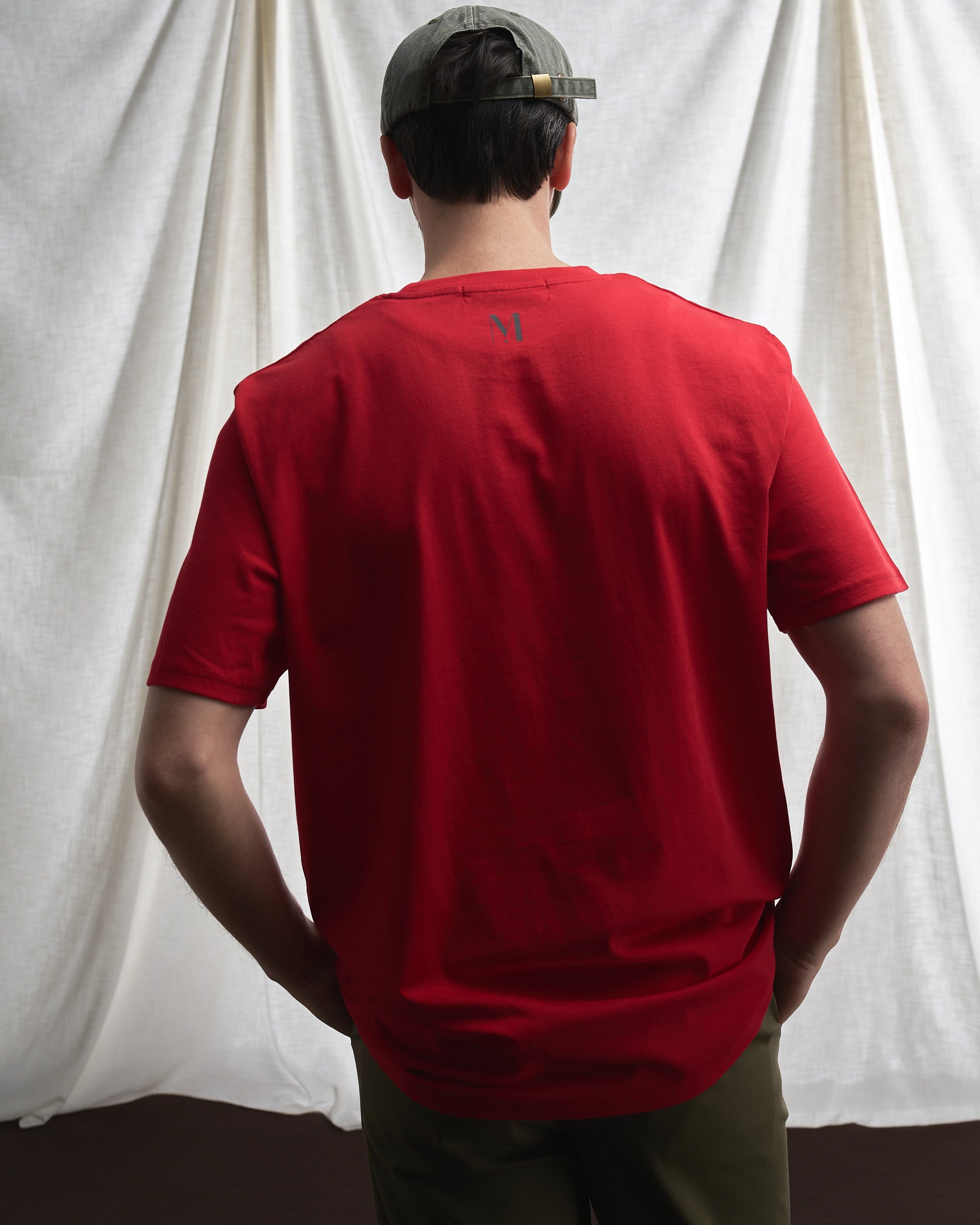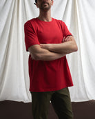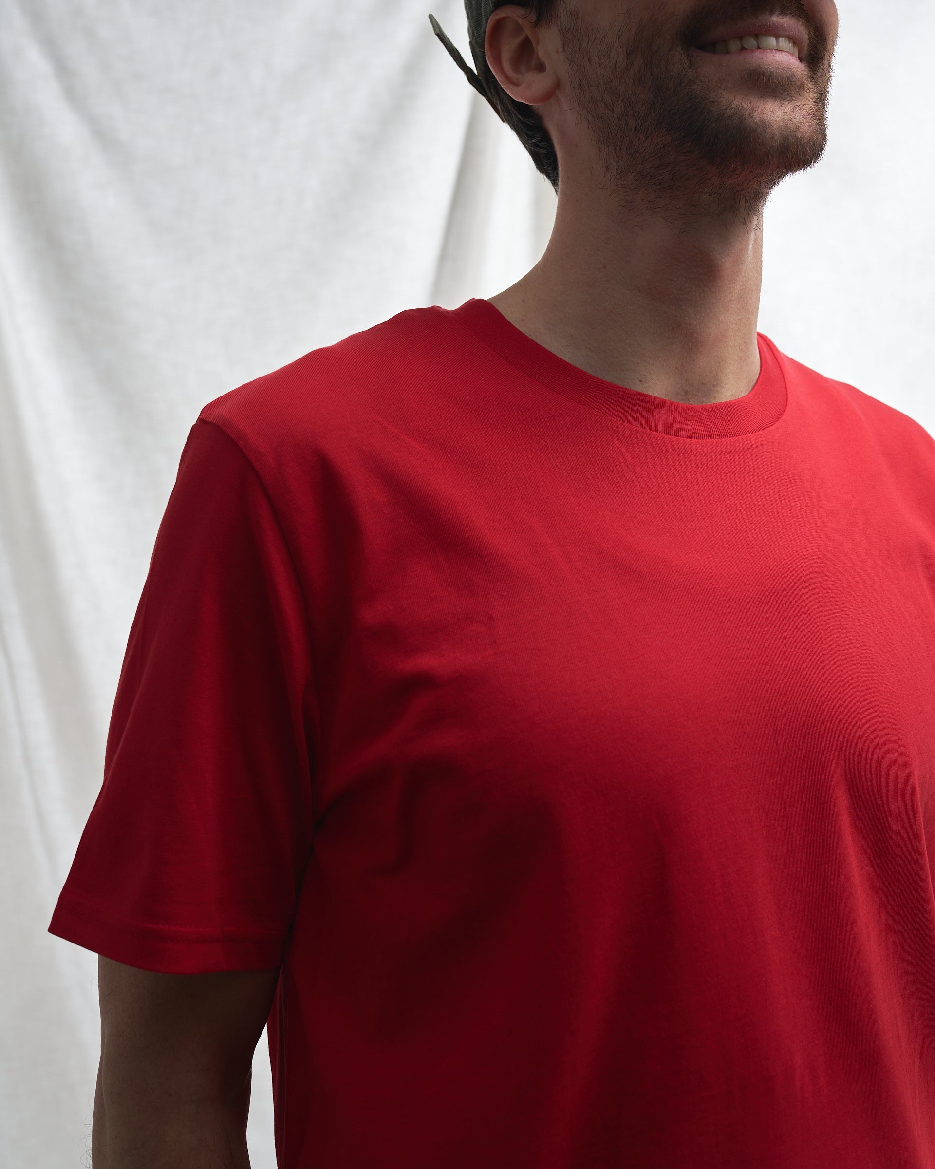 Maniche a giro, fettuccia di rinforzo sull'interno del collo, doppia impuntura larga su fondo manica e bordi inferiori, girocollo a costine.