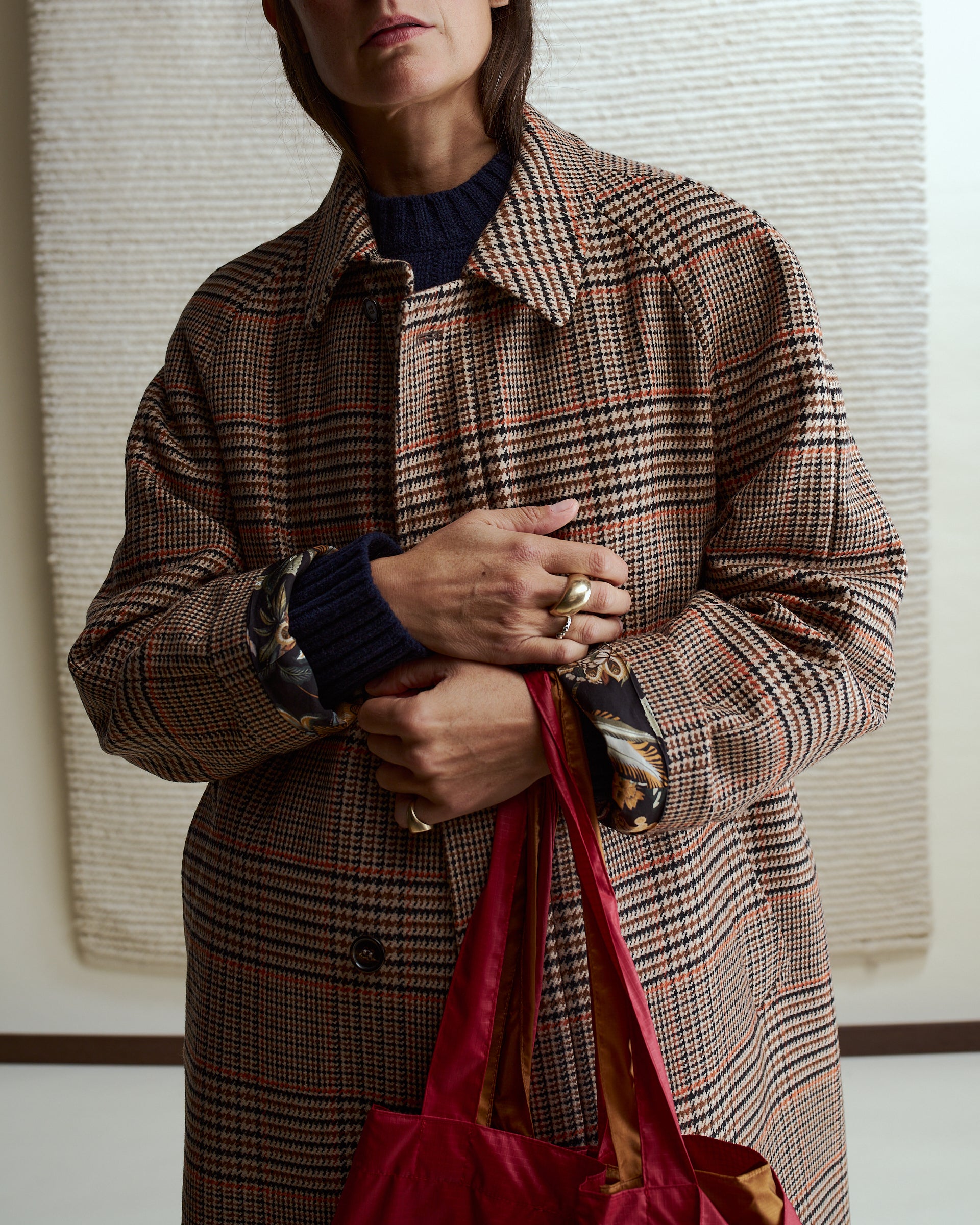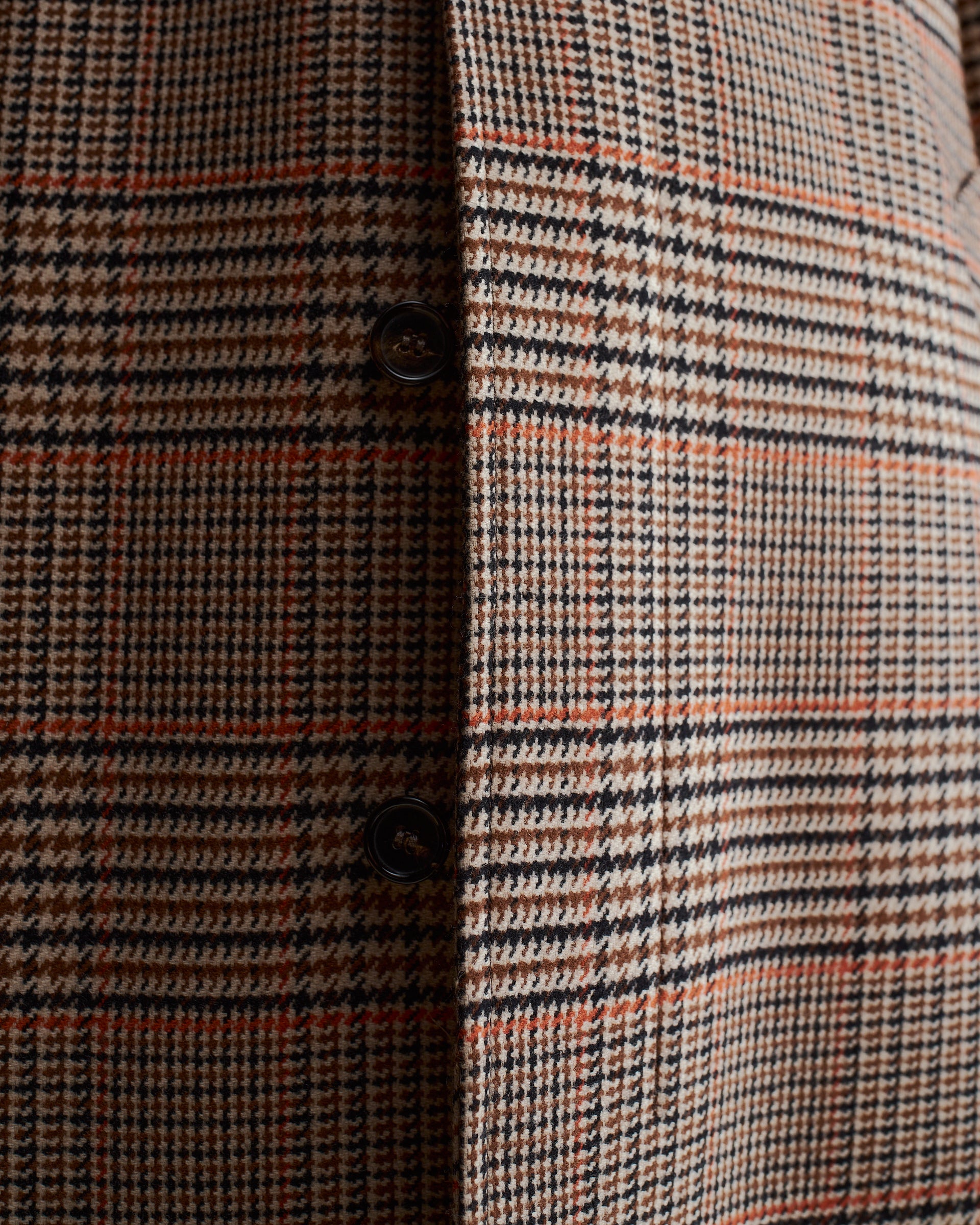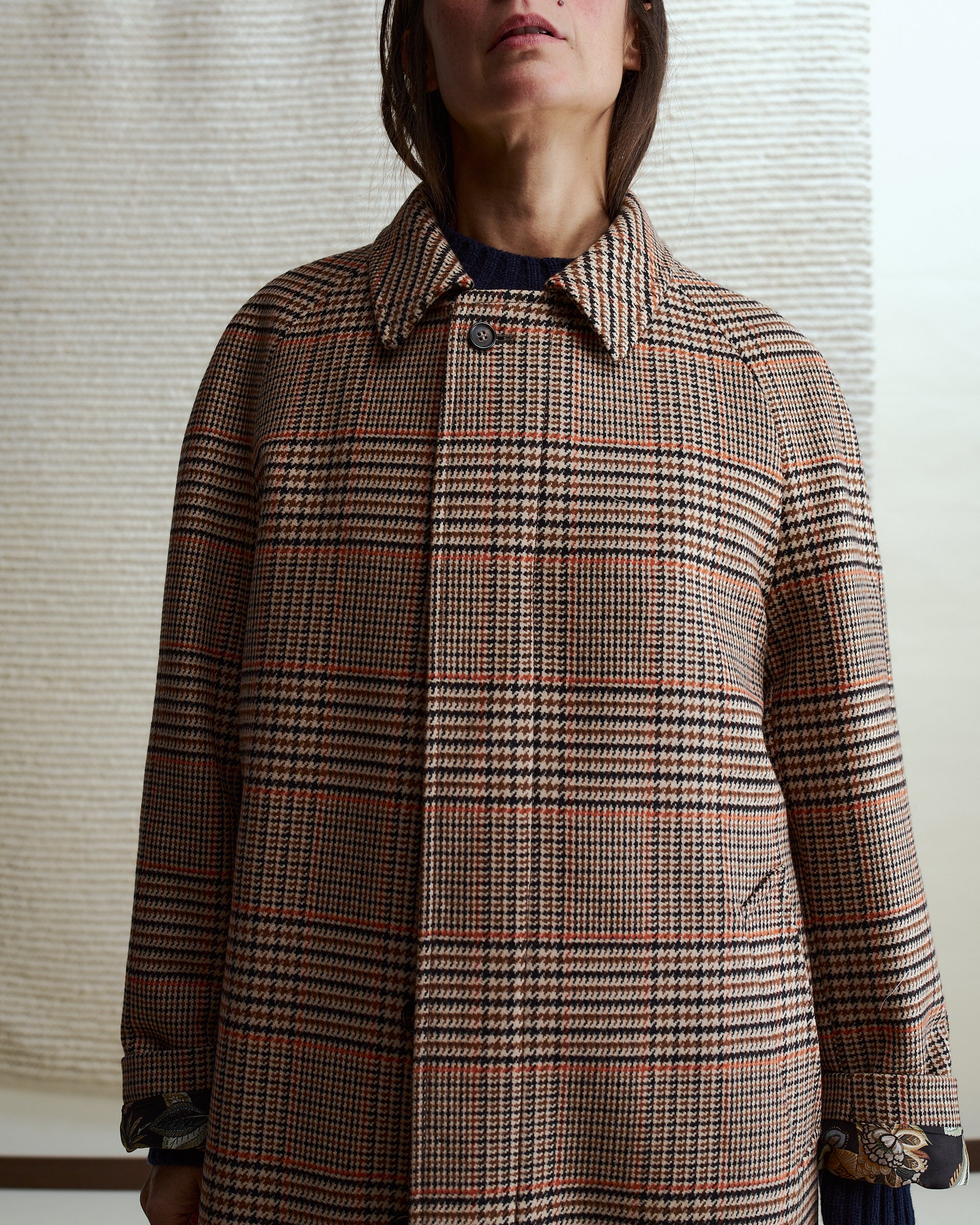 Realizzato in lana spessa, in una classica fantasia check, con fodera in seta fantasia, è un capo classico da portare sia con i look più casual che nelle occasioni più eleganti.