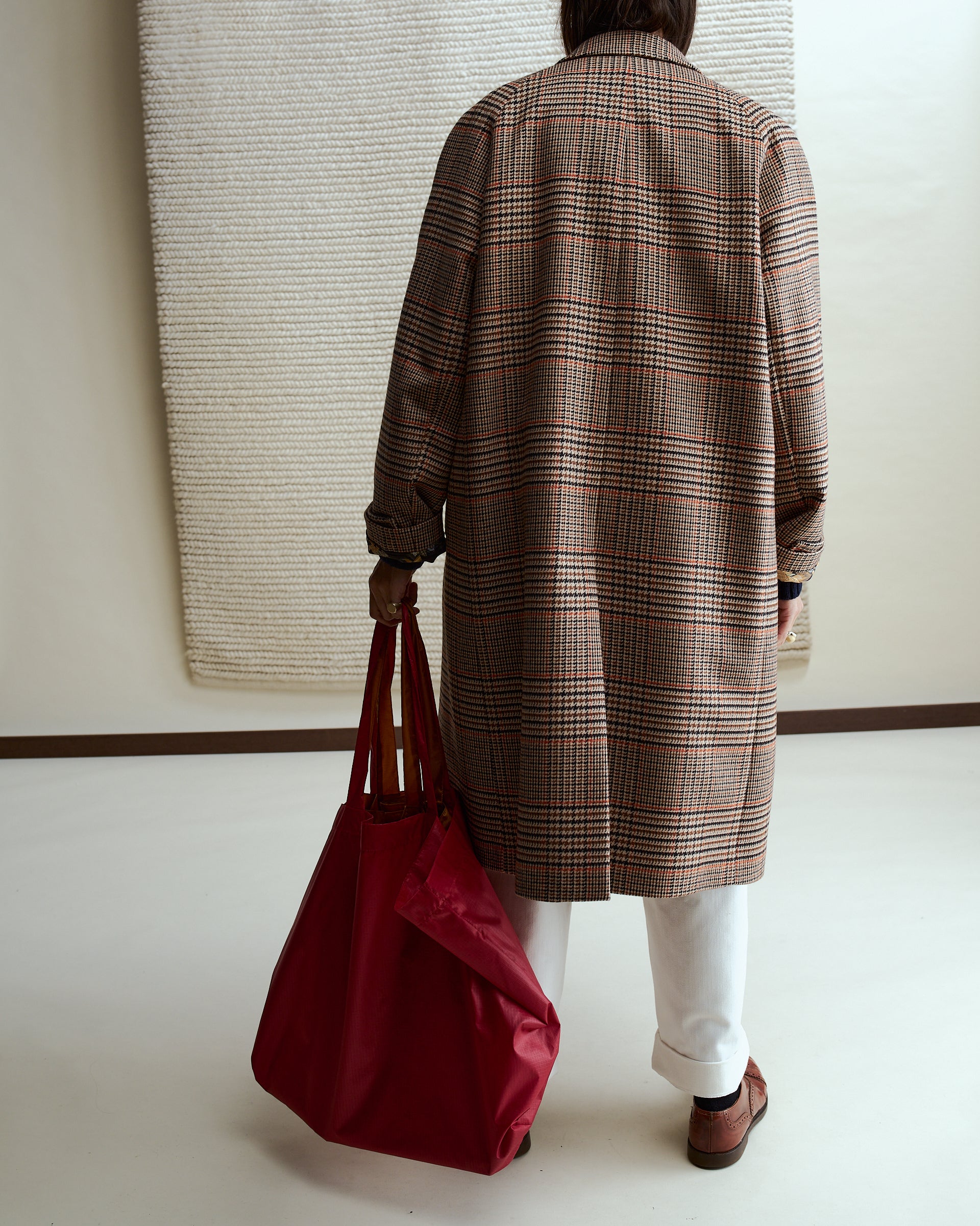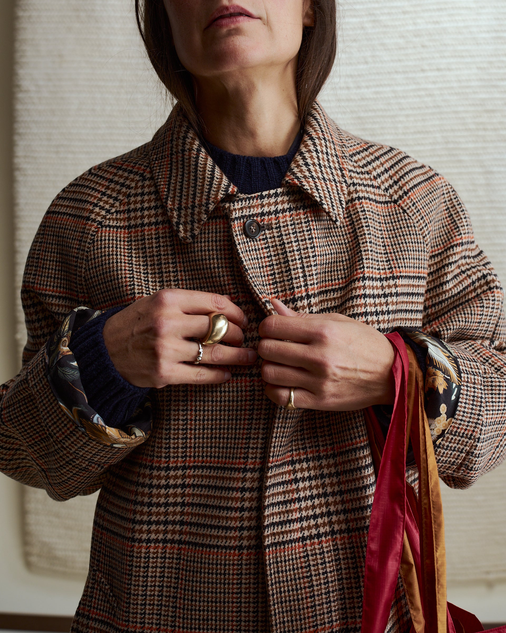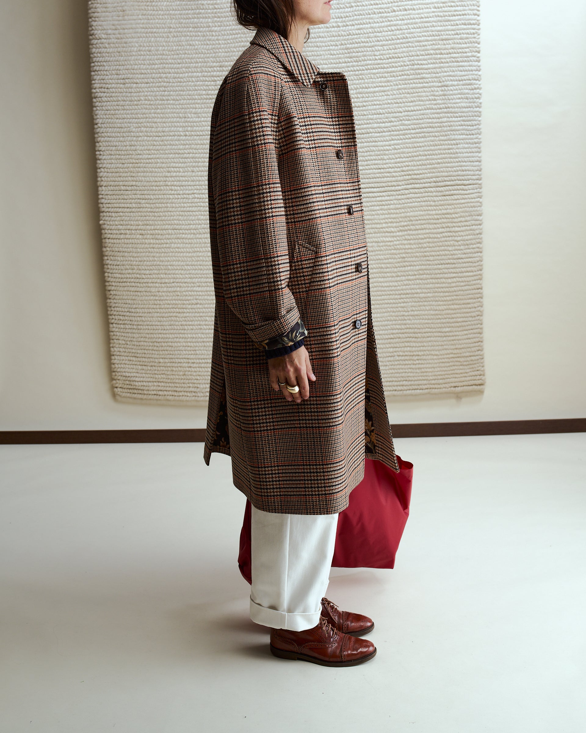 Realizzato in lana spessa, in una classica fantasia check, con fodera in seta fantasia, è un capo classico da portare sia con i look più casual che nelle occasioni più eleganti.