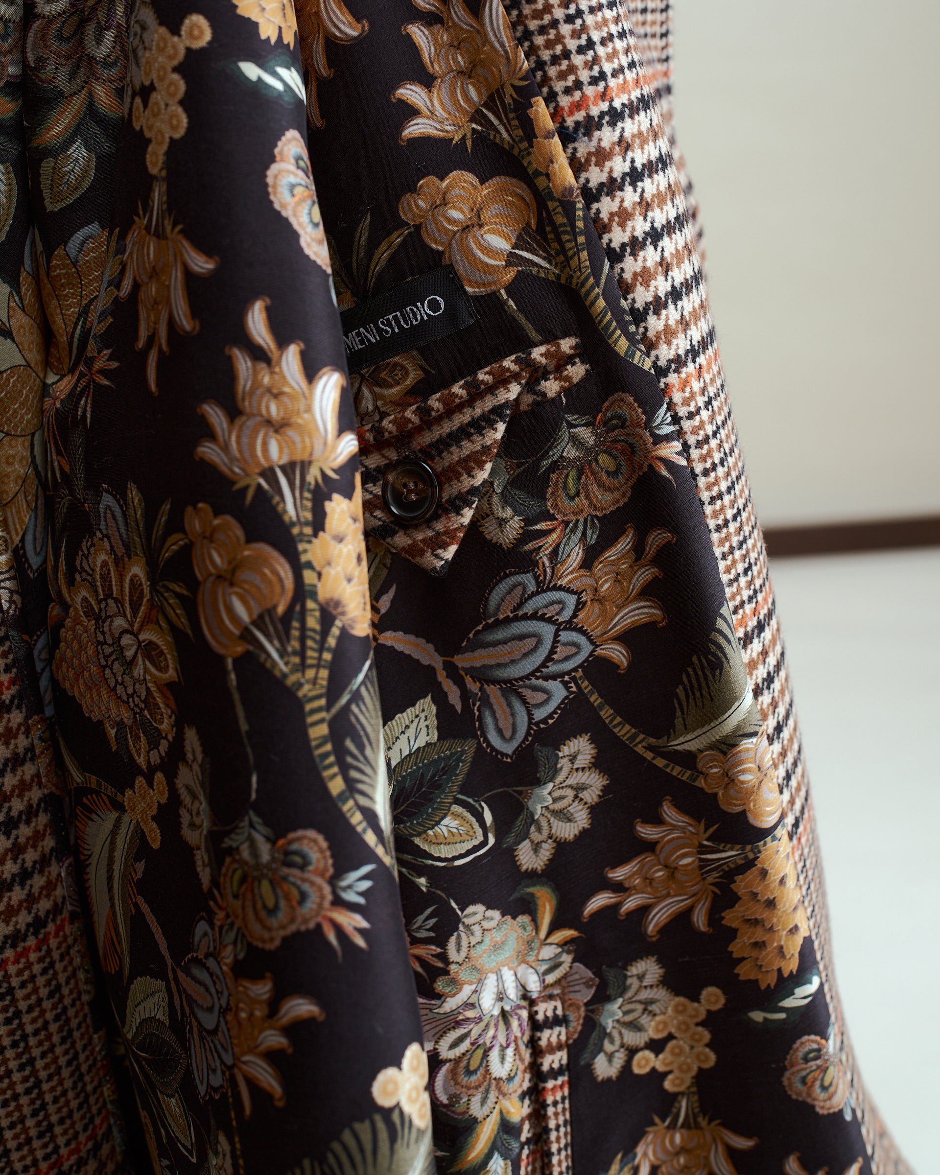 Ad impreziosire il capo ci sono poi i fantastici tessuti con cui è interamente foderato l’interno, e il taschino interno con bottone, ad altezza del cuore.