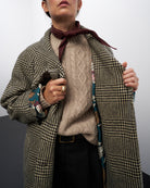 Realizzato in un bellissimo tessuto italiano in misto lana, in un pattern spigato sui toni del marrone, interamente foderato con una preziosa seta a fiori.